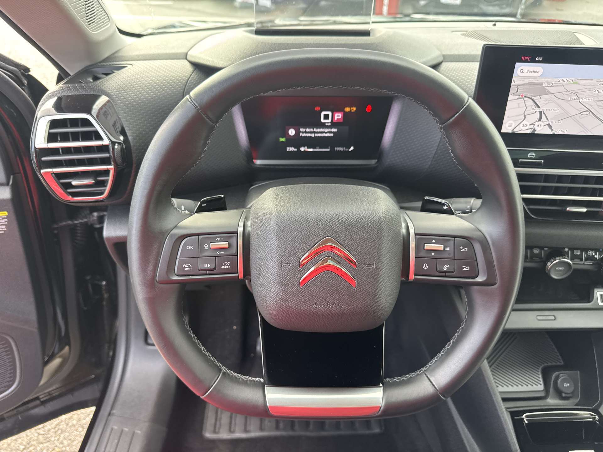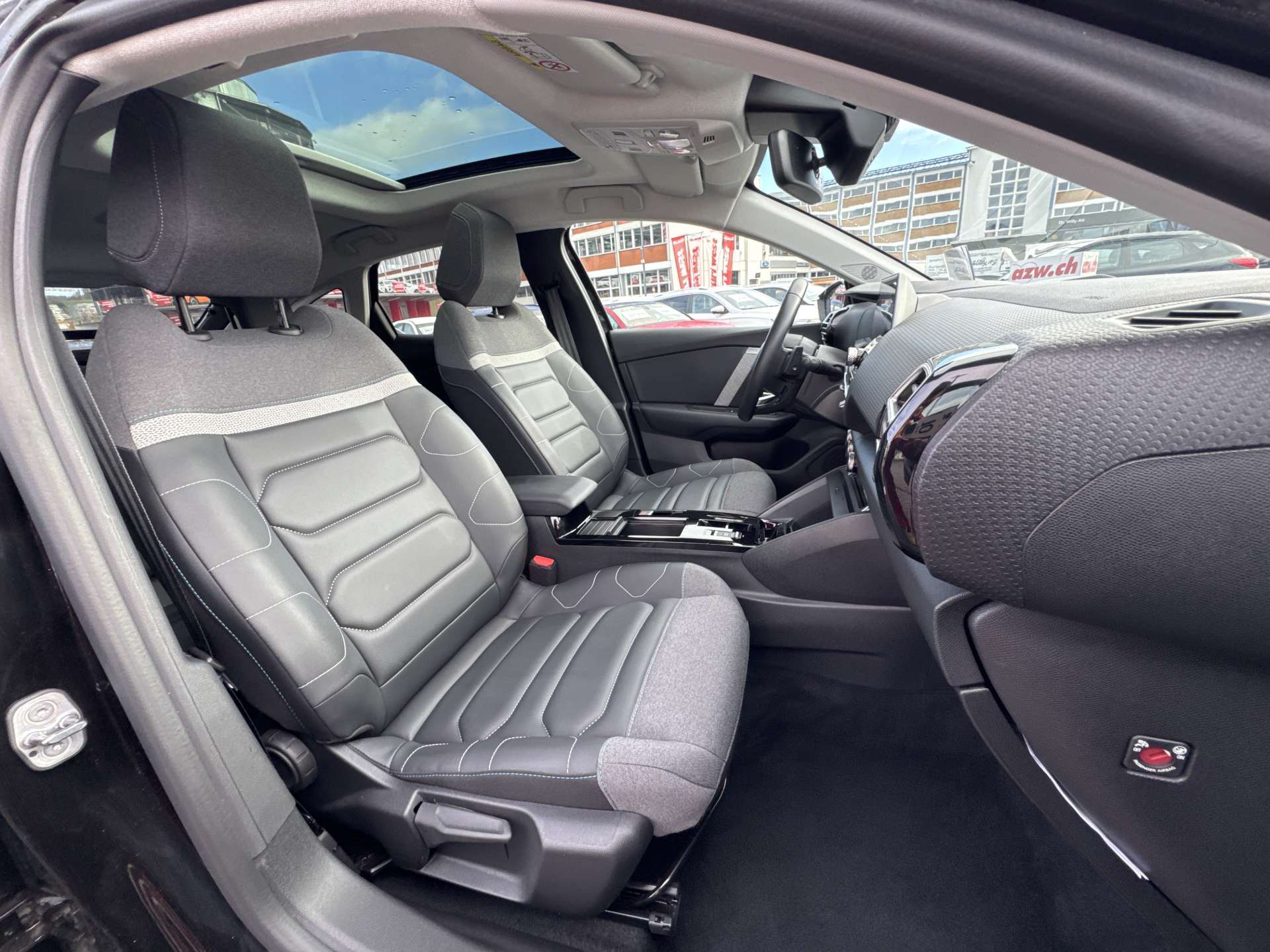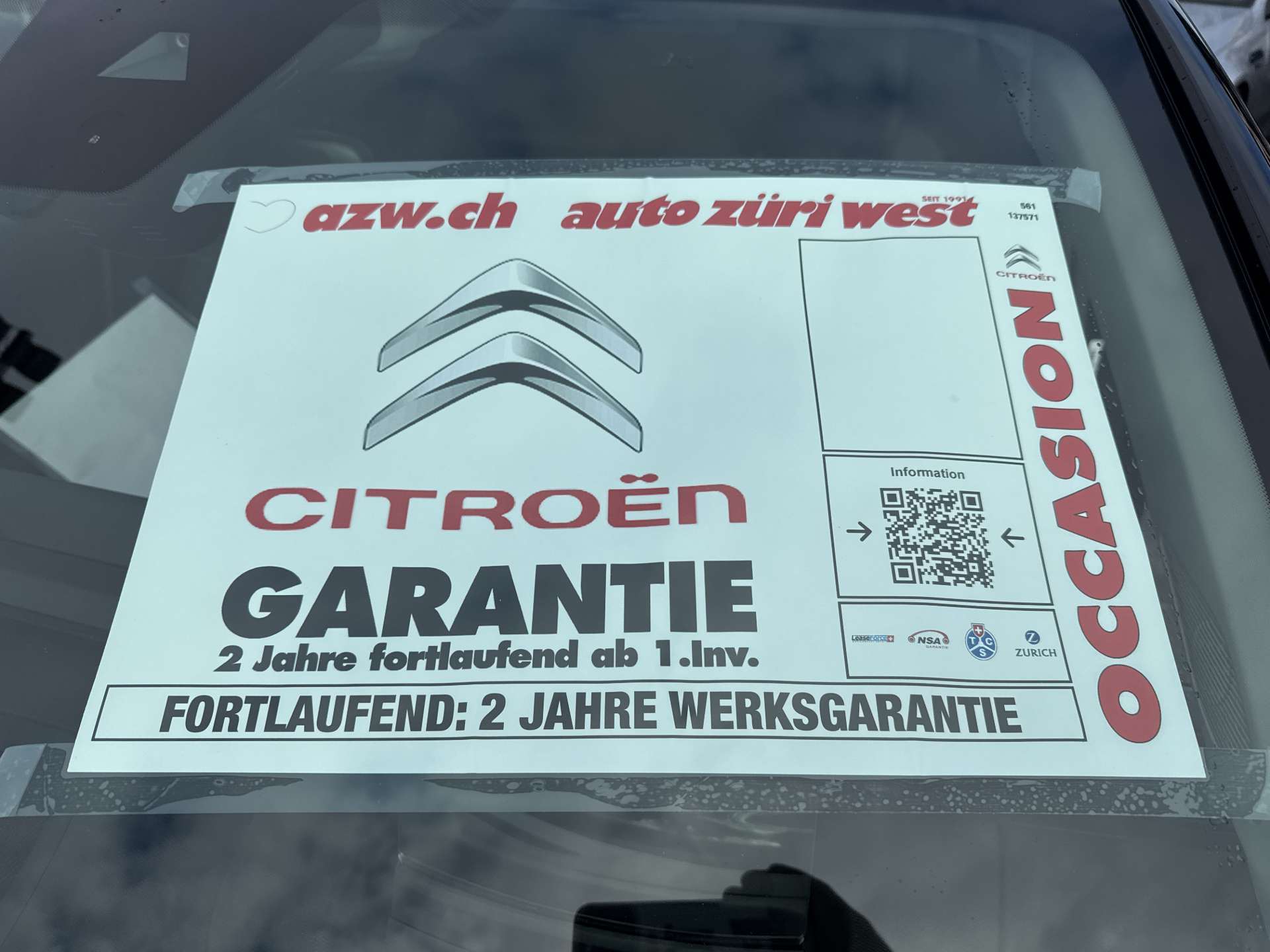 Airbag: Airbag Fahrer und Beifahrer, Airbag: Seitenairbag für Fahrer und Beifahrer, Antiblockiersystem (ABS), Armlehnen vorne, Assist: Active Safety Brake, Assist: Adaptive Geschwindigkeitsregelanlage mit Stop&Go, Assist: Coffee Break Alert, Assist: Einparkhilfe hinten, Assist: Einparkhilfe vorn und seitwärts, Assist: Elektrische Parkbremse, Assist: Kollisionswarnung, Assist: Rückfahrkamera, Assist: Spurassistent, Assist: Totwinkel-Assistent, Assist: Verkehrsschild-Erkennungssystem, Aussenspiegel elektrisch einklappbar, Aussenspiegel rechts und links beheizbar und elektrisch verstellbar, Elektrische Fensterheber mit Komfortschaltung, Elektronisches Stabilitäts-Programm (ESP), Fahrwerk: Federung mit progressivem hydraulischem Anschlag, Garantie: Citroën Garantie 12 Jahre gegen Karosserie-Durchrostung, Garantie: Citroën Garantie 3 Jahre oder 100'000 km (ab 1.Inv.), Getriebe: 8-Stufen-Automat sequentiell, Head-Up Display, Hintere Seitenscheiben und Heckscheibe dunkel getönt, Innenspiegel automatisch abblendbar, Klima: Automatische Zweizonen-Klimaanlage, Kofferaumboden verstellbar, Lenkrad: Lederlenkrad, Lenkrad: Lederlenkrad mit Bedienelementen für Radio, Lenkrad: Lenkrad längs- und höhenverstellbar, Licht: 3D-LED-Rückleuchten, Licht: Automatische Fahrlichteinschaltung, Licht: Automatisches Fernlicht, Licht: Drittes Bremslicht, Licht: LED Scheinwerfer, Licht: LED-Nebelscheinwerfer mit statischem Abbiegelicht, Licht: LED-Tagfahrleuchten vorn, Licht: Nebelschlussleuchte, Media: CITROEN Connect Nav, Media: Citroën Connect Radio und DAB auf 10''-Touchscreen, Paket: Farbpaket Glossy Silver, Polster: AMBIENTE METROPOLITAN GREY, Proximity Schlüsselloser Zugang und Start, Räder: 18''-Alufelgen Aeroblade diamantgeschliffen, Räder: Reifenreparatur-Set (Tire Fit), Scheibenwischer vorne mit Regensensor, Servolenkung, Sitze: Armlehnen hinten und Durchlade für Skis, Sitze: Kopfstützen auf allen plätzen, Sitze: Rücksitzbank im Verhältnis 2/3 - 1/3 teilbar, Sitze: Taschen an den Rückenlehnen der Vordersitze, Sitze: Vordersitze höhenverstellbar, Smart Pad Support Citroën, Traktionskontrolle, Türen: Türgriffe in Wagenfarbe, Verchromte Zierleisten für Seitenscheiben, Zentralverriegelung mit Fernbedienung