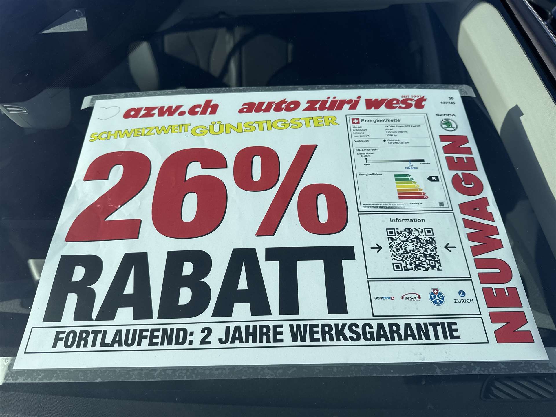 Ablagekästen im Kofferraum, AC Batterieladung bis 11 kW, Airbag: Airbag Beifahrer deaktivierbar, Airbag: Airbag Fahrer und Beifahrer, Airbag: Kopf-, Seiten- und Zentralairbag vorne (zwischen Fahrer- und Beifahrersitz), Akustikpaket, Allradantrieb permanent, Ambiente- und Fussraumbeleuchtung, Assist: Ablenkungs- und Müdigkeitserkennung, Assist: Adaptive Geschwindigkeitsregelanlage "Adaptive Cruise Control", Assist: Fahrassistent "Travel Assist", Assist: Insassenschutzsystem "Crew Protect Assistant" vorne, Assist: Notbremsassistent "Front Assist", Assist: Notrufsystem Emergency-Call, Assist: Parksensoren vorne und hinten, Assist: Regensensor mit Lichtassistent (Coming Home, Leaving Home, Tunnel Light), Assist: Rückfahrkamera, Assist: Spurhalteassistent "Lane Assist", Assist: Spurwechselassistent "Side Assist", Assist: Verkehrszeichenerkennung, Aussenspiegel elektrisch einstell- und beheizbar, Boardwerkzeug und Reifenreparaturset, Dachreling silber, DC Batterieladung bis 175 kW, Design Selection Loft, Diebstahlalarmanlage, Innenraumüberwachung, Back-Up-Horn und Abschleppschutz, Elektrische Fensterheber vorne + hinten, Elektrische Kindersicherung, ESC (Elektronische Stabilisierungskontrolle) mit Multikollisionsbremse, ABS und ASR, Fahrprofilauswahl- "Driving Mode Selection", Frontscheibe in Wärmeschutzglas mit Akustikfolie, Getriebe: 1-Gang Getriebe, Heckklappe mit berührungsloser Öffnung "Virtual Pedal", Innenspiegel automatisch abblendbar, Klima: Klimaanlage "Climatronic", 3-Zonen-Temperaturregelung, vollautomatisch, getrennt regelbar, Kofferraumabdeckung, herausnehmbar, Kühlerschutzgitter mit Leiste in Unique Dark Chrom (UDC, Lackierung: Uni-Lackierung, Ladekabel für AC-Normalladen bis zu 11 kW, Typ2-Stecker, Lenkrad: 2-Speichen-Leder-Multifunktionslenkrad, beheizbar, Licht: Basis LED Frontscheinwerfer inkl. LED Tagfahrlicht, Licht: LED Rückleuchten, Licht: Leuchtweitenregulierung manuell, Media: 8 Lautsprecher, Media: DAB+ (Digital Audio Broadcasting), Media: Infotainmentdisplay 13", Media: Navigationsfunktion, Media: SmartLink (CarPlay und Android Auto), Media: Sprachsteuerung, Media: Zwei USB-C Anschlüsse vorne und hinten, Mittelkonsole mit Mittelarmlehne, Phonebox und Wireless Charging, Räder: Leichtmetallräder 8,0J x 19" "Proteus", silber lackiert mit Reifenreparaturset, Räder: Reifendruckkontrollsystem, Regenschirm in der Fahrertüre, Schliess- und Startsystem schlüssellos mit Safelock "Kessy Advanced" (Keyless Access), Servolenkung, geschwindigkeitsabhängig (Servotronic), Sitze: 3 Kopfstützen hinten, Sitze: Komfortsitze, Sitze: Lendenwirbelstütze manuell einstellbar für Vordersitze, Sitze: Rücksitzbank ungeteilt, Rücksitzlehne geteilt umklappbar, Sitze: Vorbereitung für Kindersitzhalterung mit Sicherheitssystem ISOFIX auf dem Beifahrersitz, Sitze: Vordersitze heizbar, Sitze: Vordersitze höhenverstellbar (manuell), SKODA Garantie: Anschlussgarantie 2+1 Jahre (total 3 Jahre), max. 100.000 km, SKODA Garantie: Garantie 12 Jahre gegen Durchrostungs (ab 1. Inv.), SKODA Garantie: Garantie 3 Jahre gegen Lackschäden (ab 1. Inv.), SKODA Garantie: Garantie 8 Jahre oder 160’000 km Garantie auf HV-Batterie, SKODA Garantie: Neuwagen-Garantie: 2 Jahre ohne Kilometerbegrenzung, Steckdose 12V im Kofferraum, Stossfänger vorne und hinten im Standarddesign, Textilfussmatten, Vorbereitung für Anhängerkupplung, Wärmepumpe, Zentralverriegelung mit Fernbedienung, Zierleisten in UDC (Umrandung der Seitenscheiben mit Unique Dark Chrome Leisten)
