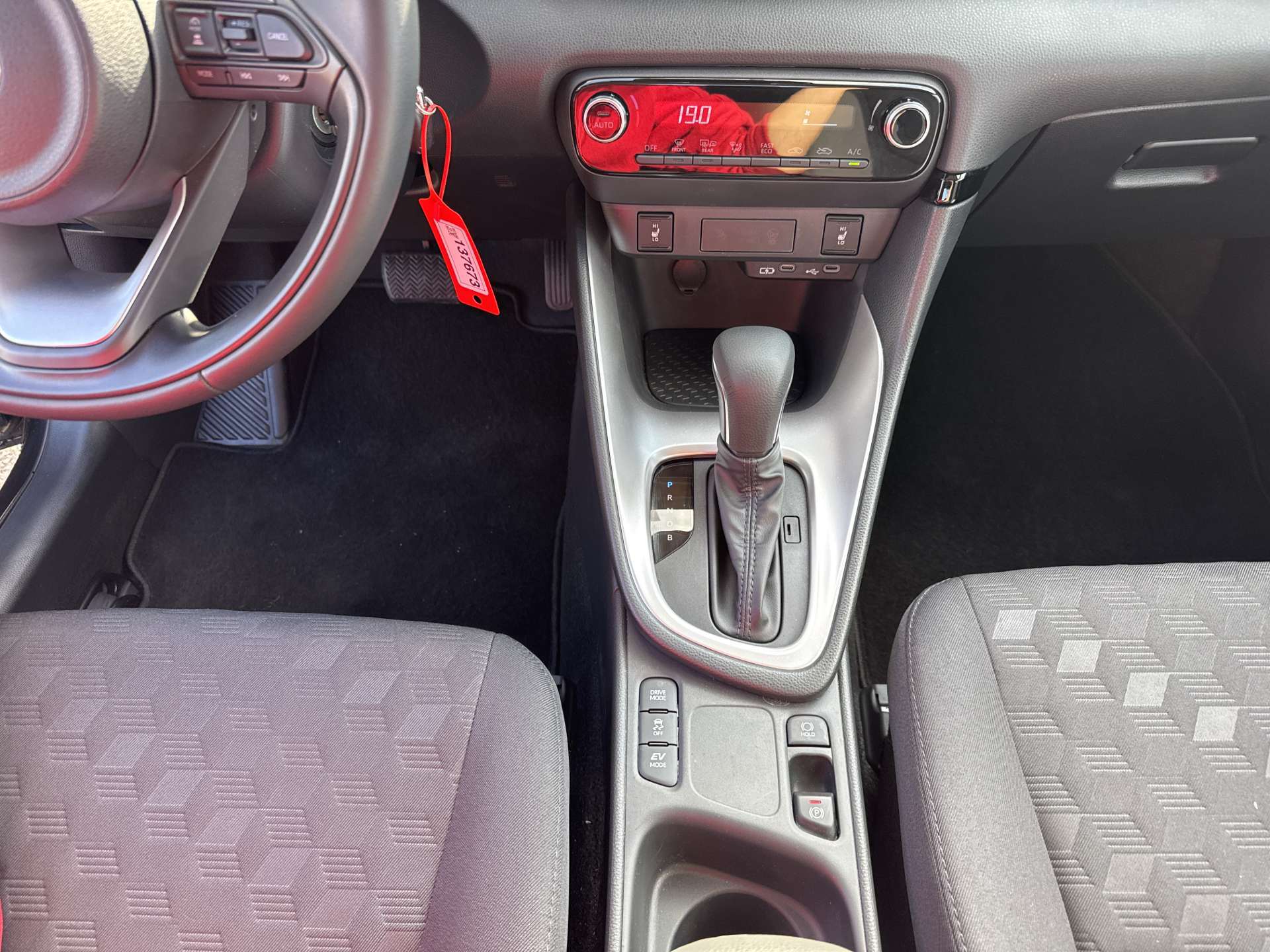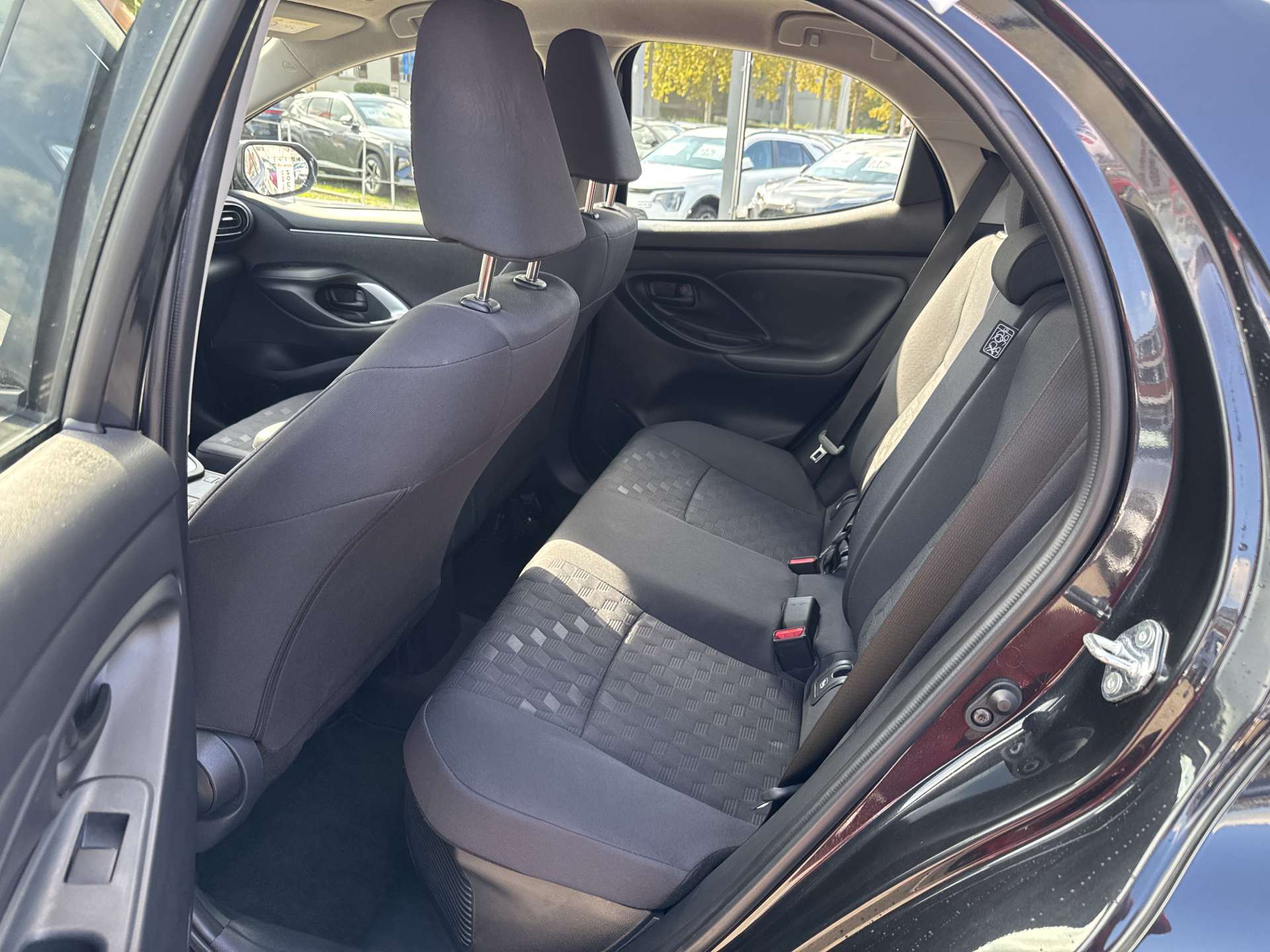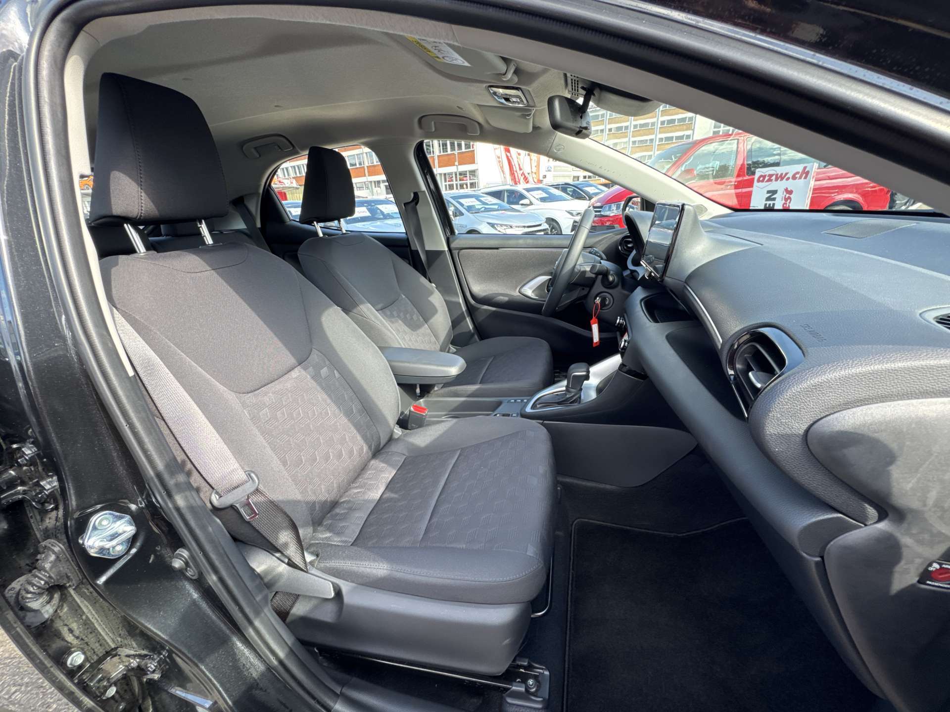 ABS, Airbag: Airbag Fahrer und Beifahrer, Airbag: Airbag Mitte Vorn, Airbag: Seitenairbag hinten, Airbag: Seitenairbags vorne, Assist: Adaptive Geschwindigkeitsautomatik, Assist: Aufmerksamkeitswarner, Assist: Dynamische Stabilitätskontrolle und Traktionskontrolle, Assist: Elektronische Parkbremse mit Auto-Hold-Funktion und Berganfahrhilfe, Assist: Geschwindigkeitsbegrenzer, Assist: Kreuzungs-Notbremsassistent mit Fussgängererkennung, Assist: Notbremsassistent mit Fussgänger- und Fahrraderkennung, Assist: Notfall-Lenkunterstützung mit Fussgängererkennung, Assist: Rückfahrkamera, Assist: Spurhalteassistent LAS (Lane-keep Assist System) mit aktiver Lenkunterstützung, Assist: Stauassistent mit Stop & Go-Funktion, Assist: Verkehrszeichenerkennung (TSR, Traffic Sign Recognition), Aussenspiegel elektrisch verstellbar und beheizbar, Aussenspiegel in Brilliant Black, Automatikwählhebel mit Position B, für eine erhöhte Motorbremswirkung, Bordcomputer, Dachheckspoiler, Drive Mode-Taste mit 3 Modi: Standard, Power und Eco, eCall, Elektrische Fensterheber vorn und hinten mit Automatikfunktion, EV Mode-Taste, für kurzzeitiges rein elektrisches Fahren, Full-Hybrid-Antrieb mit Benzinmotor und Elektromotor, Getriebe: e-CVT-Getriebe, Hybridsystemindikator, Intelligentes Stopp-Start-System, Klima: Klimaautomatik, Kosmetikspiegel auf Beifahrerseite, Kosmetikspiegel auf Fahrerseite, Kühlergrill in Brilliant Black, Lackierung: Uni-Lackierung, Lederlenkrad und -schaltknauf, Lenkrad: Lenkrad längs- und höhenverstellbar, Lenkrad: Multifunktionslenkrad, Licht: Fernlichtautomatik, Licht: LED-Rückleuchten, Licht: Lichtautomatik, Licht: Nebelscheinwerfer, Media: 6 Lautsprecher, Media: 9"-Touchscreen-Farbmonitor, Media: Apple CarPlay wireless und Android Auto wireless, Media: Audiosystem mit DAB+-Radio, USB-C und 12-V-Anschluss, Media: Bluetooth für Smartphones und Audiogeräte, Media: Instrumentenanzeige analog, Mittelarmlehne vorne mit Ablagefach, Polster: Stoffsitze in Schwarz, Räder: Leichtmetallfelgen 15" Farbe Silver, Räder: Reifendruckkontrollsystem, Räder: Reifenreparatur-Set (Tire Fit), Scheibenwischer mit Regensensor, Servolenkung, Shark-Fin-Antenne in Wagenfarbe, Sitze: Fahrersitz höhenverstellbar, Sitze: Rücksitzlehnen getrennt abklappbar 60:40, Sitze: Vordersitze heizbar, Zentralverriegelung mit Fernbedienung
