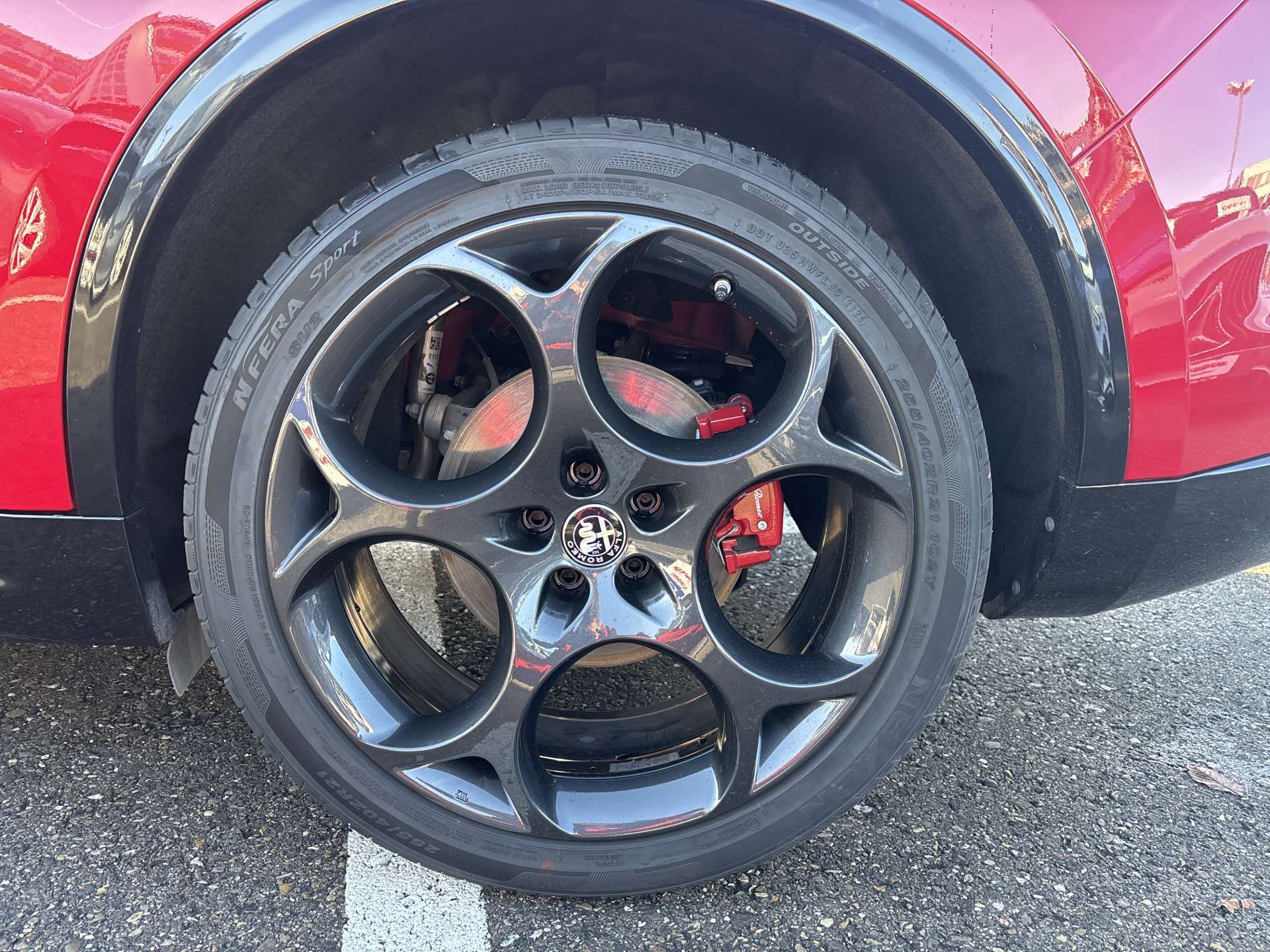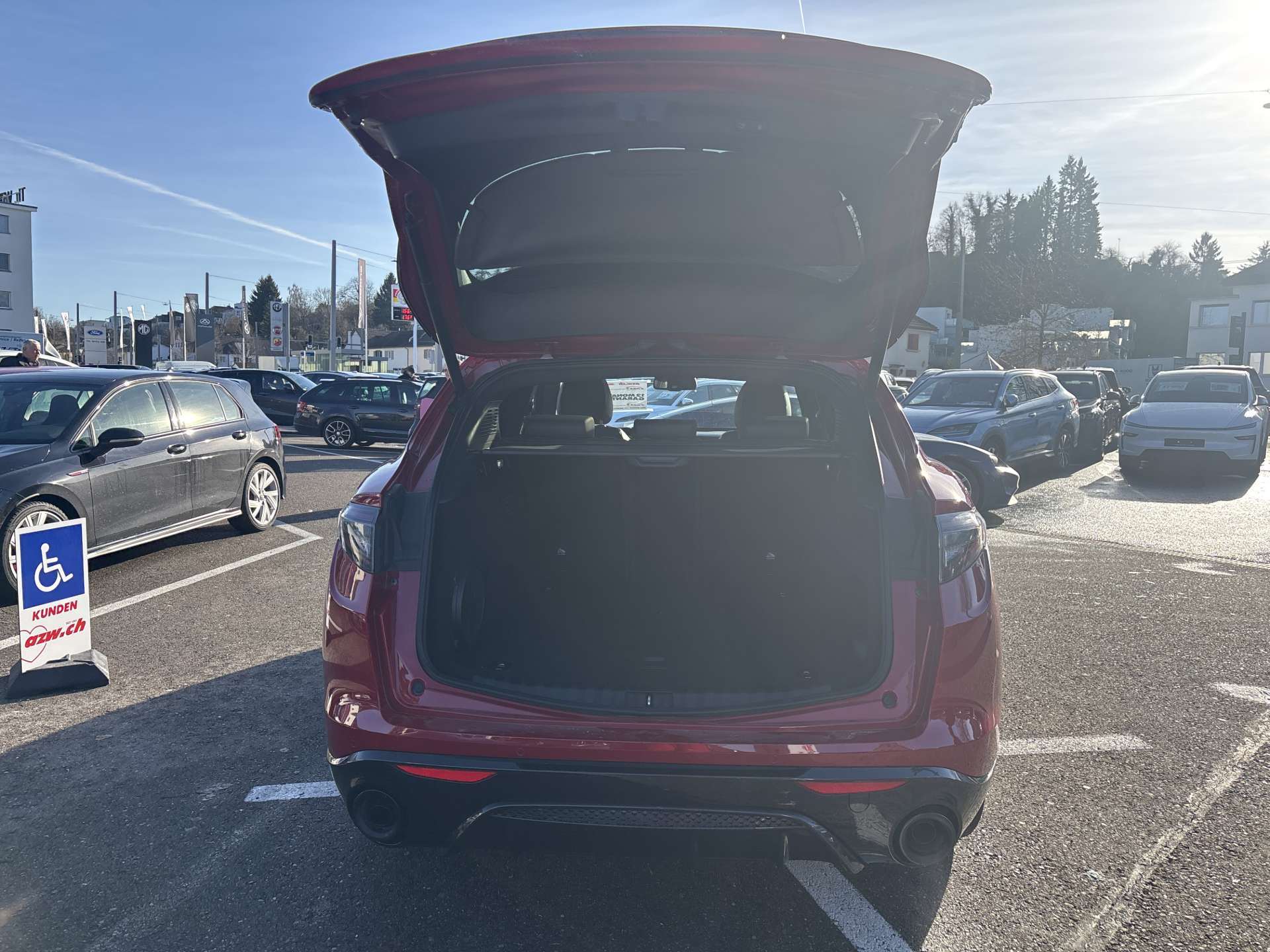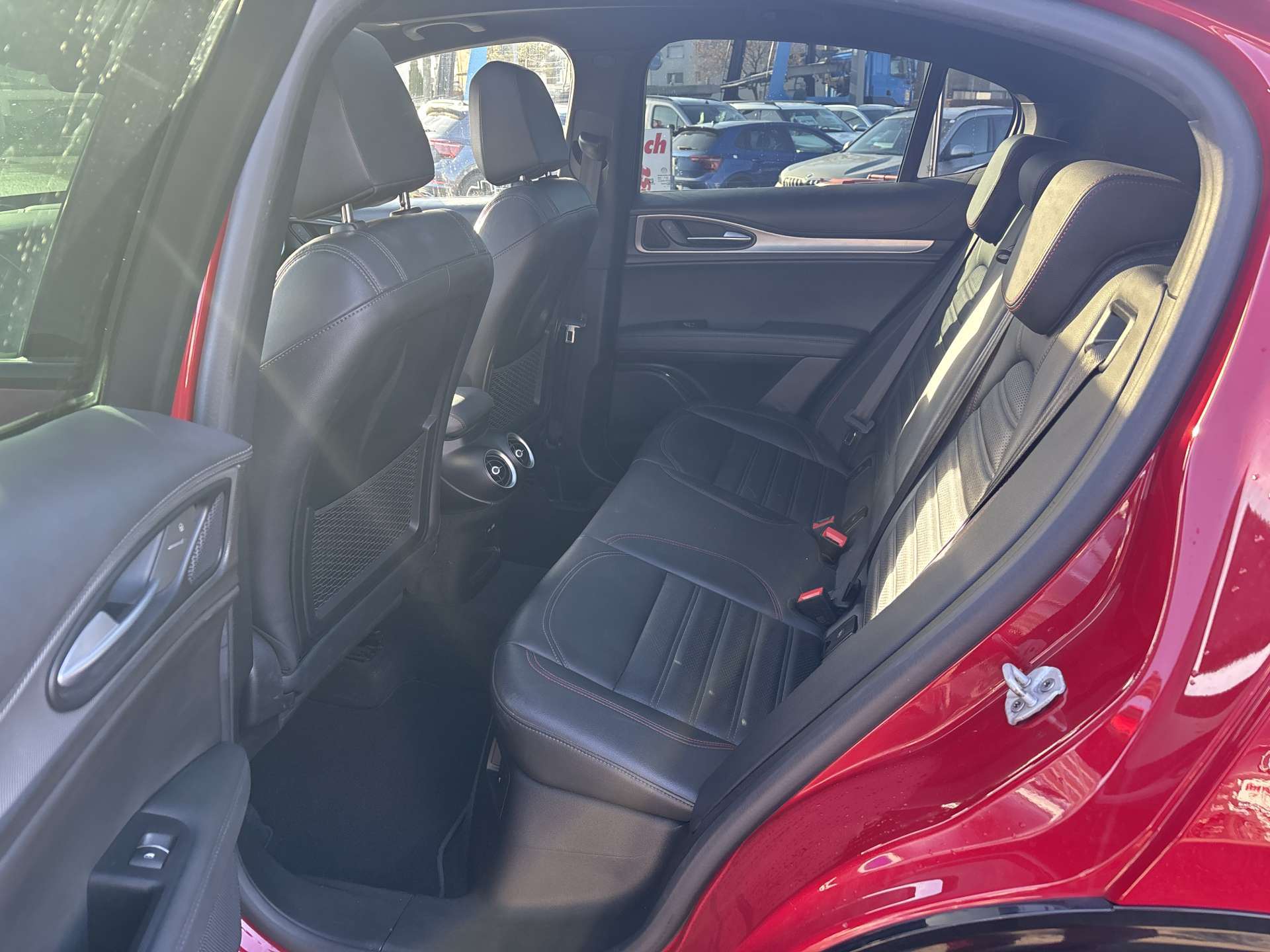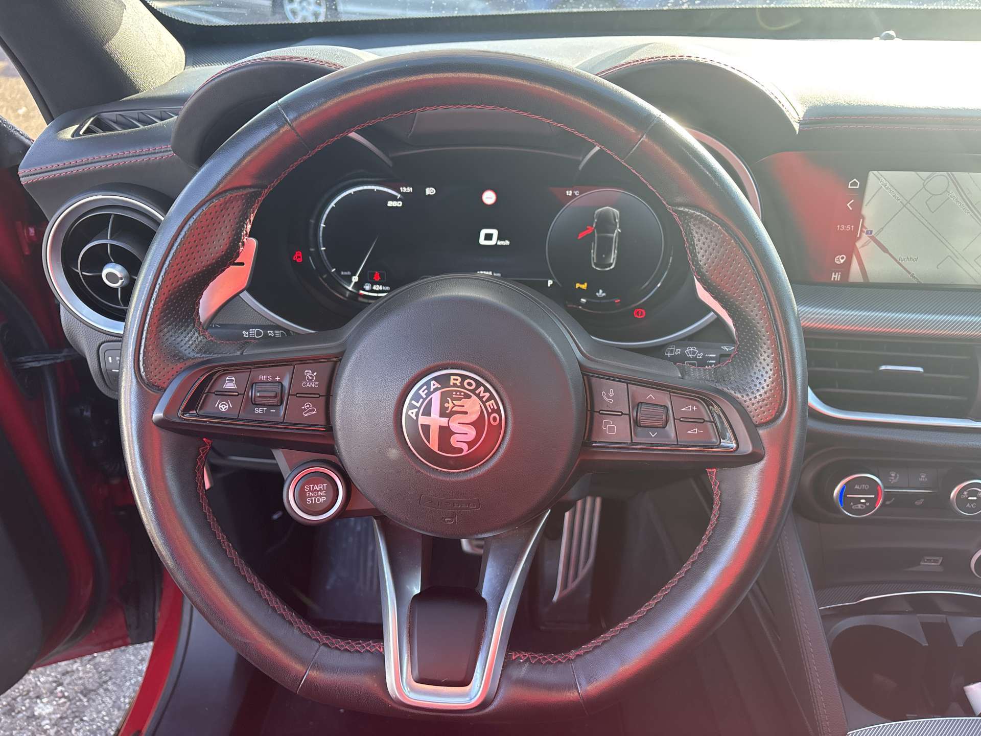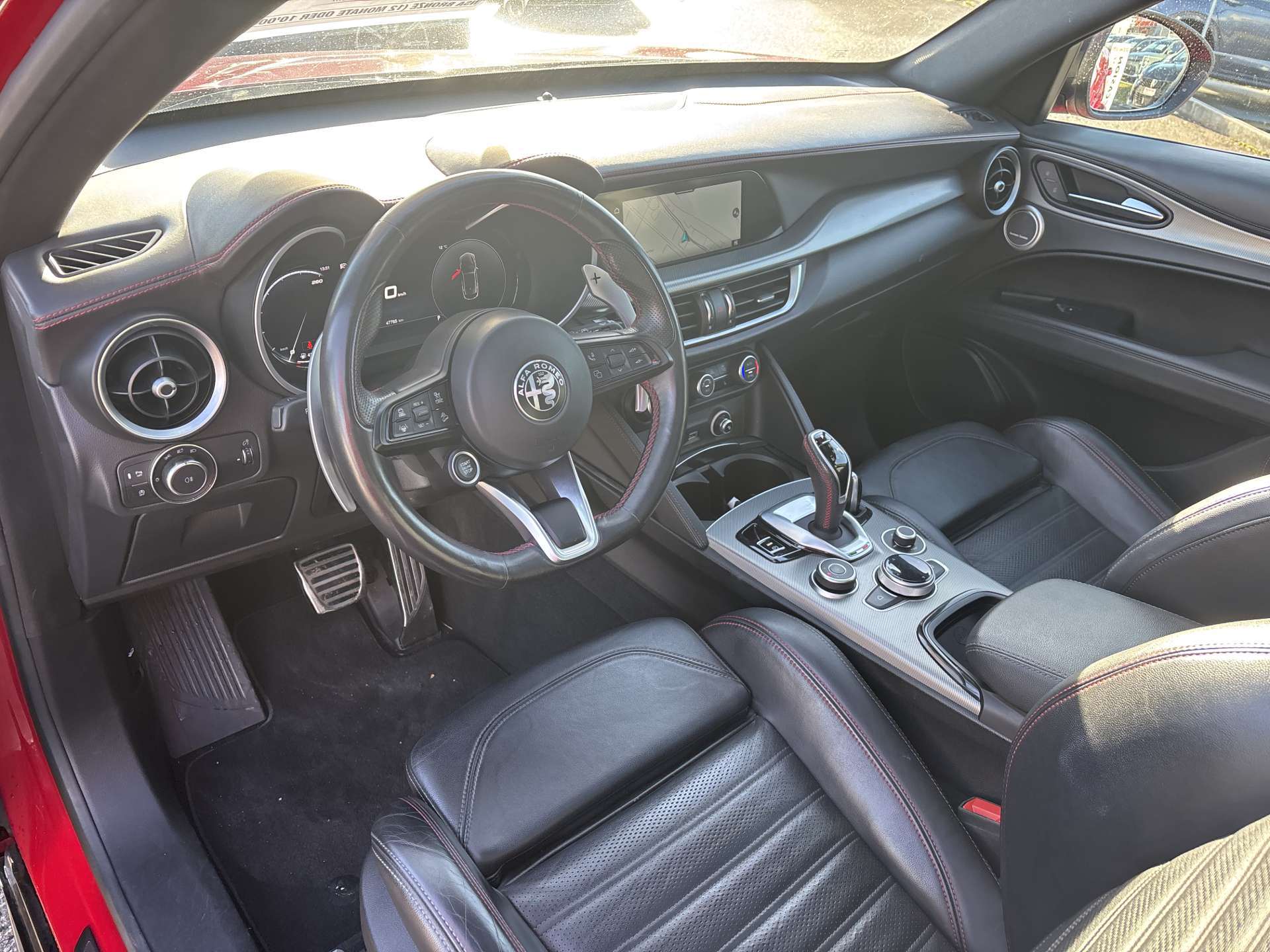 12 Volt-Steckdose im Laderaum, 230V/50Hz Zusatzsteckdose im Kofferaum, 3-Punkt-Sicherheitsgurte auf allen Plätzen, ABS, Air Quality System (AQS), Airbag: Airbag Beifahrer deaktivierbar, Airbag: Airbag Fahrer und Beifahrer, Airbag: Seitenairbag für Fahrer und Beifahrer, Airbag: Window-Kopfairbags, Alfa Romeo Fussmatten vorne/hinten, Armaturenbrett aus Leder, Assist: Adaptiver Tempomat mit Stoppfunktion, Assist: Aktiver Totwinkel-Assistent, Assist: Aufmerksamkeitsassistent, Assist: Autonome Notbremsung (AEB), Assist: Highway Assist System (HAS) Autobahn Assistent, Assist: Intelligente Geschwindigkeitskontrolle mit Erkennung von Strassenbegrenzungen, Assist: Intelligente Verkehrszeichenerkennung, Assist: Parksensoren vorne und hinten, Assist: Passiver Spurhalteassistent, Assist: Rückfahrkamera, Assist: Traffic Jam Assist, Auspuffendrohre Matt-dunkle, Aussenspiegel elektrisch einklappbar, Aussenspiegel in schwarz, Beleuchtete Türgriffe, Body-Kit in Aussenfarbe, Bordcomputer, Bremssättel rot lackiert, Dachhimmel schwarz, Dekor: Badge Competizione, Dekor: Schwarzglänzende Fensterrahmen, Drehzahlmesser, Elektrische Heckklappe, sensorgesteuert, Elektrische Servolenkung mit Dynamic Steering Torque, Elektrisches Panorama-Schiebedach, Elektronisches Stabilitäts-Programm, Fahrwerk: Alfa Active Suspension Fahrwerk mit elektronischer Stossdämpferregelung, Fahrwerk: Alfa Romeo D.N.A - Fahrdynamikregelung, Fahrwerk: Allradantrieb Alfa Q4 Verteilergetriebe, Fahrwerk: Antriebswelle aus Kohlefaser, Fahrwerk: Differenzialsperre, Garantie: 3 Jahre Lackgarantie, Garantie: 5 Jahre / 200 000 km Vollgarantie Alfa Romeo auf Teile und Arbeit, Garantie: 5 Jahre Swiss Free Service oder 100'000 km, Garantie: 8 Jahre Antikorrosions-Garantie, Getriebe: 8-Stufen-Automat sequentiell, Heckscheiben-Wisch-/Waschanlage, Heckscheibenheizung, Hintere Belüftungsdüsen, Innenspiegel automatisch abblendbar, Katalysator geregelt mit Otto-Partikelfilter, Keyless Entry / -Start, Klima: 2-Zonen-Klimaautomatik, Kofferraum-Abdeckung, Lackierung: Uni-Lackierung, Lenkrad: Lenkrad beheizbar, Lenkrad: Schaltwippen aus Aluminium, Lenkrad: Sport-Lederlenkrad mit schwarzen Nähten und schwarzem Startknopf, Licht: Drittes Bremslicht, Licht: Fernlichtassistent High Beam, Licht: LED Innenbeleuchtung, Licht: Nebelschlussleuchte, Licht: Voll-Matrix-LED-Scheinwerfer mit automatischer adaptiver Ausleuchtung, Media: 8,8" Farbiges Multitouch-Display mit Navigationssystem, Media: Alfa Connect Services, Media: Connected / Android Auto / Apple CarPlay, Media: Harman Kardon Soundsystem, Media: Instrumententafel mit 12,3’’-TFT- anpassbare Farbbildschirm, Media: Kabelloses Apple Car Play / Android Auto, Media: Kabelloses Ladepad, Media: Radio Dab+, Media: USB-Anschlüsse hinten (Typ A/C), Media: USB-C Anschluss im Frontfach mit Lade und Datenfunktion, Media: USB+AUX-Anschluss in Der Armlehne, Polster: Sport-Ledersitze, Räder: 21"-Leichtmetallfelgen QUADRIFOGLIO STYLE DARK, Räder: Reifendruck-Kontrollanzeige, Räder: Reifenreparaturset (Kit Fix&Go), Regen- und Dämmerungssensor, Rücksitzlehne mit 3 Kopfstützen, Schalthebelknauf in Leder, Scheibenwaschdüsen beheizt, Schwellerverkleidung verchromt, Sitze: Beifahrersitz 6-fach elektrisch verstellbar, Sitze: Fahrersitz 6-fach elektrisch verstellbar, Sitze: Kopfstützen hinten, Sitze: Kopfstützen vorne höhenverstellbar, Sitze: Umklappbare Rücksitzbank im Verhältnis 40 / 20 / 40, Sitze: Vordersitze heizbar, Sonnenblende Fahrer und Beifahrerseite mit beleuchtetem Spiegel, Sportpedale in Aluminium inkl. Fussstütze, Start/Stop-Funktion, V-Grill "Scudetto" in Anthrazit, Veloce Unterfahrschutz, Wegfahrsperre elektronisch, Zentralverriegelung