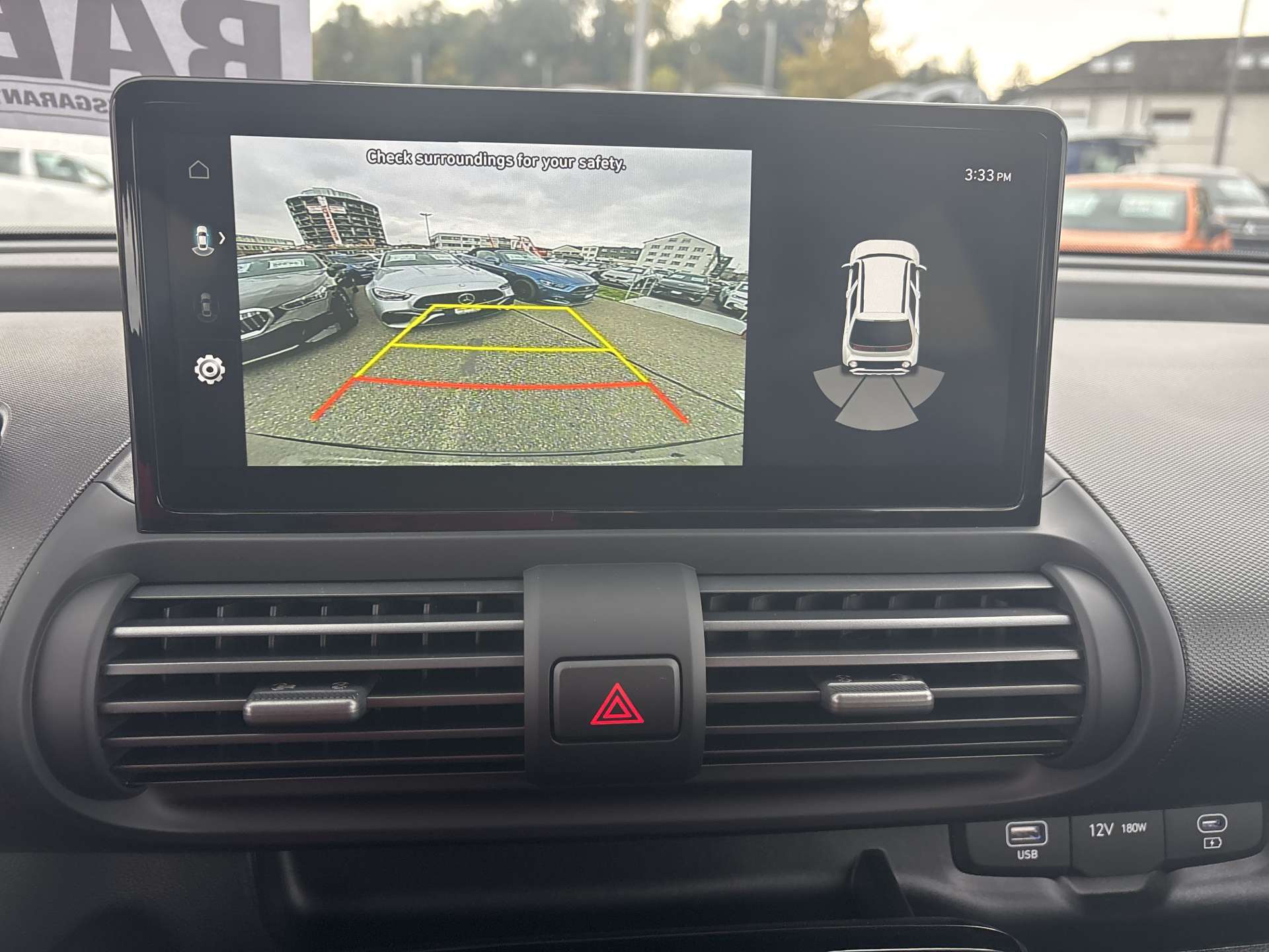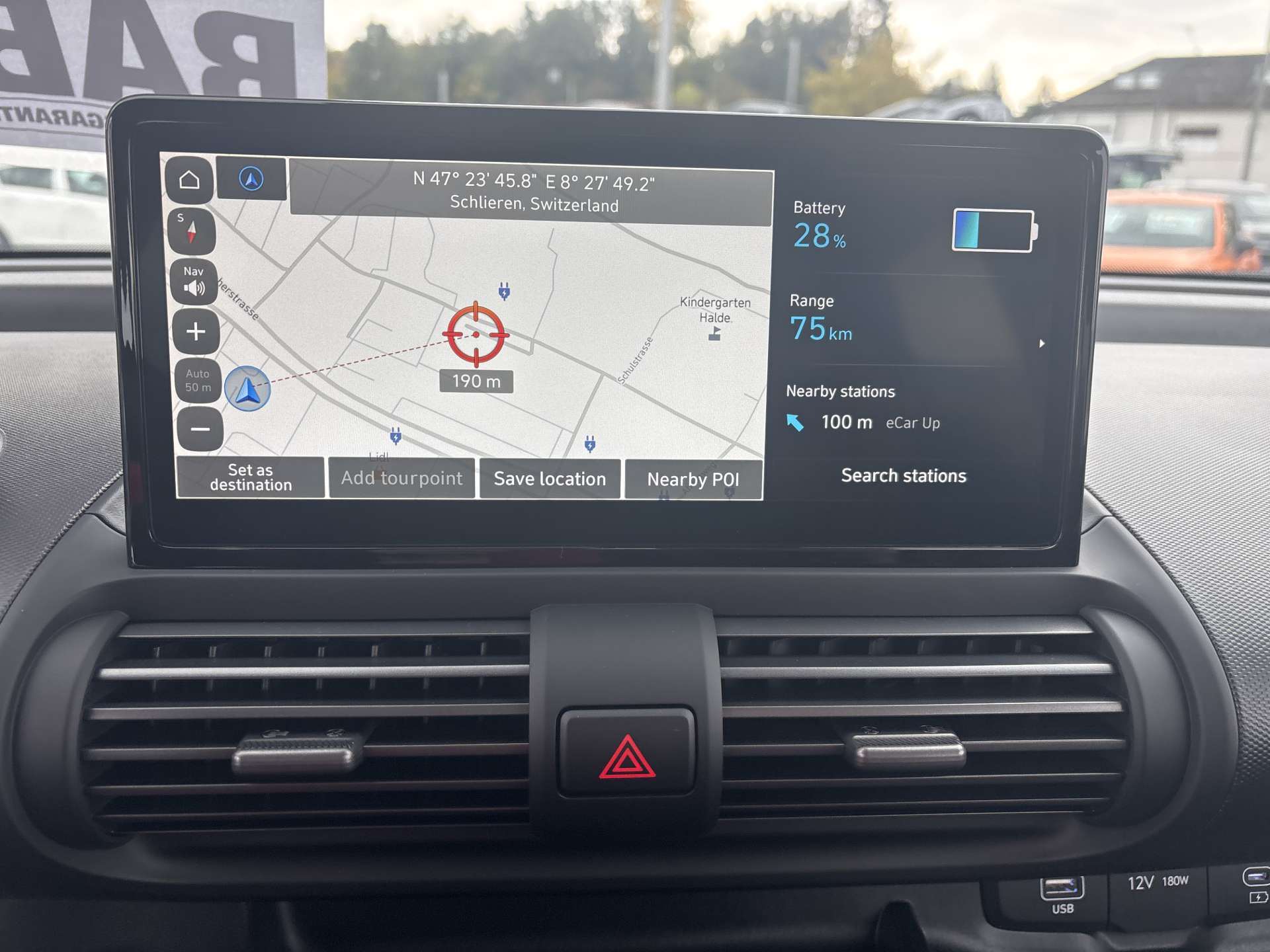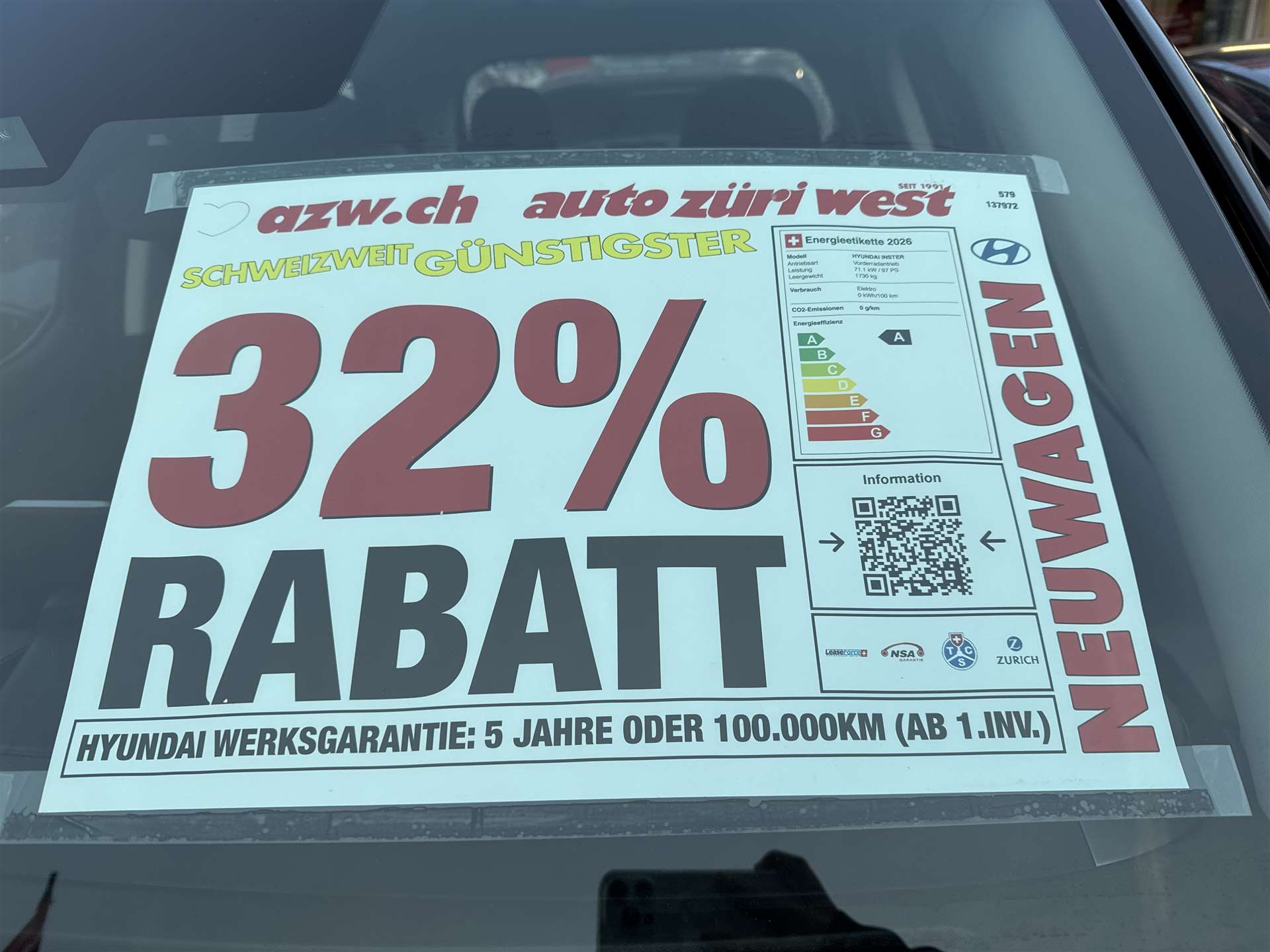 A-Säule in Wagenfarbe, Ablagefläche Fahrer- und Beifahrersitz (Rückseite), ABS mit elektronischer Bremskraftverteilung EBD, Airbag: Center Airbag vorne, Airbag: Deaktivierung Frontairbag Beifahrerseite, Airbag: Front- und Seitenairbags vorne, Vorhangairbags vorne und hinten, Assist: Anfahralarm Vorderfahrzeug, Assist: Aufmerksamkeitsassistent, Assist: Autobahn- und Stauassistent, Assist: Automatisches Notrufsystem eCall, Assist: Einparkhilfe hinten, Assist: Elektrische Parkbremse mit Auto-Hold-Funktion, Assist: Elektronische Traktionskontrolle, Assist: Notbremsassistent mit Abbiege-, Spurwechsel- und Ausweichfunktion, Assist: Notbremsassistent mit Fussgänger-/Fahrraderkennung und Abbiegefunktion, Assist: Rückfahrkamera, Assist: Spurhalteassistent, Assist: Tempomat mit Geschwindigkeitsbegrenzer, Drive Mode Select, Elektrisch einklappbare Aussenspiegel, Elektrisch verstell- und beheizbare Aussenspiegel, Elektronisches Stabilitätsprogramm ESP mit Multikollisionsbremse, Fensterheber vorne und hinten elektrisch, Gepäckraumbeleuchtung, Getriebe: Direktantrieb, kein Getriebe, Insassenalarm, ISOFIX-Kindersitzverankerung hinten, Klima: Klimaautomatik, Lackierung: Uni-Lackierung, Ladegerät (On-Board Charger) dreiphasig bis zu 11 kW, Ladekabel 5 Meter Mode 3 Typ 2, 3-Phasig, inkl. Hyundai-Tragtasche, Lenkrad: Audiofernbedienung am Lenkrad, Lenkrad: Lederlenkrad, Lenkrad: Lenkrad beheizbar, Lenkrad: Schaltwippen am Lenkrad mit i-Pedal Funktion, Licht: Fernlichtassistent, Licht: Halogen-Projektionsscheinwerfer, Licht: Halogen-Rückleuchten, Licht: LED Blinker, Licht: LED-Tagfahrlicht, Licht: Lichtautomatik, Make-up Spiegel Fahrer, Manuelle Heckklappe, Media: 4 Lautsprecher, Media: Android Auto - und Apple CarPlay -Funktion, Media: Digitale Armaturentafel mit 10.25'' TFT LCD Anzeige, Media: Digitalradio DAB+, Media: MapCare Lifetime / Over-the-Air Update, Media: Multi-Bluetooth mit Freisprecheinrichtung mit Spracherkennung, Media: Navigationssystem mit 10.25" Touchscreen, Media: Telematikdienst Bluelink Lite (10 Jahre gratis), Media: USB- Anschlüsse vorne, Polster: Stoffsitze, Räder: Reifendruckkontrollsystem, Räder: Reifenreparatur-Set, Räder: Stahlfelgen 15" mit Radzierblenden, Radlaufverkleidung in Schwarz, Servolenkung, Shift by wire, Sitze: Flach umklappbarer Fahrer- und Beifahrersitz, Sitze: Manuell höhenverstellbarer Fahrersitz, Sitze: Rücksitze getrennt abklappbar (50/50), Sitze: Sitzheizung vorne, Smart Key mit Engine Start/Stop-Taste und Bewegungssensor, Türgriffe und Aussenspiegel in Wagenfarbe, Unterfahrschutz silber, Vorbereitung für Anhängevorrichtung, Wärmedämmende Scheiben vorne, Zentralverriegelung