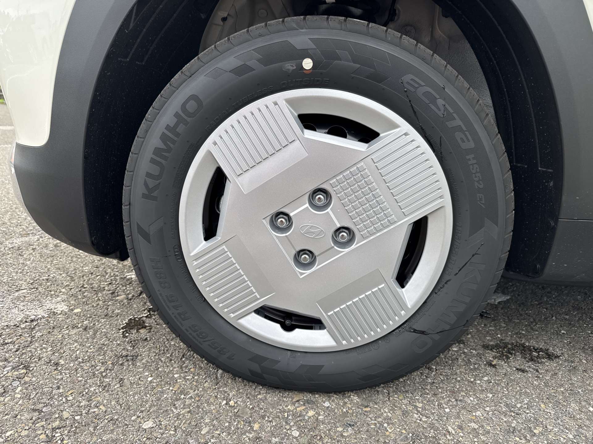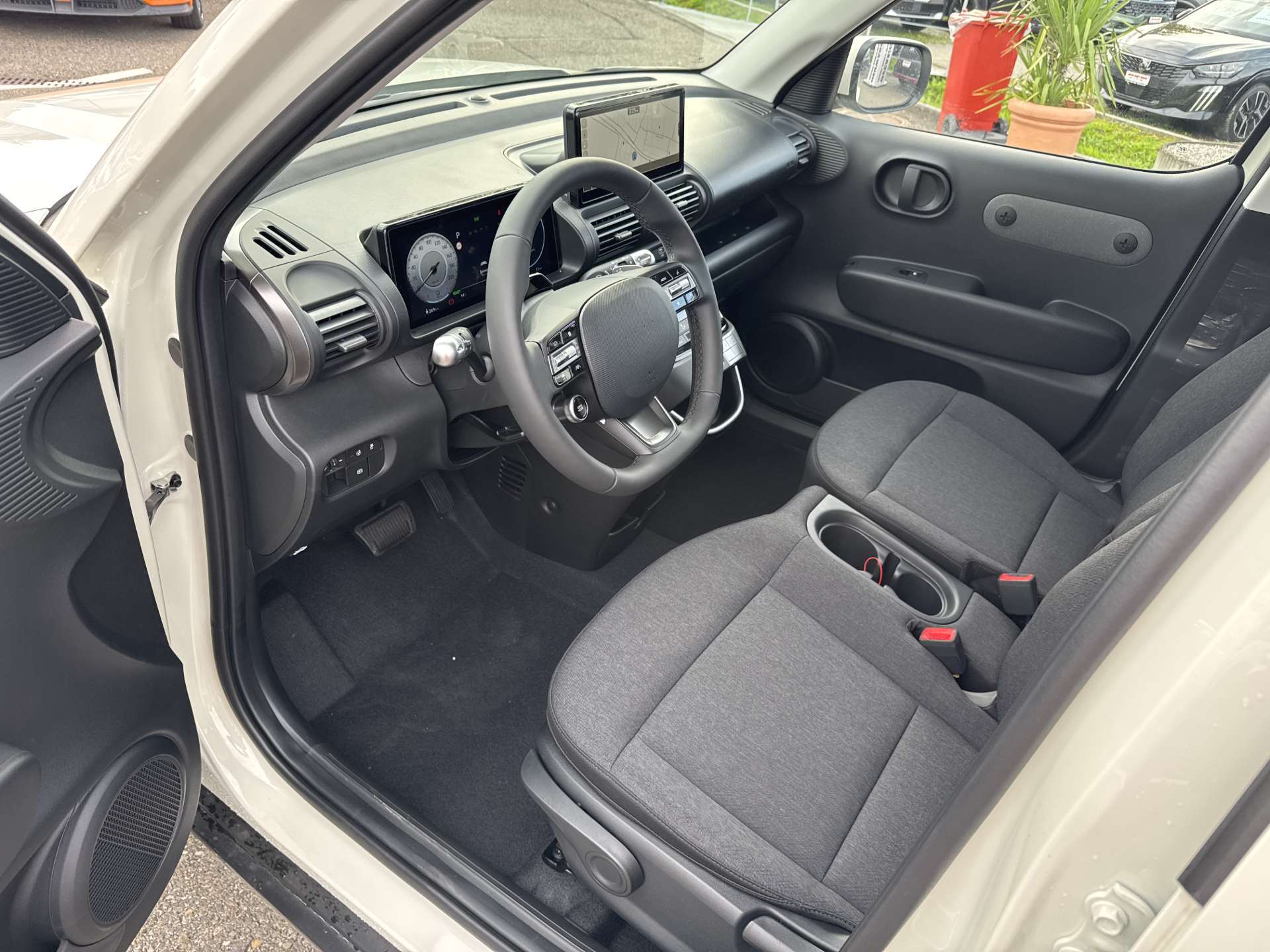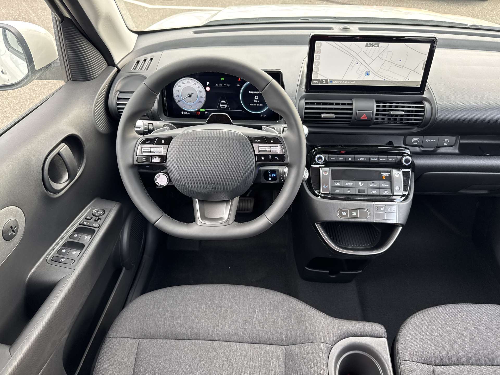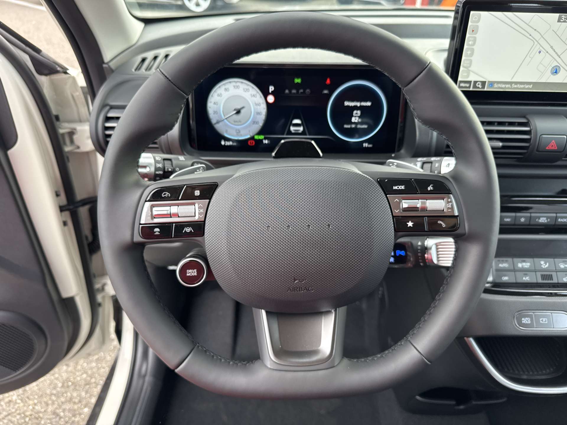 A-Säule in Wagenfarbe, Ablagefläche Fahrer- und Beifahrersitz (Rückseite), ABS mit elektronischer Bremskraftverteilung EBD, Airbag: Center Airbag vorne, Airbag: Deaktivierung Frontairbag Beifahrerseite, Airbag: Front- und Seitenairbags vorne, Vorhangairbags vorne und hinten, Assist: Anfahralarm Vorderfahrzeug, Assist: Aufmerksamkeitsassistent, Assist: Autobahn- und Stauassistent, Assist: Automatisches Notrufsystem eCall, Assist: Einparkhilfe hinten, Assist: Elektrische Parkbremse mit Auto-Hold-Funktion, Assist: Elektronische Traktionskontrolle, Assist: Notbremsassistent mit Abbiege-, Spurwechsel- und Ausweichfunktion, Assist: Notbremsassistent mit Fussgänger-/Fahrraderkennung und Abbiegefunktion, Assist: Rückfahrkamera, Assist: Spurhalteassistent, Assist: Tempomat mit Geschwindigkeitsbegrenzer, Drive Mode Select, Elektrisch einklappbare Aussenspiegel, Elektrisch verstell- und beheizbare Aussenspiegel, Elektronisches Stabilitätsprogramm ESP mit Multikollisionsbremse, Fensterheber vorne und hinten elektrisch, Gepäckraumbeleuchtung, Getriebe: Direktantrieb, kein Getriebe, Insassenalarm, ISOFIX-Kindersitzverankerung hinten, Klima: Klimaautomatik, Lackierung: Uni-Lackierung, Ladegerät (On-Board Charger) dreiphasig bis zu 11 kW, Ladekabel 5 Meter Mode 3 Typ 2, 3-Phasig, inkl. Hyundai-Tragtasche, Lenkrad: Audiofernbedienung am Lenkrad, Lenkrad: Lederlenkrad, Lenkrad: Lenkrad beheizbar, Lenkrad: Schaltwippen am Lenkrad mit i-Pedal Funktion, Licht: Fernlichtassistent, Licht: Halogen-Projektionsscheinwerfer, Licht: Halogen-Rückleuchten, Licht: LED Blinker, Licht: LED-Tagfahrlicht, Licht: Lichtautomatik, Make-up Spiegel Fahrer, Manuelle Heckklappe, Media: 4 Lautsprecher, Media: Android Auto - und Apple CarPlay -Funktion, Media: Digitale Armaturentafel mit 10.25'' TFT LCD Anzeige, Media: Digitalradio DAB+, Media: MapCare Lifetime / Over-the-Air Update, Media: Multi-Bluetooth mit Freisprecheinrichtung mit Spracherkennung, Media: Navigationssystem mit 10.25" Touchscreen, Media: Telematikdienst Bluelink Lite (10 Jahre gratis), Media: USB- Anschlüsse vorne, Polster: Stoffsitze, Räder: Reifendruckkontrollsystem, Räder: Reifenreparatur-Set, Räder: Stahlfelgen 15" mit Radzierblenden, Radlaufverkleidung in Schwarz, Servolenkung, Shift by wire, Sitze: Flach umklappbarer Fahrer- und Beifahrersitz, Sitze: Manuell höhenverstellbarer Fahrersitz, Sitze: Rücksitze getrennt abklappbar (50/50), Sitze: Sitzheizung vorne, Smart Key mit Engine Start/Stop-Taste und Bewegungssensor, Türgriffe und Aussenspiegel in Wagenfarbe, Unterfahrschutz silber, Vorbereitung für Anhängevorrichtung, Wärmedämmende Scheiben vorne, Zentralverriegelung