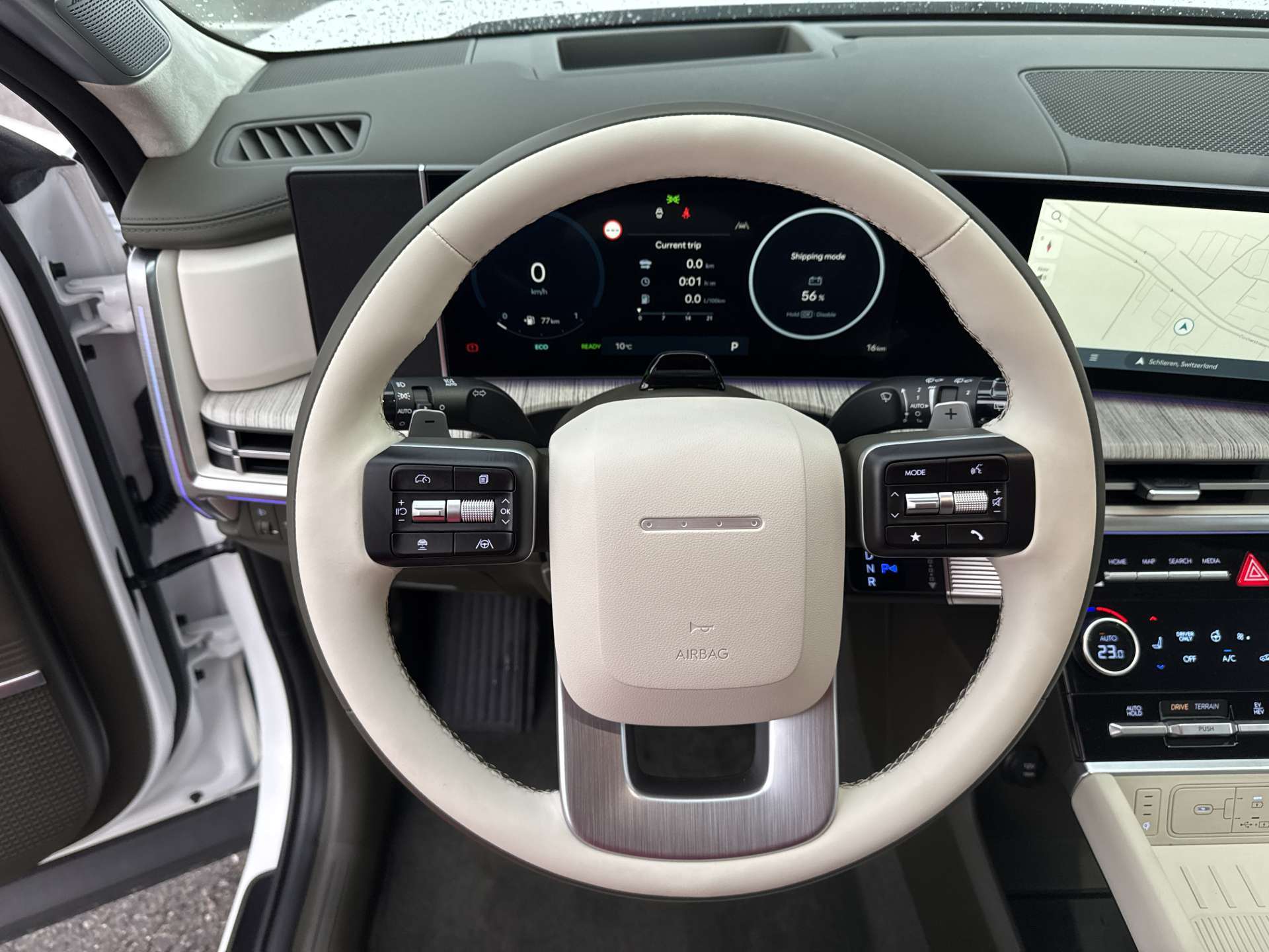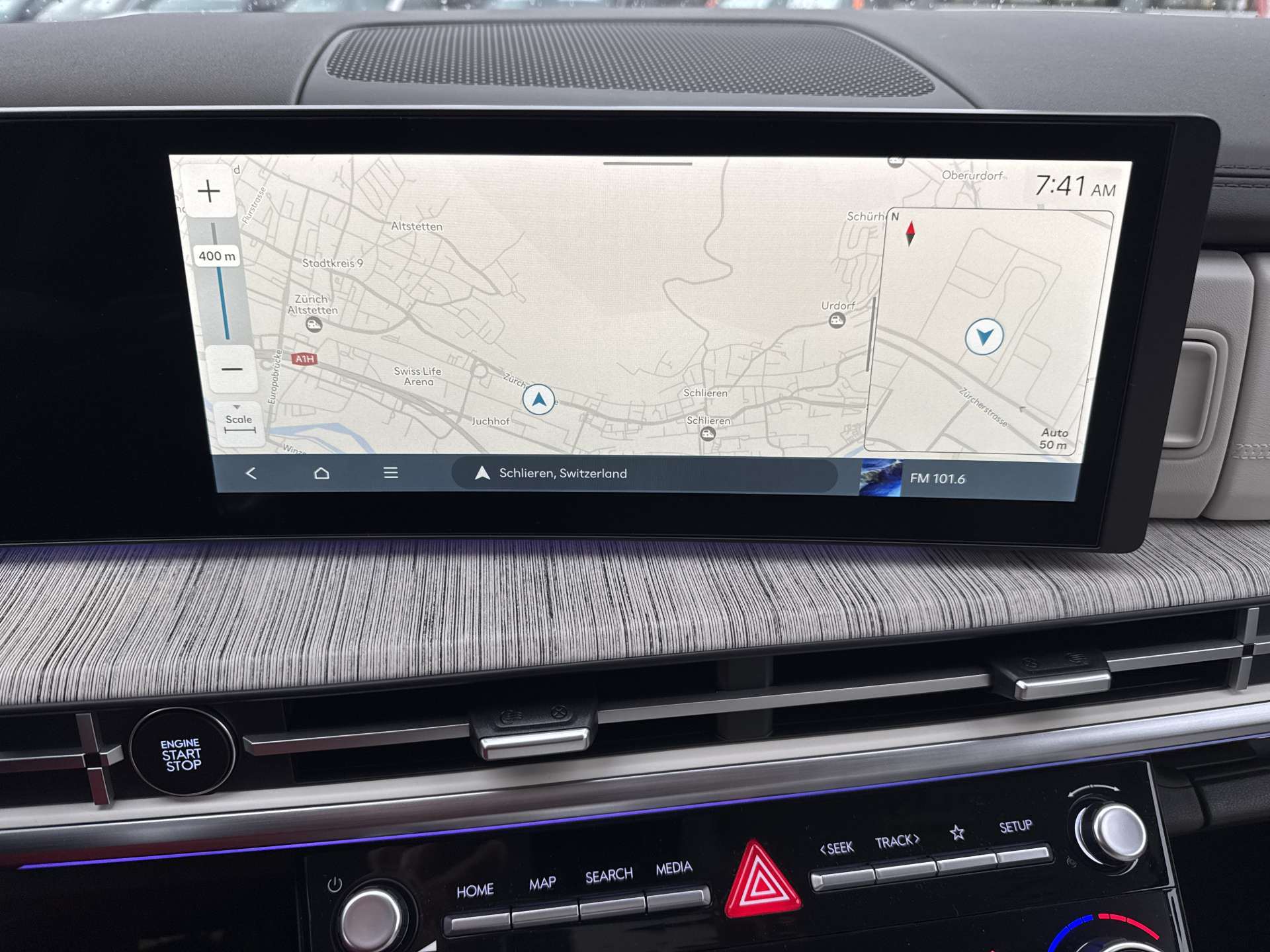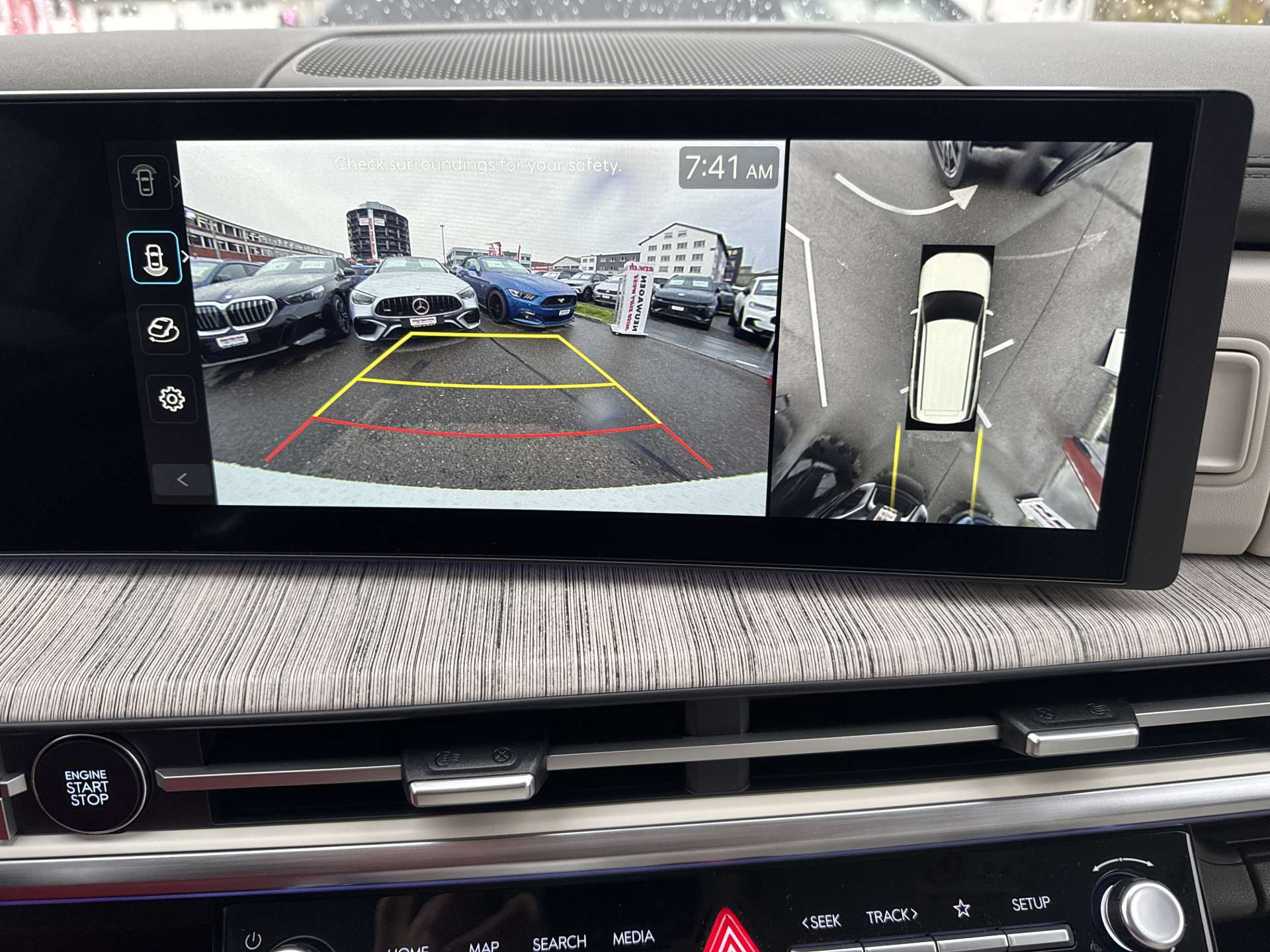 220 V Spannungswandler, ABS, EBD elektronische Bremskraftverteilung, Airbag: Airbag Beifahrer deaktivierbar, Airbag: Front- und Seitenairbags vorne, Airbag: Knieairbag Fahrerseite, Center-Airbag vorne, Airbag: Vorhangairbags vorne und hinten, Akustik-Verbundglas vorne, Alarmanlage, Ambientebeleuchtung, Anhänger Stabilisierungkontrolle TSA, Assist: 360° Rundumsichtkamera, Assist: Aktiver Totwinkelassistent mit Videoübertragung auf Kombiinstrument, Assist: Aufmerksamkeitsassistent mit Kamera (Fahrer), Assist: Autobahn- und Stauassistent, Assist: Automatische Ein- und Ausparkfunktion mit Fernbedienung, Assist: Bergabfahrhilfe (DAC), Assist: Berganfahrhilfe (Hill Holder), Assist: Einparkhilfe hinten mit Bremsassistent, Assist: Einparkhilfe vorne und hinten und seitwärts, Assist: Einparkhilfe vorne und hinten, Rückfahrkamera, Assist: Elektrische Parkbremse mit Auto-Hold-Funktion, Assist: Elektronische Traktionskontrolle, Assist: Insassenalarm mit Ultraschall-Sensoren (Rear Occupant Assist), Assist: Navigationsbasierter adaptiver Tempomat, Assist: Notbremsassistent mit Abbiege- und Kreuzungsfunktion, Assist: Notbremsassistent mit Fussgänger-/Fahrraderkennung und Abbiegefunktion, Assist: Querverkehrswarner hinten mit Bremsassistent, Assist: Spurfolgeassistent, Assist: Spurhalteassistent, Assist: Spurwechselassistent, Assist: Tempomat mit Distanzassistent - autom. Verzögerung bis zum Stillstand, Assist: Verkehrszeichenerkennung mit automatischer Geschwindigkeitsregelung, Aussenspiegel elektrisch einklappbar, Aussenspiegel mit Welcome-Light, Automatische Niveauregulierung hinten, Automatisches Notrufsystem eCall, Bordcomputer, Dachreling, Design-Kühlergrill mit Applikationen in dunklem Chrom, Digital Key 2.0, Digitaler Innenspiegel mit Smart-View-Technologie (DCM), Dreipunkt-Sicherheitsgurte auf allen Plätzen, vorne höhenverstellbar, Elektrisch verstell- und heizbare Aussenspiegel mit integrierten Seitenblinkern, Elektrische Fensterheber hinten mit Schnellsenkfunktion und Einklemmschutz, Elektrische Fensterheber vorne mit Schnellsenkfunktion und Einklemmschutz, Elektrische Heckklappe mit hands-free Funktion, Elektronisches Stabilitätsprogramm ESP mit Multikollisionsbremse, Fahrwerk: HTRAC Allradantrieb mit 3 verschiedenen Fahrmodi und variabler Drehmomentsteuerung, Fahrwerk: Terrain Mode Selector, Gepäcknetz(e), Gepäckraumrollo, Getriebe: 6-Gang Automatikgetriebe, Getriebe: Elektronische Gangschaltung HEV (Shift by wire), Head-up Display mit Projektion auf die Windschutzscheibe, Hyundai Logo und Modellschriftzug in schwarz, Integrierter Haltegriff C-Säule, ISOFIX-Kindersitzverankerung 2. Sitzreihe, Klima: 2-Zonen-Klimaautomatik mit Anti-Beschlagsystem, Klima: Separate Klimaregulierung in der 3. Sitzreihe, Lackierung: Uni-Lackierung, Lenkrad; Lederlenkrad und -schaltknauf, Lenkrad: Lederlenkrad zweifarbig, Lenkrad: Lenkrad beheizbar, Lenkrad: Lenkrad vertikal und axial verstellbar, Lenkrad: Schaltpaddles am Lenkrad, Licht: Bi-LED Scheinwerfer, Licht: Fernlichtassistent, Licht: LED Rücklichter, Licht: LED-Projektionsscheinwerfer, Licht: LED-Tagfahrlicht, Licht: Lichtautomatik, Licht: Scheinwerfer mit Welcome- und Escort-Funktion, Media: Audio-Fernbedienung am Lenkrad, Media: Digitale Armaturentafel mit 12.3'' TFT LCD Anzeige, Media: Kabellose Android Auto - und Apple CarPlay-Funktion, Media: Kabelloses Laden für Smartphone, Media: MapCare Lifetime / Over-the-Air Update, Media: Multi-Bluetooth mit Freisprecheinrichtung, Media: Navigationssystem mit 12.3"-Farbdisplay, Media: Premium Audiosystem Bose mit Verstärker, Subwoofer und Center-Speaker, Media: Telematikdienst Bluelink Lite und LIVE Services (10 Jahre gratis), Passagier-Kommunikationssystem 3. Sitzreihe, Polster: Innenausstattung Nappa-Leder, Polster: Innenverkleidung Wildleder (Dachhimmel, Säulen, Sonnenblenden), Privacy Glass, abgedunkeltes Scheibenglas hinten (ab B-Säule), Räder: 20'' Leichtmetallfelgen, Räder: Reifendruckkontrollsystem, Radläufe und Leiste oberhalb des Schwellers in schwarz glänzend, Regensensor, Schlüsselloses Zugangssystem Smart Key mit Engine Start/Stop-Taste, Servolenkung, Sitze: 2. Sitzreihe gentrennt abklappbar (60/40) und verschiebbar (60/40), Sitze: Elektrisch einstellbare Lendenwirbelstütze, Fahrersitz, Sitze: Elektrisch verstellbarer Fahrer- und Beifahrersitz, Sitze: Fahrersitz mit Memoryfunktion, Sitze: One touch System zum Einstieg in die dritte Sitzreihe, Sitze: Sitzbelüftung vorne, Sitze: Sitzheizung 2. Sitzreihe aussen, Sitze: Sitzheizung vorne, Sitze: Vordersitze mit Relaxfunktion, Sonnenschutzrollo für Fenster 2. Sitzreihe, Start-/Stopp-Automatik, Türgriffe in Wagenfarbe, UV-C Desinfektionssschale, Wegfahrsperre elektronisch, Zentralverriegelung mit Fernbedienung