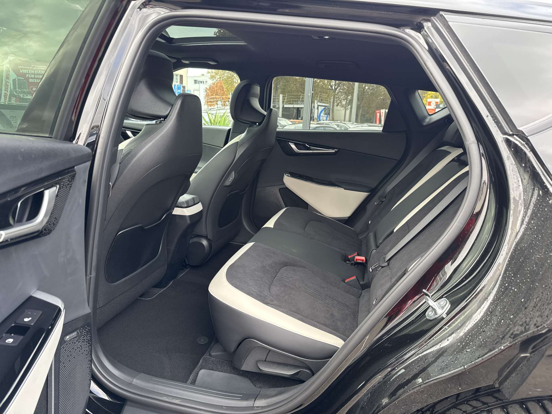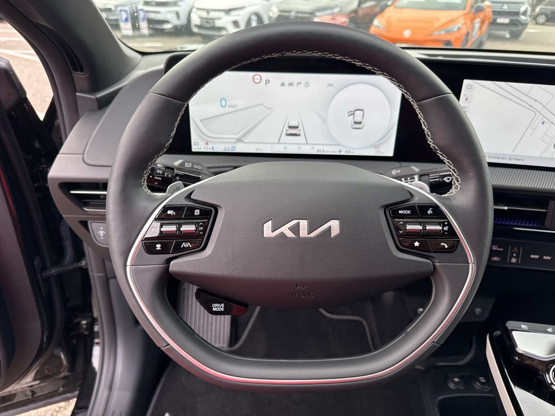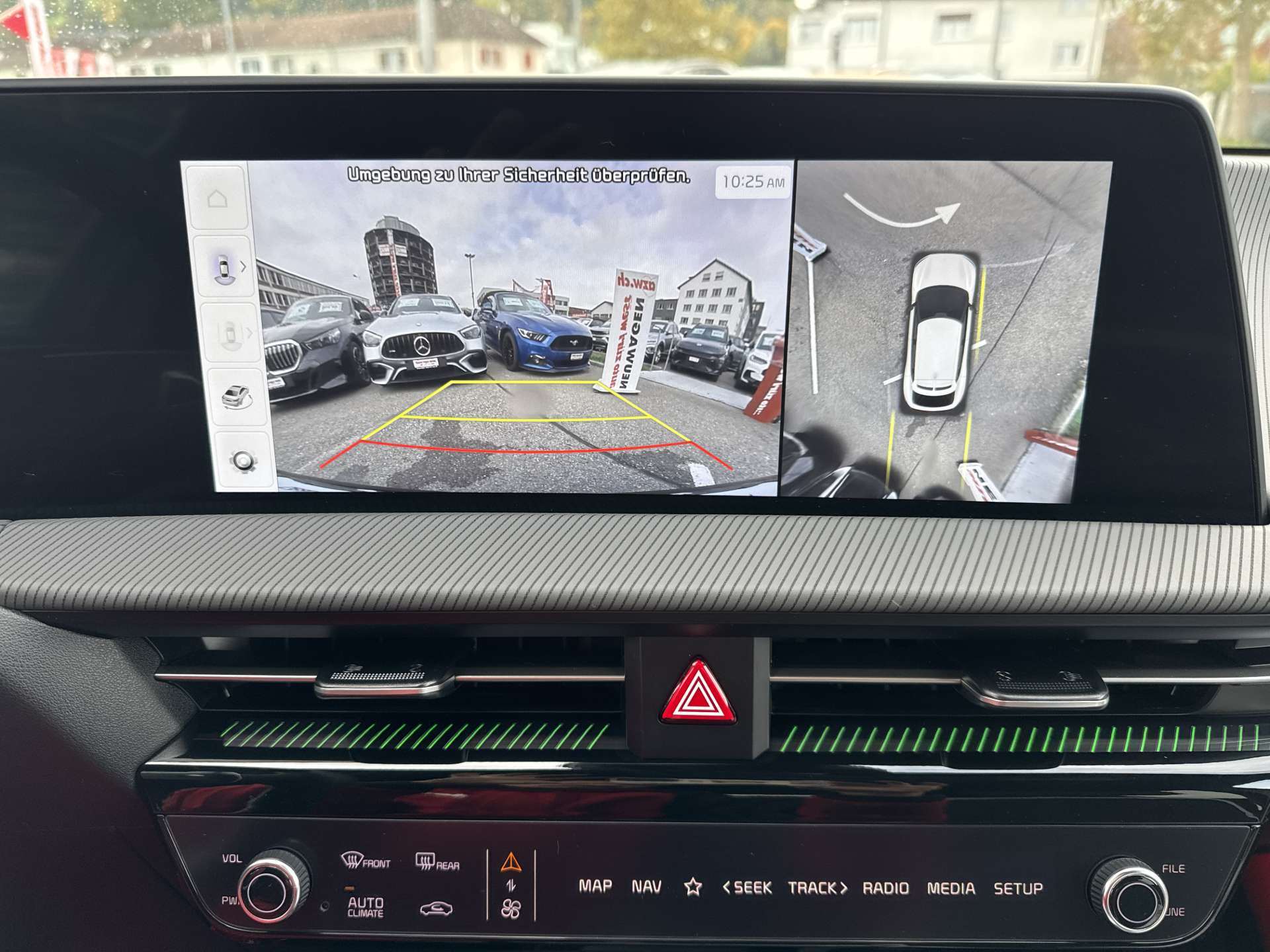 3-Punkt-Sicherheitsgurte an allen Sitzplätzen, vorn höhenverstellbar, Airbag: Airbag Fahrer und Beifahrer, Airbag: Kopfairbags (Vorhang) vorn und hinten, Airbag: Seitenairbags vorn, Ambientebeleuchtung, Antiblockiersystem (ABS), Assist: 360° Monitor Rundumsichtkamera mit 3D Darstellung (SVM), Assist: 360° Monitor Rundumsichtkamera mit 3D Darstellung (SVM), Assist: Aktiv Bremslicht (ESS), Assist: Ausstiegsassistent, Assist: Autobahnassistent (HDA 2.0), Assist: Autonomer Notbremsassistent mit Kreuzungserkennung (FCA-JX), Assist: Autonomer Notbremsassistent mit Abbiegeerkennung (FCA-JX), Assist: Autonomer Notbremsassistent mit Fussgänger- und Fahrraderkennung (FCA), Assist: Berganfahrassistent (HAC), Assist: e-Call automatisches Notrufsystem, Assist: Elektronische Traktionskontrolle (TCS), Assist: Elektronischer Bremskraftverteilung (EBD), Assist: Fahreraufmerksamkeitswarnung, Assist: Ferngesteuerter Parkassistent, Assist: Ferngesteuerter Parkassistent, Assist: Inteligenter Geschwindigkeitsassistent (ISLA), Assist: Intelligenter Tempomat (SCC), Assist: Kollisionsvermeidungsassistent, Assist: Kollisionsvermeidungsassistent, Assist: Lichtsensor, Assist: Multikollisionsbremse, Assist: Parksensoren hinten, Assist: Parksensoren vorn, Assist: Rückfahrkamera, Assist: Spurhalteassistent, Assist: Totwinkel-Assistent, Assist: Totwinkelassistent mit Kollisionsverhinderung hinten (RCCA), Assist: Totwinkelassistent mit Monitoranzeige, Assist: Totwinkelassistent mit Monitoranzeige, Aussenspiegel elektrisch einklappbar, Aussenspiegel elektrisch verstell- und beheizbar, Aussenspiegel in Schwarz, Batterieheizung, Bordcomputer, Dekor: "Geonic" Armaturentafel, Drive Mode Select, Elektrische Handbremse, Elektronisches Stabilitäts-Programm (ESP), Fensterheber elektrisch vorn und hinten, Garantie: Audio-, Entertainment- und Navigationssystem 3 Jahre oder 100'000 km, Garantie: KIA Garantie 12 Jahre gegen Durchrostung, Garantie: KIA Garantie 5 Jahre oder 150'000 km Lackgarantie, Garantie: KIA Garantie 7 Jahre Mobilitätsgarantie, Garantie: KIA Garantie 7 Jahre oder 150'000 km, Garantie: KIA Garantie HV Batterie 7 Jahre oder 150’000 km (was zuerst eintrifft), Gepäckraumbeleuchtung, Getriebe: 1-Gang Getriebe automatisiert, Head-Up-Display mit AR-Funktion, Heckscheibenheizung, Innenraumbeleuchtung, Innenrückspiegel automatisch abblendbar, Insassenalarm, Kindersicherung elektrisch, Klima: 2-Zonen-Klima-Automatik, Klima: Wärmepumpe, Lackierung: Uni Lackierung, Ladeboden variabel, Lenkrad: Lederlenkrad, Lenkrad: Lenkrad beheizbar, Lenkrad: Lenkrad höhen- und tiefenverstellbar, Lenkrad: Schaltwippen hinter dem Lenkrad, Licht: Bi-LED-Scheinwerfer (Intelligentes Scheinwerfer System), Licht: Bi-LED-Scheinwerfer (Intelligentes Scheinwerfer System), Licht: Drittes Bremslicht, Licht: LED-Rückleuchten, Licht: LED-Tagfahrlicht, Licht: Nebelschlussleuchte, Media: 12.3"-Navigationssystem, DAB+, Media: 14 Lautsprecher, Media: Android Auto und Apple CarPlay, Media: Bluetooth mit Sprachsteuerung, Media: Induktive Ladestation für Smartphone, Media: Meridian Soundsystem mit aktiver Klanggestaltung (ASD), Media: Online-Dienste Kia Connect inkl. 7 Jahre, Media: USB-Anschluss, Mittelarmlehne vorne mit Staufach, Mittelkonsole in Klavierlackoptik, Paket: Assistance Pack, Paket: Innovation, Paket: Visibility, Panorama-Glasdach, Pedalerie mit Aluminiumauflage, Polster: Sitzbezüge Wildleder, Räder: Reifendruckkontrollsystem (TPMS), Räder: Tire mobility kit, Radläufe in Wagenfarbe, Regensensor, Servolenkung, Sitze: Beifahrersitz elektr. verstellbar mit Relax-Funktion, Sitze: Beifahrersitz höhenverstellbar, Sitze: Fahrer- und Beifahrersitz elektrisch verstellbar, Sitze: Fahrersitz höhenverstellbar, Sitze: ISOFIX-Kindersitzverankerung hinten, Sitze: Kopfstützen höhenverstellbar vorne und hinten, Sitze: Sitzbelüftung vorne, Sitze: Sitzheizung hinten, Sitze: Sitzheizung vorne, Sitze: Sitzlehne der 2. Sitzreihe umklappbar, asymmetrisch 60:40, Sonnenblende mit Make-up-Spiegel mit Beleuchtung, Start-/Stop-Knopf mit Smart Key, Supervision Cluster digital 12.3", Türen: Verzierung Türen schwarz, Vehicle-to-Load-Funktion (V2L), Vorbereitung Anhängerkupplung, Wärmepumpe, Wegfahrsperre elektronisch, Zentralverriegelung mit Fernbedienung