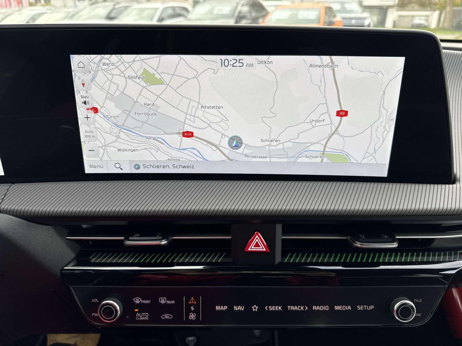 3-Punkt-Sicherheitsgurte an allen Sitzplätzen, vorn höhenverstellbar, Airbag: Airbag Fahrer und Beifahrer, Airbag: Kopfairbags (Vorhang) vorn und hinten, Airbag: Seitenairbags vorn, Ambientebeleuchtung, Antiblockiersystem (ABS), Assist: 360° Monitor Rundumsichtkamera mit 3D Darstellung (SVM), Assist: 360° Monitor Rundumsichtkamera mit 3D Darstellung (SVM), Assist: Aktiv Bremslicht (ESS), Assist: Ausstiegsassistent, Assist: Autobahnassistent (HDA 2.0), Assist: Autonomer Notbremsassistent mit Kreuzungserkennung (FCA-JX), Assist: Autonomer Notbremsassistent mit Abbiegeerkennung (FCA-JX), Assist: Autonomer Notbremsassistent mit Fussgänger- und Fahrraderkennung (FCA), Assist: Berganfahrassistent (HAC), Assist: e-Call automatisches Notrufsystem, Assist: Elektronische Traktionskontrolle (TCS), Assist: Elektronischer Bremskraftverteilung (EBD), Assist: Fahreraufmerksamkeitswarnung, Assist: Ferngesteuerter Parkassistent, Assist: Ferngesteuerter Parkassistent, Assist: Inteligenter Geschwindigkeitsassistent (ISLA), Assist: Intelligenter Tempomat (SCC), Assist: Kollisionsvermeidungsassistent, Assist: Kollisionsvermeidungsassistent, Assist: Lichtsensor, Assist: Multikollisionsbremse, Assist: Parksensoren hinten, Assist: Parksensoren vorn, Assist: Rückfahrkamera, Assist: Spurhalteassistent, Assist: Totwinkel-Assistent, Assist: Totwinkelassistent mit Kollisionsverhinderung hinten (RCCA), Assist: Totwinkelassistent mit Monitoranzeige, Assist: Totwinkelassistent mit Monitoranzeige, Aussenspiegel elektrisch einklappbar, Aussenspiegel elektrisch verstell- und beheizbar, Aussenspiegel in Schwarz, Batterieheizung, Bordcomputer, Dekor: "Geonic" Armaturentafel, Drive Mode Select, Elektrische Handbremse, Elektronisches Stabilitäts-Programm (ESP), Fensterheber elektrisch vorn und hinten, Garantie: Audio-, Entertainment- und Navigationssystem 3 Jahre oder 100'000 km, Garantie: KIA Garantie 12 Jahre gegen Durchrostung, Garantie: KIA Garantie 5 Jahre oder 150'000 km Lackgarantie, Garantie: KIA Garantie 7 Jahre Mobilitätsgarantie, Garantie: KIA Garantie 7 Jahre oder 150'000 km, Garantie: KIA Garantie HV Batterie 7 Jahre oder 150’000 km (was zuerst eintrifft), Gepäckraumbeleuchtung, Getriebe: 1-Gang Getriebe automatisiert, Head-Up-Display mit AR-Funktion, Heckscheibenheizung, Innenraumbeleuchtung, Innenrückspiegel automatisch abblendbar, Insassenalarm, Kindersicherung elektrisch, Klima: 2-Zonen-Klima-Automatik, Klima: Wärmepumpe, Lackierung: Uni Lackierung, Ladeboden variabel, Lenkrad: Lederlenkrad, Lenkrad: Lenkrad beheizbar, Lenkrad: Lenkrad höhen- und tiefenverstellbar, Lenkrad: Schaltwippen hinter dem Lenkrad, Licht: Bi-LED-Scheinwerfer (Intelligentes Scheinwerfer System), Licht: Bi-LED-Scheinwerfer (Intelligentes Scheinwerfer System), Licht: Drittes Bremslicht, Licht: LED-Rückleuchten, Licht: LED-Tagfahrlicht, Licht: Nebelschlussleuchte, Media: 12.3"-Navigationssystem, DAB+, Media: 14 Lautsprecher, Media: Android Auto und Apple CarPlay, Media: Bluetooth mit Sprachsteuerung, Media: Induktive Ladestation für Smartphone, Media: Meridian Soundsystem mit aktiver Klanggestaltung (ASD), Media: Online-Dienste Kia Connect inkl. 7 Jahre, Media: USB-Anschluss, Mittelarmlehne vorne mit Staufach, Mittelkonsole in Klavierlackoptik, Paket: Assistance Pack, Paket: Innovation, Paket: Visibility, Panorama-Glasdach, Pedalerie mit Aluminiumauflage, Polster: Sitzbezüge Wildleder, Räder: Reifendruckkontrollsystem (TPMS), Räder: Tire mobility kit, Radläufe in Wagenfarbe, Regensensor, Servolenkung, Sitze: Beifahrersitz elektr. verstellbar mit Relax-Funktion, Sitze: Beifahrersitz höhenverstellbar, Sitze: Fahrer- und Beifahrersitz elektrisch verstellbar, Sitze: Fahrersitz höhenverstellbar, Sitze: ISOFIX-Kindersitzverankerung hinten, Sitze: Kopfstützen höhenverstellbar vorne und hinten, Sitze: Sitzbelüftung vorne, Sitze: Sitzheizung hinten, Sitze: Sitzheizung vorne, Sitze: Sitzlehne der 2. Sitzreihe umklappbar, asymmetrisch 60:40, Sonnenblende mit Make-up-Spiegel mit Beleuchtung, Start-/Stop-Knopf mit Smart Key, Supervision Cluster digital 12.3", Türen: Verzierung Türen schwarz, Vehicle-to-Load-Funktion (V2L), Vorbereitung Anhängerkupplung, Wärmepumpe, Wegfahrsperre elektronisch, Zentralverriegelung mit Fernbedienung