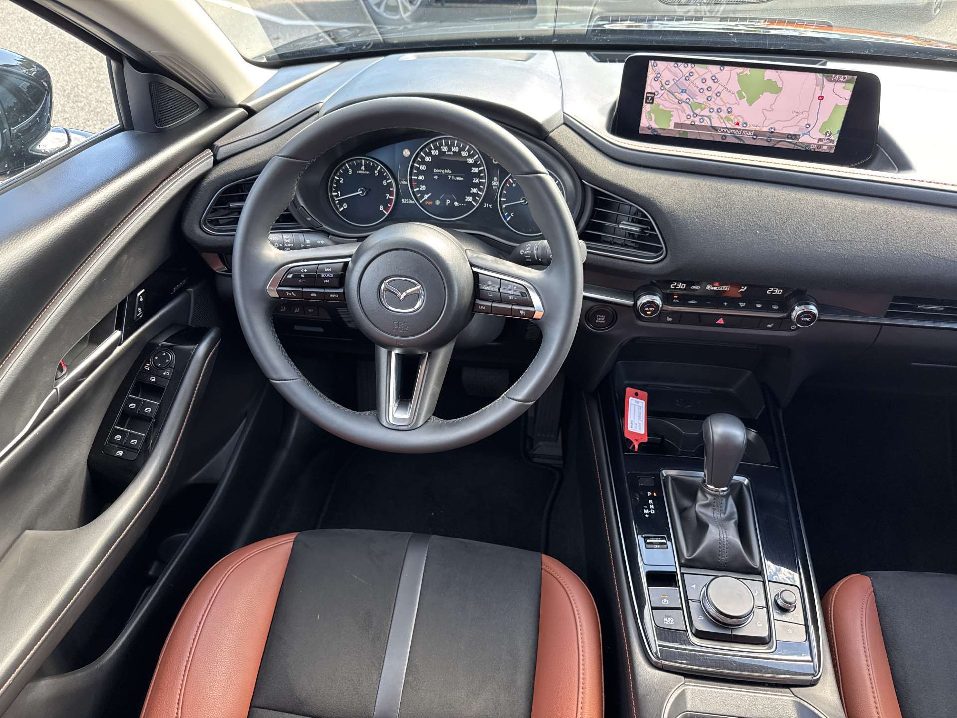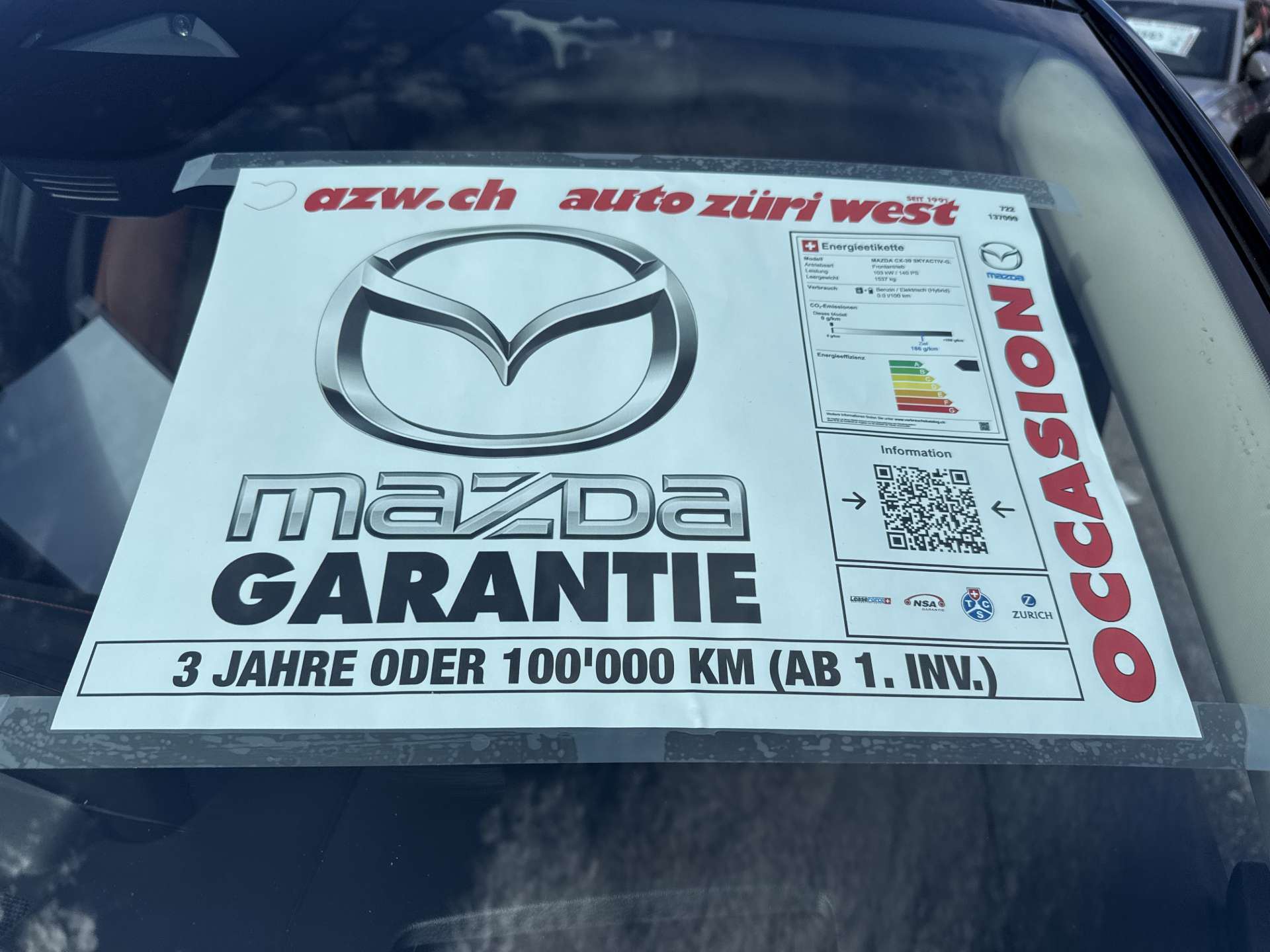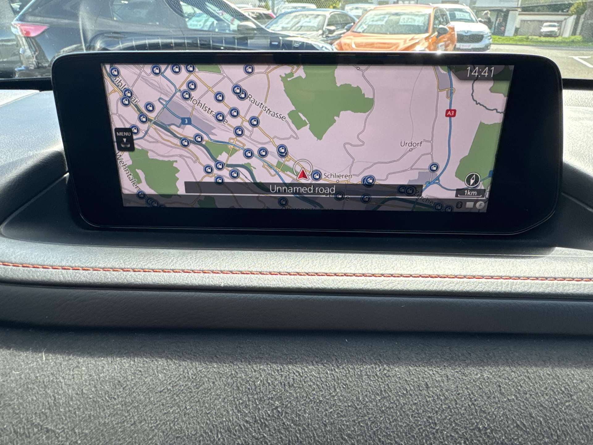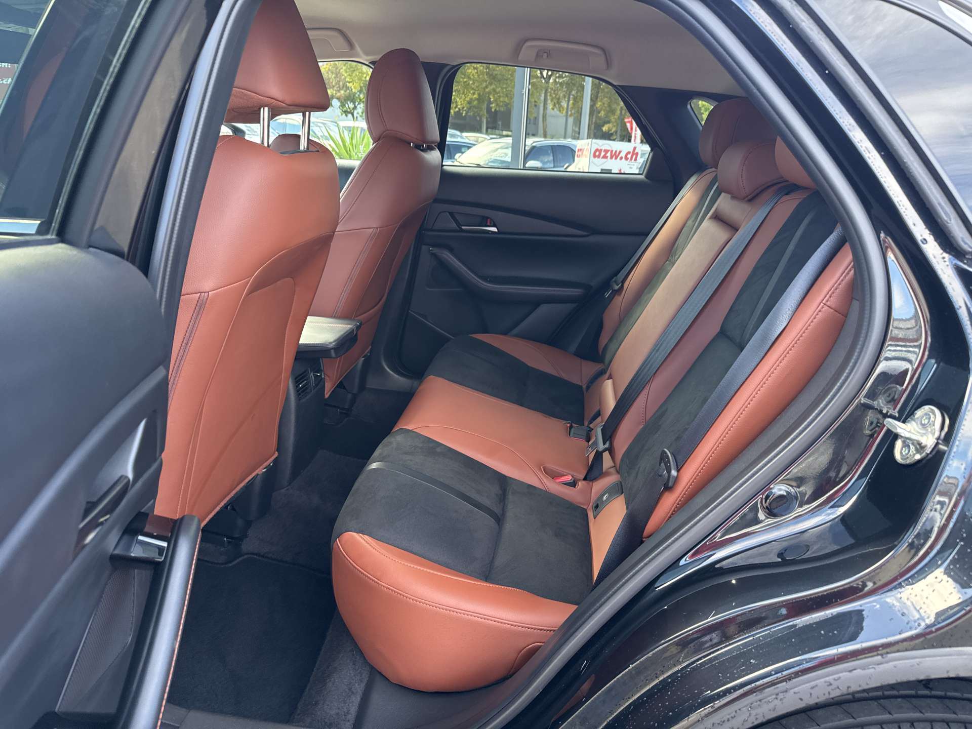 Ablagetasche (Rückseite Beifahrersitz), ABS, Airbag: Airbag Fahrer und Beifahrer, Airbag: Fahrer-Knie-Airbag, Airbag: Seitenairbags vorne, Airbag: Vorhang vorn-hinten, Alarmanlage, Assist: Adaptive Geschwindigkeitsautomatik MRCC (Mazda Radar Cruise Control) mit Stop & Go-Funktion, Assist: Aufmerksamkeitswarner DAA (Driver Attention Alert), Assist: City-Notbremsassistent SCBS mit Fussgänger- und Fahrraderkennung, Assist: Dynamische Stabilitätskontrolle (DSC) und Traktionskontrolle (TCS), Assist: Einparkhilfe mit Parksensoren hinten, Assist: Einparkhilfe mit Parksensoren vorne, Assist: Elektronische Parkbremse mit Auto-Hold-Funktion und Berganfahrhilfe, Assist: Intelligente Geschwindigkeitsautomatik und Geschwindigkeitsbegrenzer mit Verkehrszeichen, Assist: Pre-Crash Safety mit aktivem Bremseingriff SBS (Smart Brake Support), Assist: Rückfahr-Querverkehrswarner (RCTA, Rear Cross Traffic Alert), Assist: Rückfahrkamera, Assist: Spurhalteassistent LAS (Lane-keep Assist System) mit aktiver Lenkunterstützung, Assist: Spurwechselassistent (BSM, Blind Spot Monitoring) mit Totwinkelwarner, Assist: Verkehrszeichenerkennung (TSR, Traffic Sign Recognition), Aussenspiegel automatisch abblendend auf Fahrerseite, Aussenspiegel beheizbar und automatisch einklappbar, Aussenspiegel in Brilliant Black, Aussenspiegel rechts mit automatischer Absenkfunktion zum Rückwärtsfahren, Blenden im Seitenfensterbereich in Brilliant Black, Bordcomputer, Dachheckspoiler in Brilliant Black, Dekor: Interieur schwarz mit Ziernähten in Terracotta und Dekorelementen in Gunmetal Black, Dunkel getönte Scheiben hinten (Privacy Glass), eCall, Elektrische Fensterheber vorn und hinten mit Automatikfunktion, Elektrische Heckklappe, Fahrwerk: G-Vectoring Control Plus, die Fahrdynamikregelung von Mazda, Getriebe: 6-Gang-Automat, Head-up-Display mit Projektion auf die Windschutzscheibe, i-stop, das intelligente Stopp-Start-System von Mazda, Innenspiegel automatisch abblendbar, Isofix-Kindersitzverankerungen (2x), Keyless Entry mit Smart Key, Klima: 2-Zonen-Klimaautomatik mit Ventilation hinten, Kofferraumorganisator Smart Cargo System (SCS), Kosmetikspiegel auf Beifahrerseite und Fahrerseite, beide beleuchtet, Kühlergrill in Brilliant Black, Kühlergrilleinfassung in Black Chrome, Lackierung: Uni-Lackierung, LED-Innenbeleuchtung, Lederlenkrad und -schaltknauf, Lenkrad: Lenkrad längs- und höhenverstellbar, Lenkrad: Multifunktionslenkrad, Licht: Fernlichtautomatik (HBC, High-Beam Control), Licht: LED-Rückleuchten, Licht: Lichtautomatik, Licht: Scheinwerfer mit Coming-/Leaving-Home-Funktion, Licht: Voll-LED-Scheinwerfer, Mazda M Hybrid, Mild-Hybridsystem (M-HEV) mit Bremsenergie-Rückgewinnung, Media: 12 Lautsprecher, Media: Apple CarPlay wireless und Android Auto wireless, Media: Audiosystem mit DAB+-Radio, 2x USB- C- und 12-V-Anschluss, Media: Bluetooth für Smartphones und Audiogeräte, Media: Bose Premium Surround Sound-System, Media: Instrumentenanzeige mit 7'-TFT-Multidisplay, Media: Mazda Connect mit 10,25"-TFT-Display und Sprachassistent Alexa, Media: Mazda Connected Services, Media: Multi Commander HMI auf der Mittelkonsole, Media: MyMazda App, Media: Navigationssystem, Media: Wireless-Ladestation (für Smartphones mit Qi-Standard), Mittelarmlehne vorne mit Ablagefach, Motor-Startknopf, Polster: Simililedersitze in Terracotta mit Sitzfläche in Leganu schwarz (Wildlederoptik), Räder: Leichtmetallfelgen 18" Farbe Black Metallic 215/55 R18, Räder: Reifendruckkontrollsystem, Räder: Reifenreparatur-Set (Tire Fit), Scheibenwischer mit integrierter Waschdüse, Scheibenwischer mit Regensensor, Servolenkung, Sitze: Beifahrersitz höhenverstellbar, Sitze: Fahrersitz elektrisch verstellbar (5-fach) und mit Memory-Funktion für Sitzeinstellung,, Sitze: Fahrersitz in Höhe und Sitzkissen in Neigung verstellbar, Sitze: Fahrersitz mit einstellbarer Lendenwirbelstütze, Sitze: Rücksitzlehnen getrennt abklappbar 60:40, Sitze: Vordersitze heizbar, Zentralverriegelung mit Fernbedienung