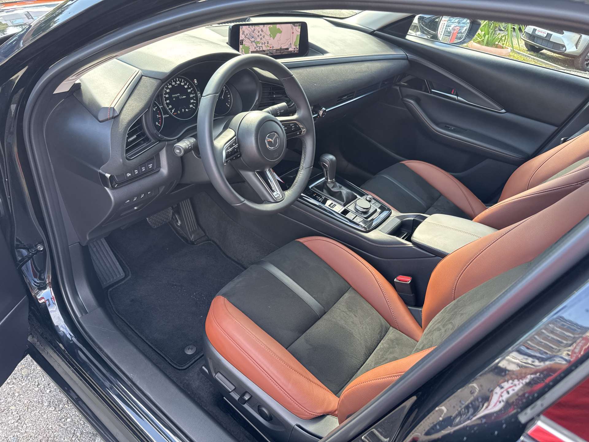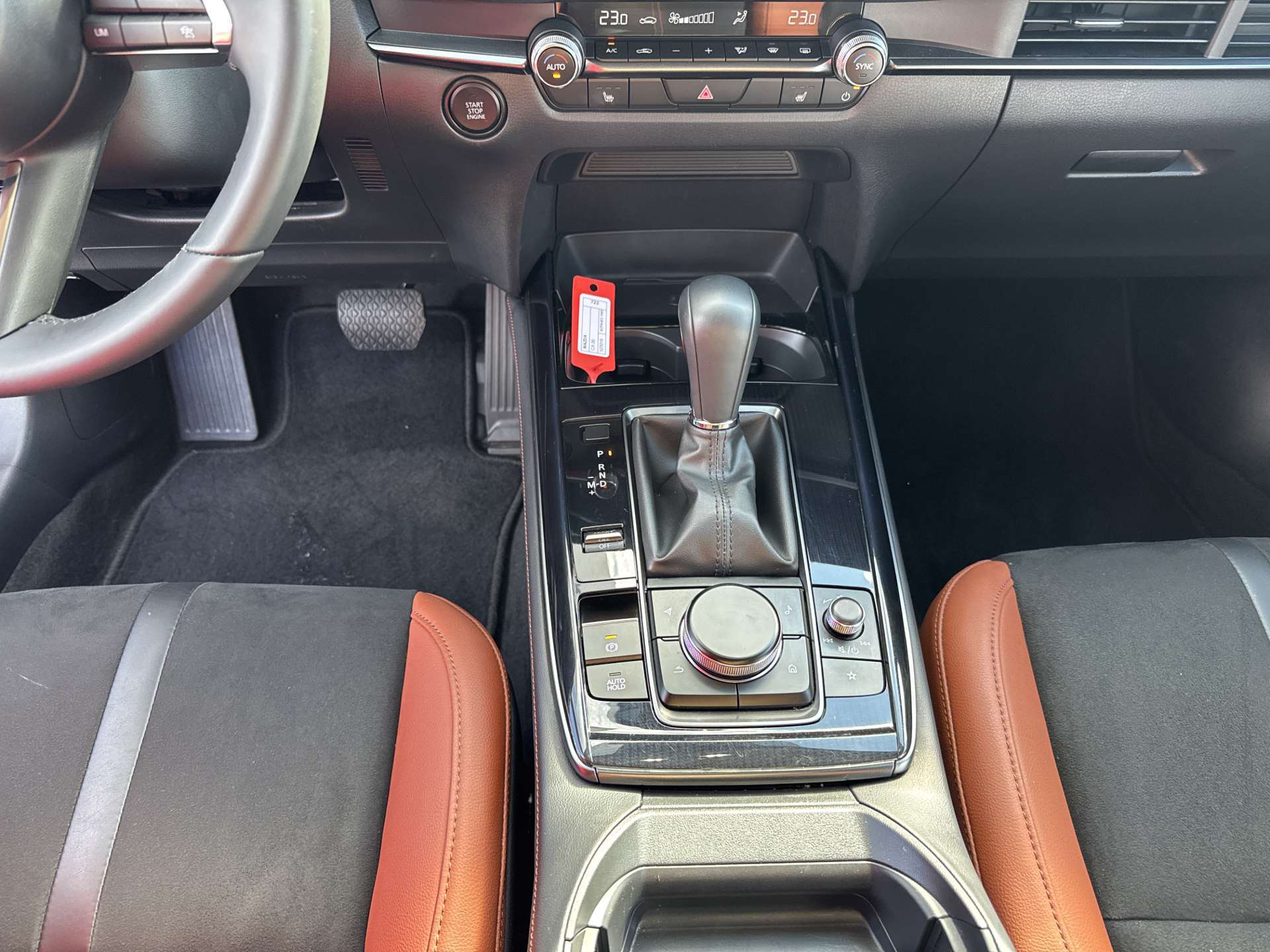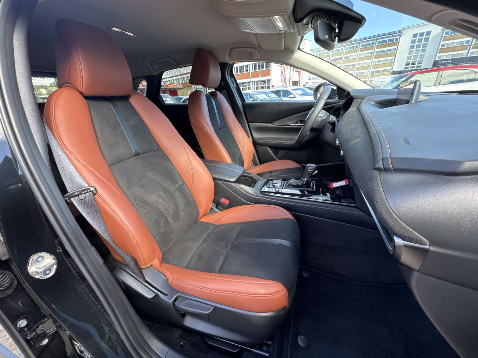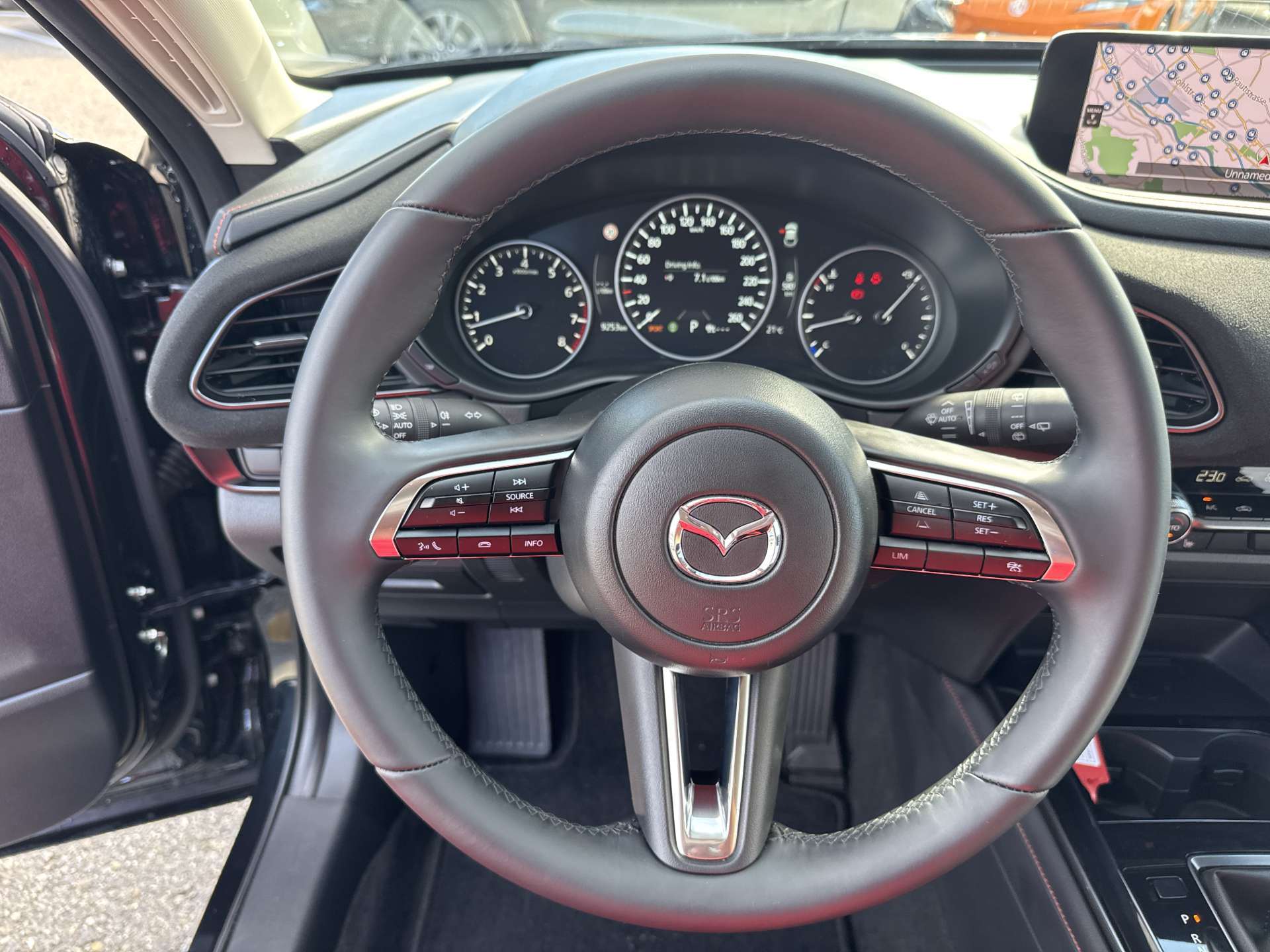 Ablagetasche (Rückseite Beifahrersitz), ABS, Airbag: Airbag Fahrer und Beifahrer, Airbag: Fahrer-Knie-Airbag, Airbag: Seitenairbags vorne, Airbag: Vorhang vorn-hinten, Alarmanlage, Assist: Adaptive Geschwindigkeitsautomatik MRCC (Mazda Radar Cruise Control) mit Stop & Go-Funktion, Assist: Aufmerksamkeitswarner DAA (Driver Attention Alert), Assist: City-Notbremsassistent SCBS mit Fussgänger- und Fahrraderkennung, Assist: Dynamische Stabilitätskontrolle (DSC) und Traktionskontrolle (TCS), Assist: Einparkhilfe mit Parksensoren hinten, Assist: Einparkhilfe mit Parksensoren vorne, Assist: Elektronische Parkbremse mit Auto-Hold-Funktion und Berganfahrhilfe, Assist: Intelligente Geschwindigkeitsautomatik und Geschwindigkeitsbegrenzer mit Verkehrszeichen, Assist: Pre-Crash Safety mit aktivem Bremseingriff SBS (Smart Brake Support), Assist: Rückfahr-Querverkehrswarner (RCTA, Rear Cross Traffic Alert), Assist: Rückfahrkamera, Assist: Spurhalteassistent LAS (Lane-keep Assist System) mit aktiver Lenkunterstützung, Assist: Spurwechselassistent (BSM, Blind Spot Monitoring) mit Totwinkelwarner, Assist: Verkehrszeichenerkennung (TSR, Traffic Sign Recognition), Aussenspiegel automatisch abblendend auf Fahrerseite, Aussenspiegel beheizbar und automatisch einklappbar, Aussenspiegel in Brilliant Black, Aussenspiegel rechts mit automatischer Absenkfunktion zum Rückwärtsfahren, Blenden im Seitenfensterbereich in Brilliant Black, Bordcomputer, Dachheckspoiler in Brilliant Black, Dekor: Interieur schwarz mit Ziernähten in Terracotta und Dekorelementen in Gunmetal Black, Dunkel getönte Scheiben hinten (Privacy Glass), eCall, Elektrische Fensterheber vorn und hinten mit Automatikfunktion, Elektrische Heckklappe, Fahrwerk: G-Vectoring Control Plus, die Fahrdynamikregelung von Mazda, Getriebe: 6-Gang-Automat, Head-up-Display mit Projektion auf die Windschutzscheibe, i-stop, das intelligente Stopp-Start-System von Mazda, Innenspiegel automatisch abblendbar, Isofix-Kindersitzverankerungen (2x), Keyless Entry mit Smart Key, Klima: 2-Zonen-Klimaautomatik mit Ventilation hinten, Kofferraumorganisator Smart Cargo System (SCS), Kosmetikspiegel auf Beifahrerseite und Fahrerseite, beide beleuchtet, Kühlergrill in Brilliant Black, Kühlergrilleinfassung in Black Chrome, Lackierung: Uni-Lackierung, LED-Innenbeleuchtung, Lederlenkrad und -schaltknauf, Lenkrad: Lenkrad längs- und höhenverstellbar, Lenkrad: Multifunktionslenkrad, Licht: Fernlichtautomatik (HBC, High-Beam Control), Licht: LED-Rückleuchten, Licht: Lichtautomatik, Licht: Scheinwerfer mit Coming-/Leaving-Home-Funktion, Licht: Voll-LED-Scheinwerfer, Mazda M Hybrid, Mild-Hybridsystem (M-HEV) mit Bremsenergie-Rückgewinnung, Media: 12 Lautsprecher, Media: Apple CarPlay wireless und Android Auto wireless, Media: Audiosystem mit DAB+-Radio, 2x USB- C- und 12-V-Anschluss, Media: Bluetooth für Smartphones und Audiogeräte, Media: Bose Premium Surround Sound-System, Media: Instrumentenanzeige mit 7'-TFT-Multidisplay, Media: Mazda Connect mit 10,25"-TFT-Display und Sprachassistent Alexa, Media: Mazda Connected Services, Media: Multi Commander HMI auf der Mittelkonsole, Media: MyMazda App, Media: Navigationssystem, Media: Wireless-Ladestation (für Smartphones mit Qi-Standard), Mittelarmlehne vorne mit Ablagefach, Motor-Startknopf, Polster: Simililedersitze in Terracotta mit Sitzfläche in Leganu schwarz (Wildlederoptik), Räder: Leichtmetallfelgen 18" Farbe Black Metallic 215/55 R18, Räder: Reifendruckkontrollsystem, Räder: Reifenreparatur-Set (Tire Fit), Scheibenwischer mit integrierter Waschdüse, Scheibenwischer mit Regensensor, Servolenkung, Sitze: Beifahrersitz höhenverstellbar, Sitze: Fahrersitz elektrisch verstellbar (5-fach) und mit Memory-Funktion für Sitzeinstellung,, Sitze: Fahrersitz in Höhe und Sitzkissen in Neigung verstellbar, Sitze: Fahrersitz mit einstellbarer Lendenwirbelstütze, Sitze: Rücksitzlehnen getrennt abklappbar 60:40, Sitze: Vordersitze heizbar, Zentralverriegelung mit Fernbedienung