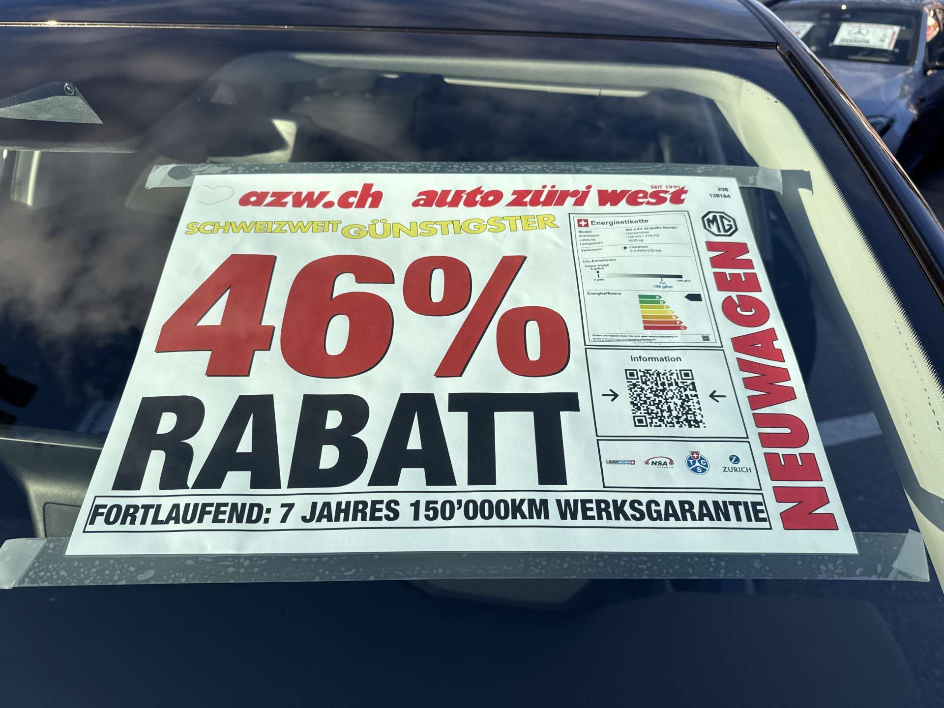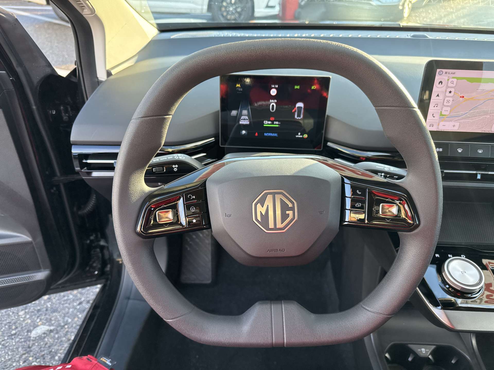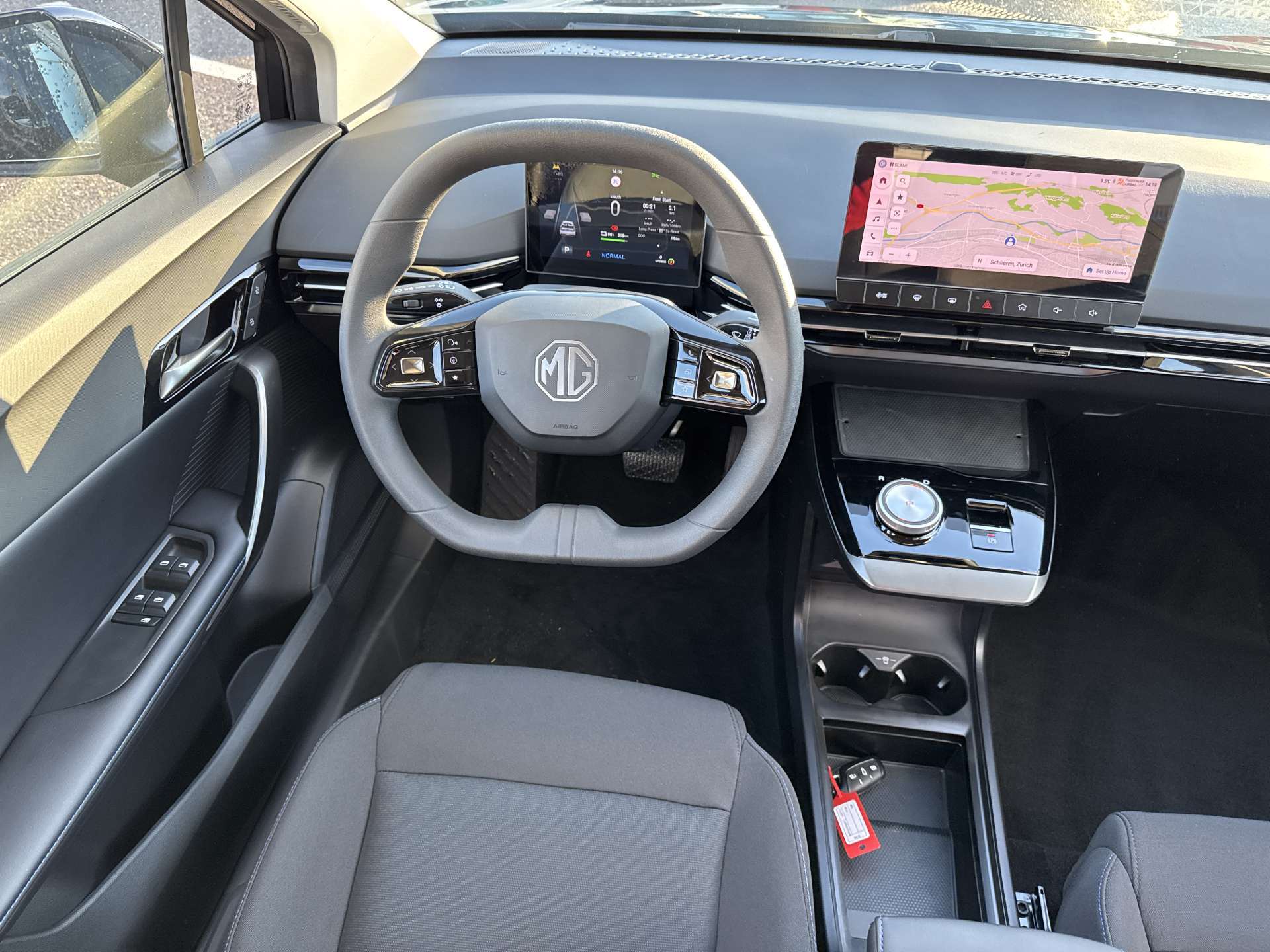 3-Punkt-Sicherheitsgurte auf allen Plätzen, Airbag: Airbag Fahrer und Beifahrer, Airbag: Kopfairbags vorne, Airbag: Seitenairbags, Antiblockiersystem (ABS), Assist: MG Pilot: ACC/TJA/FCW/AEB/IHC/SAS/LDW/LKA/UDW, Auto Start/Stop & Keyless Entry, Beheizbare Aussenspiegel, Elektrische Fensterheber vorne + hinten, ESP und TCS, Fahrwerk: "One Pedal"-Fahrmodus, Garantie: 7 Jahre oder 150'000 km, Getriebe: Direktantrieb, kein Getriebe, Heckscheiben-Wisch-/Waschanlage, Klima: Automatische Klimaanlage, Lackierung: Uni-Lackierung, Licht: Drittes Bremslicht, Licht: LED-Beleuchtung (Tagfahrlicht/Vorder-/Rücklicht), Licht: Nebelschlussleuchte, Media: 4 Lautsprecher, Media: Android Auto/Apple CarPlay, Media: Digital Cluster 7'', Media: iSMART Lite, Media: Touch Screen 10.25'', Polster: Stoff-Ausstattung, Räder: 17-Zoll-Leichtmetallfelgen, Reserverad, Servolenkung geschwindigkeitsabhängig, Sitze: 6-fach verstellbarer Fahrersitz, Sitze: Rücksitzbank umklappbar 60/40, Sonnenbrillenhalter, Vehicle to Load, Wegfahrsperre elektronisch, Zentralverriegelung mit Fernbedienung