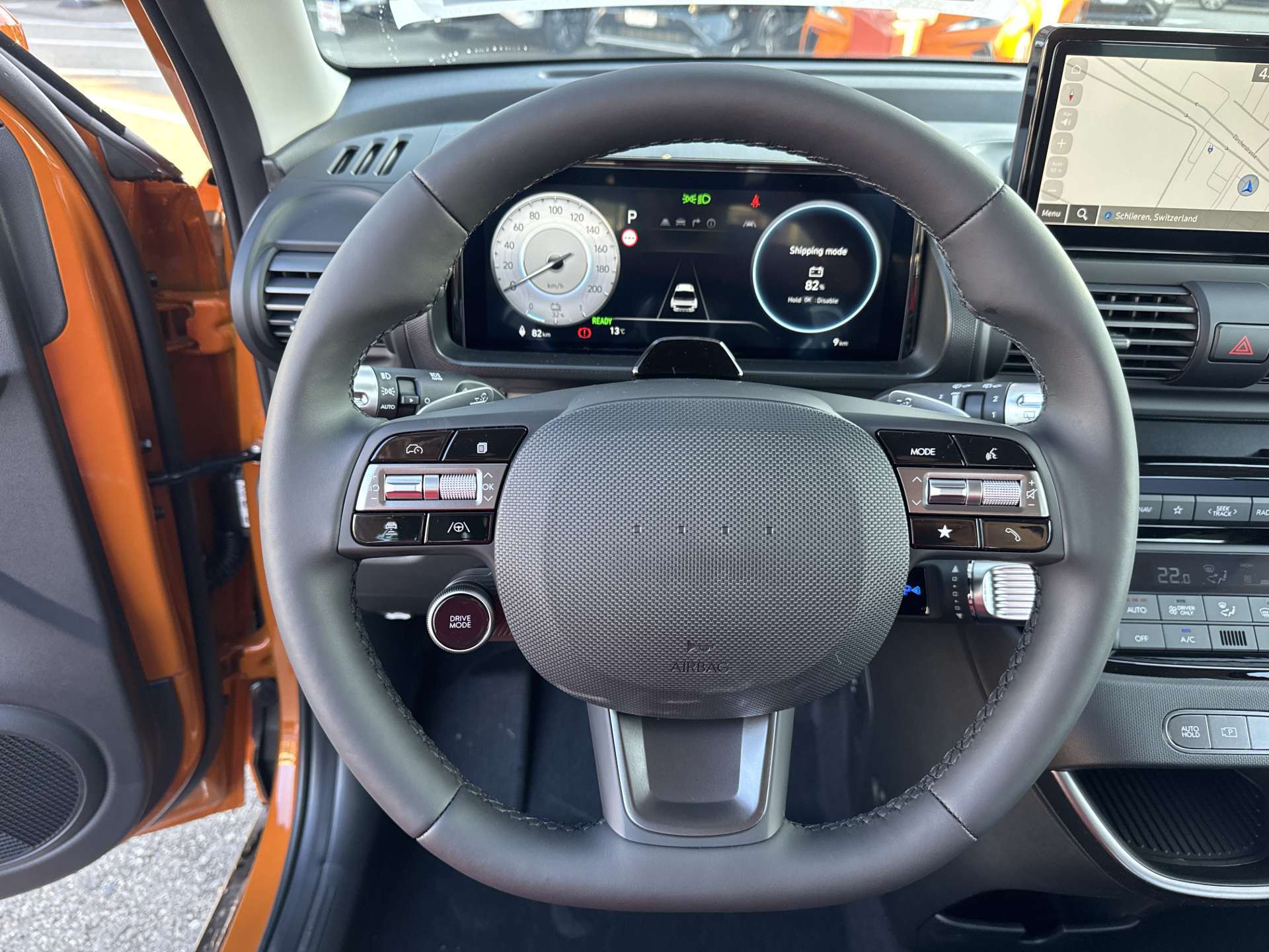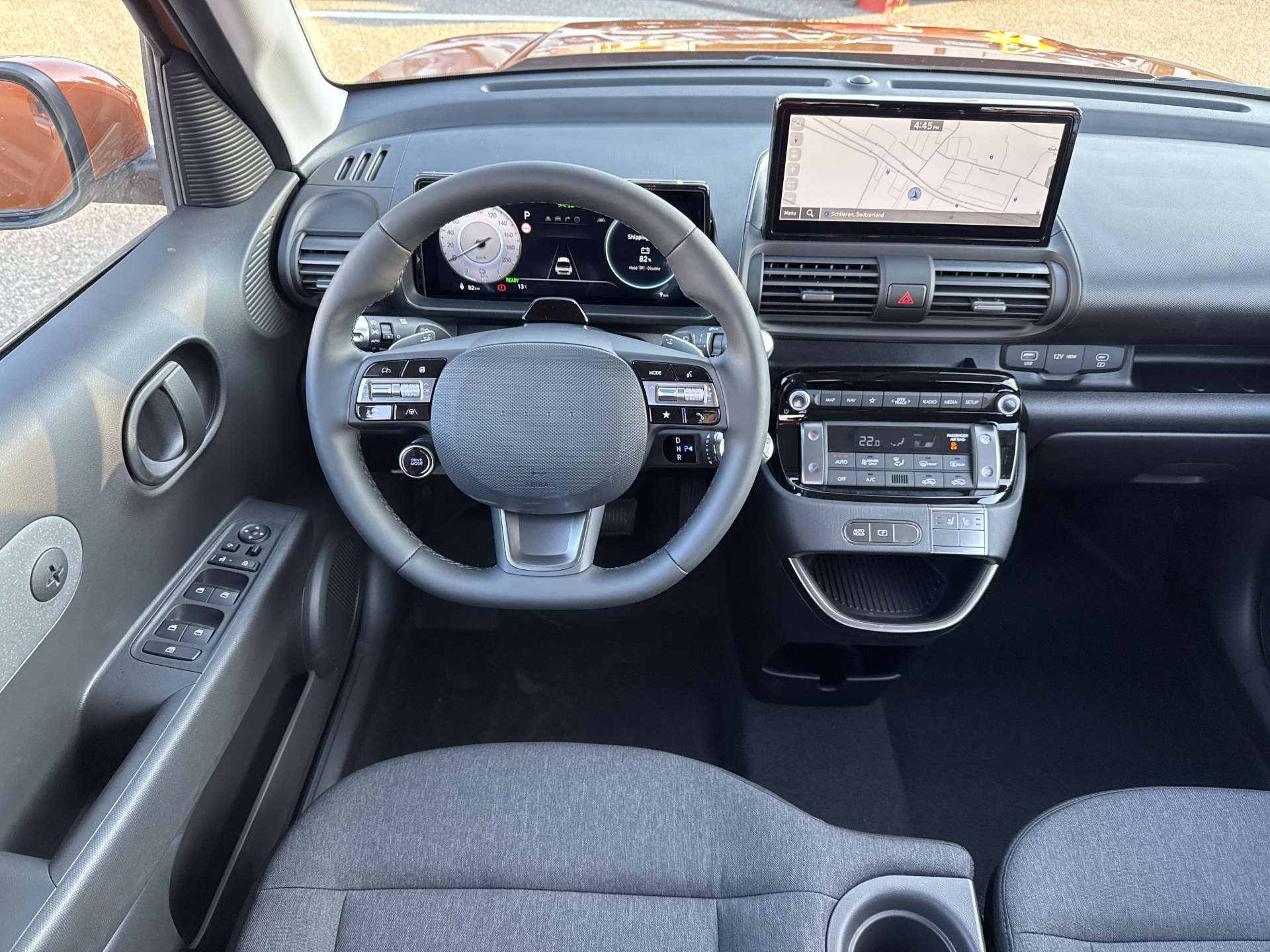 A-Säule in Wagenfarbe, Ablagefläche Fahrer- und Beifahrersitz (Rückseite), ABS mit elektronischer Bremskraftverteilung EBD, Airbag: Center Airbag vorne, Airbag: Deaktivierung Frontairbag Beifahrerseite, Airbag: Front- und Seitenairbags vorne, Vorhangairbags vorne und hinten, Assist: Anfahralarm Vorderfahrzeug, Assist: Aufmerksamkeitsassistent, Assist: Autobahn- und Stauassistent, Assist: Automatisches Notrufsystem eCall, Assist: Einparkhilfe hinten, Assist: Elektrische Parkbremse mit Auto-Hold-Funktion, Assist: Elektronische Traktionskontrolle, Assist: Notbremsassistent mit Abbiege-, Spurwechsel- und Ausweichfunktion, Assist: Notbremsassistent mit Fussgänger-/Fahrraderkennung und Abbiegefunktion, Assist: Rückfahrkamera, Assist: Spurhalteassistent, Assist: Tempomat mit Geschwindigkeitsbegrenzer, Drive Mode Select, Elektrisch einklappbare Aussenspiegel, Elektrisch verstell- und beheizbare Aussenspiegel, Elektronisches Stabilitätsprogramm ESP mit Multikollisionsbremse, Fensterheber vorne und hinten elektrisch, Garantie: 5 Jahre ohne Kilometerbegrenzung, Garantie: Garantie 12 Jahre gegen Durchrostung, Garantie: Hochvoltbatterie: 8 Jahre / 160 000 km, Gepäckraumbeleuchtung, Getriebe: Direktantrieb, kein Getriebe, Insassenalarm, ISOFIX-Kindersitzverankerung hinten, Klima: Klimaautomatik, Lackierung: Uni-Lackierung, Ladegerät (On-Board Charger) dreiphasig bis zu 11 kW, Ladekabel 5 Meter Mode 3 Typ 2, 3-Phasig, inkl. Hyundai-Tragtasche, Lenkrad: Audiofernbedienung am Lenkrad, Lenkrad: Lederlenkrad, Lenkrad: Lenkrad beheizbar, Lenkrad: Schaltwippen am Lenkrad mit i-Pedal Funktion, Licht: Fernlichtassistent, Licht: Halogen-Projektionsscheinwerfer, Licht: Halogen-Rückleuchten, Licht: LED Blinker, Licht: LED-Tagfahrlicht, Licht: Lichtautomatik, Make-up Spiegel Fahrer, Manuelle Heckklappe, Media: 4 Lautsprecher, Media: Android Auto - und Apple CarPlay -Funktion, Media: Digitale Armaturentafel mit 10.25'' TFT LCD Anzeige, Media: Digitalradio DAB+, Media: MapCare Lifetime / Over-the-Air Update, Media: Multi-Bluetooth mit Freisprecheinrichtung mit Spracherkennung, Media: Navigationssystem mit 10.25" Touchscreen, Media: Telematikdienst Bluelink Lite (10 Jahre gratis), Media: USB- Anschlüsse vorne, Polster: Stoffsitze, Räder: Reifendruckkontrollsystem, Räder: Reifenreparatur-Set, Räder: Stahlfelgen 15" mit Radzierblenden, Radlaufverkleidung in Schwarz, Servolenkung, Shift by wire, Sitze: Flach umklappbarer Fahrer- und Beifahrersitz, Sitze: Manuell höhenverstellbarer Fahrersitz, Sitze: Rücksitze getrennt abklappbar (50/50), Sitze: Sitzheizung vorne, Smart Key mit Engine Start/Stop-Taste und Bewegungssensor, Türgriffe und Aussenspiegel in Wagenfarbe, Unterfahrschutz silber, Vorbereitung für Anhängevorrichtung, Wärmedämmende Scheiben vorne, Zentralverriegelung