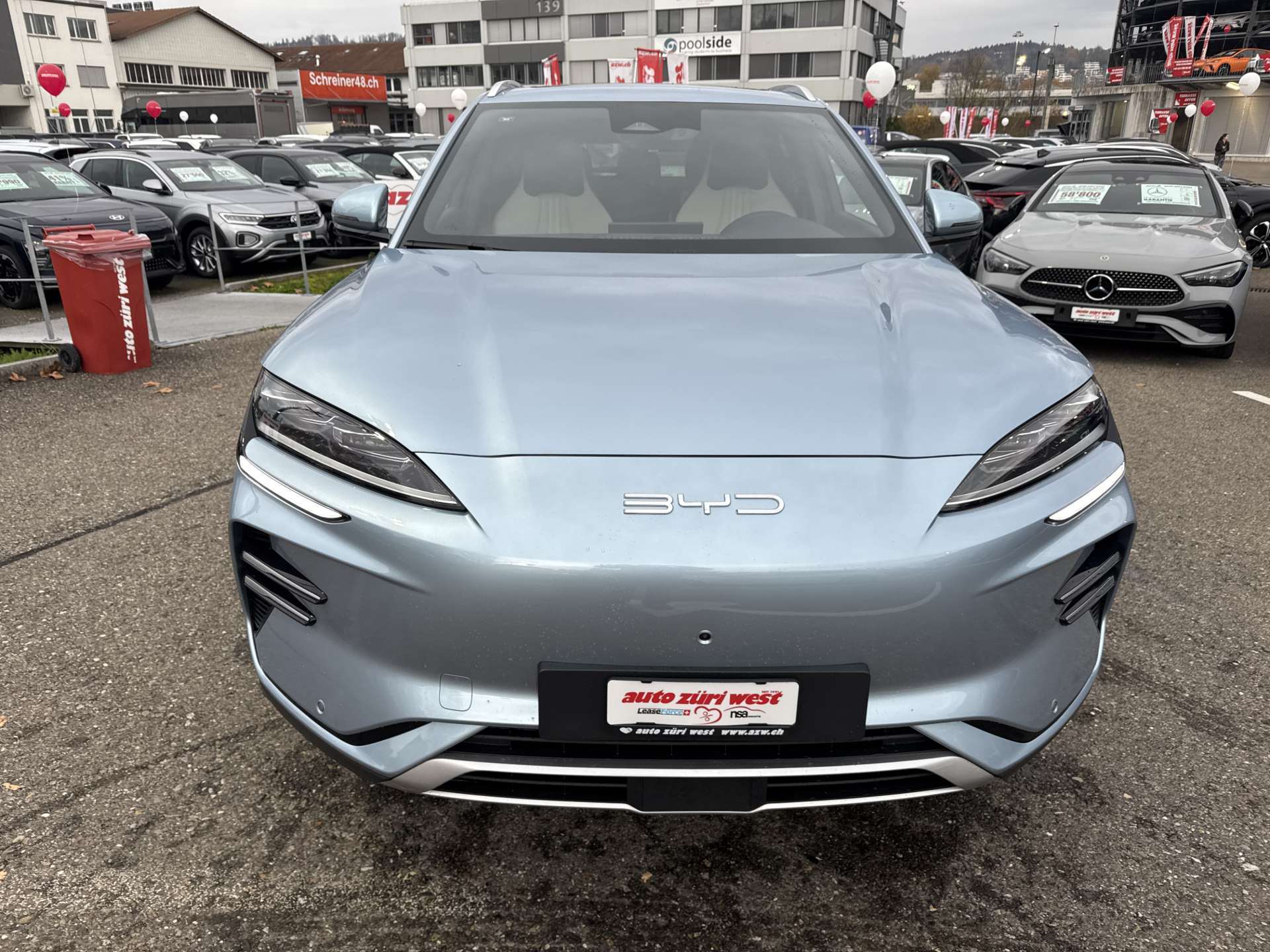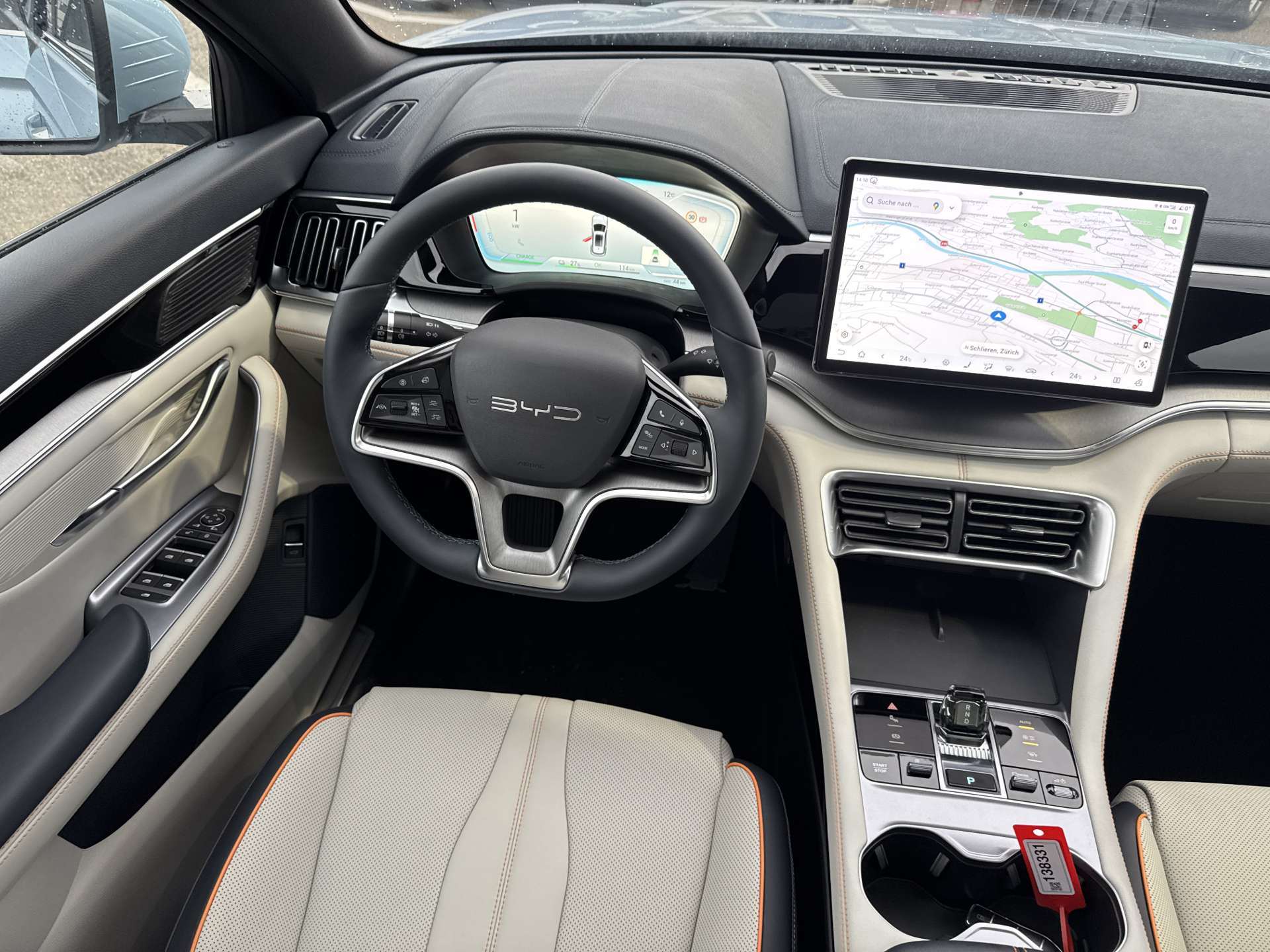 11kW On-Board Charger (OBC), 12-V-Stromanschluss, 2 x Smart Key, 4 x One-Touch-Fensterheber mit Einklemmschutzfunktion, Airbag: Fahrerairbag und Beifahrerairbag, Airbag: Frontairbag in der Mitte, Airbag: Seitenairbags vorn, Airbag: Vorhangairbags, Ambientebeleuchtung, mehrfarbig, Antiblockiersystem (ABS), Armlehne hinten, 2 Getränkehalter, Assist: Spurverlassenswarnung (LDW), Assist: 360° view camera, Assist: Adaptive Geschwindigkeitsregelung (ACC) & Intelligente Geschwindigkeitsregelung (ICC), Assist: Auto Hold, Assist: Automatische Notbremsung (AEB), Assist: Bergabfahrhilfe (HDC), Assist: Berganfahrassistent (HSA), Assist: Comfort Stop (CST), Assist: Elektrische Parkbremse (EPB), Assist: Heckkollisionswarnung (RCW), Assist: Hydraulischer Bremsassistent (HBA), Assist: Kindererkennung (CPD), Assist: Kontrollierte Verzögerung mit Feststellbremse (CDP), Assist: Müdigkeitserkennung für den Fahrer (DFW) und Aufmerksamkeitswarnung für den Fahrer (DFW), Assist: Parksensoren vorne und hinten, Assist: Querverkehrswarnung hinten (RCTA) & Querverkehrsbremse hinten (RCTB), Assist: Querverkehrswarnung vorn (FCTA) & Querverkehrsbremse vorn (FCTB), Assist: Spurhalteassistent (ELKA), Assist: Spurverlassensverhinderung (LDP), Assist: Spurwechselassistent (LCA), Assist: Toter-Winkel-Warnung (BSD), Assist: Traktionskontrolle (TCS), Assist: Überschlagskontrollsystem (RMI), Assist: Verkehrszeichenerkennung (TSR), Assist: Vorwärtskollisionswarnung (FCW), Aussenspiegel elektrisch verstellbar, elektrisch anklappbar, beheizbar, Automatisch abblendender Rückspiegel, Automatisches Verriegelungssystem, Bodenbeleuchtung vorne, Bremsüberbrückungssystem (BOS), Dachreling in Aluminium, Diebstahlsicherung, Dynamische Blinker, Elektrische Heckklappe, Elektronische Bremskraftverteilung (EBD), Elektronische Kindersicherung, ESP (Elektronisches Stabilitätsprogramm), Fahrmodus: Eco, Normal, Sport, Snow, Fahrwerk: Fahrdynamikregelung (VDC), Frontscheibe, Scheibenwischer mit Regensensor, Frontscheibe, UV-Schutz, Wärmedämmung, Schalldämmung, Fussraumbeleuchtung in den Aussenspiegeln, Garantie: Batterie-Garantie 8 Jahre oder 200'000 km, Garantie: Garantie 6 Jahre oder 150'000 km, Gepäckraumleuchte, Getriebe: Direktantrieb, kein Getriebe, Head-up-Display (HUD), ISOFIX und i-Size, Beifahrer- und äussere Rücksitze, Keyless entry & keyless start, Kindersicherung manuell, Klima: Belüftungsdüsen hinten, Kofferraum-Gepäckablage, Kraftbegrenzender Sicherheitsgurt auf dem mittleren Rücksitz, Lackierung: Metallic-Lackierung, LED-Leseleuchten hinten, LED-Leseleuchten vorn, Licht: Fernlichtassistent (HMA), Licht: Follow-me-Home, Licht: LED-Rückleuchten, Licht: LED-Scheinwerfer, automatisches Ein-/Ausschalten, Licht: LED-Tagfahrlicht, Licht: Nebelschlussleuchten, Media: 12,3" TFT-LCD-Instrumententafel, Media: 15,6" elektrisch drehbarer Touchscreen, Media: Android Auto & Apple CarPlay, Media: DAB+ & FM, Media: Infinity-Soundsystem, 10 Lautsprecher, Media: Integrierte 4G-Konnektivität2, Media: Intelligente Sprachsteuerung "Hallo, BYD", Media: Smartphone wireless charging, 2x 15 W, Media: USB-Anschlüsse hinten: 1 x 18W Typ C, 1 x 60 W Typ C, Media: USB-Anschlüsse vorn: 1 x 18W Typ C, 1 x 60 W Typ C, Mehrfarbige LED-Ladeanzeige, Mittelarmlehne hinten, 2 Getränkehalter, Mittelarmlehne vorn, 2 Getränkehalter, Notruf, Panoramadach, elektrisch verstellbares Sonnenschutzrollo, PM2.5 filter, PM2.5-Luftreinigungssystem, Privacy glass in fond, Räder: 19" Bicolor- Leichtmetallfelgen, Reifendruckkontrolle (TPMS), Servolenkung, Sitze: Beifahrersitz belüftet, beheizt, Sitze: Beifahrersitz, elektrisch verstellbar, 4-fach, Sitze: Fahrersitz belüftet, beheizt, gespeicherte Einstellung, Sitze: Fahrersitz und Beifahrer, integrierte Kopfstütze, Sitze: Fahrersitz, elektrisch verstellbar, 8-fach, Positionsspeicher, Sitze: Rücksitze 40:60 geteilt umklappbar, Sitze: Rücksitze, manuell einstellbare Kopfstütze, Türöffnungswarnung (DOW), Vier LED-Türleuchten, Vordersitz-Sonnenblenden mit beleuchtetem Schminkspiegel, Vorgespannte und kraftbegrenzende Sicherheitsgurte vorn, Wärmepumpe