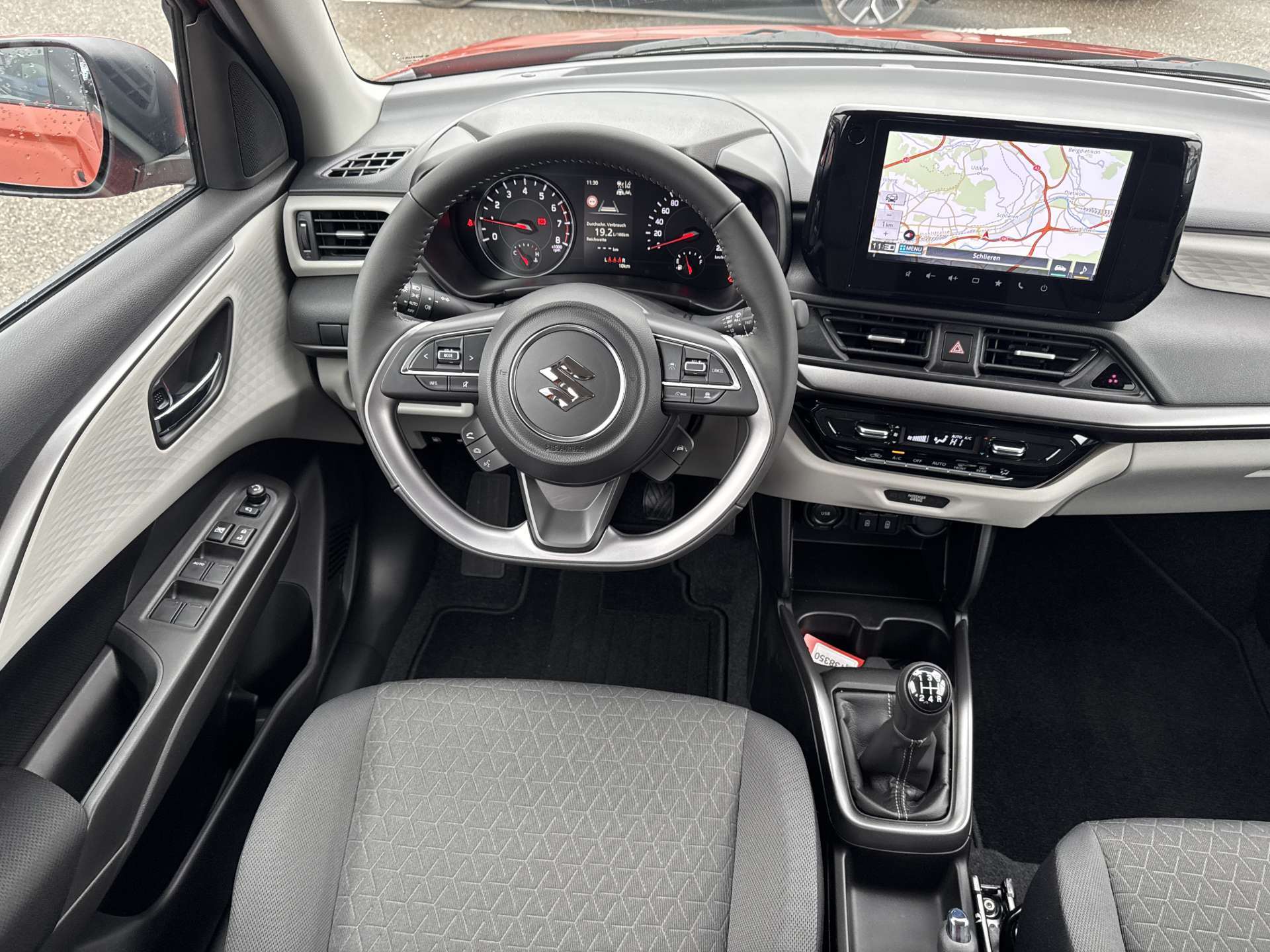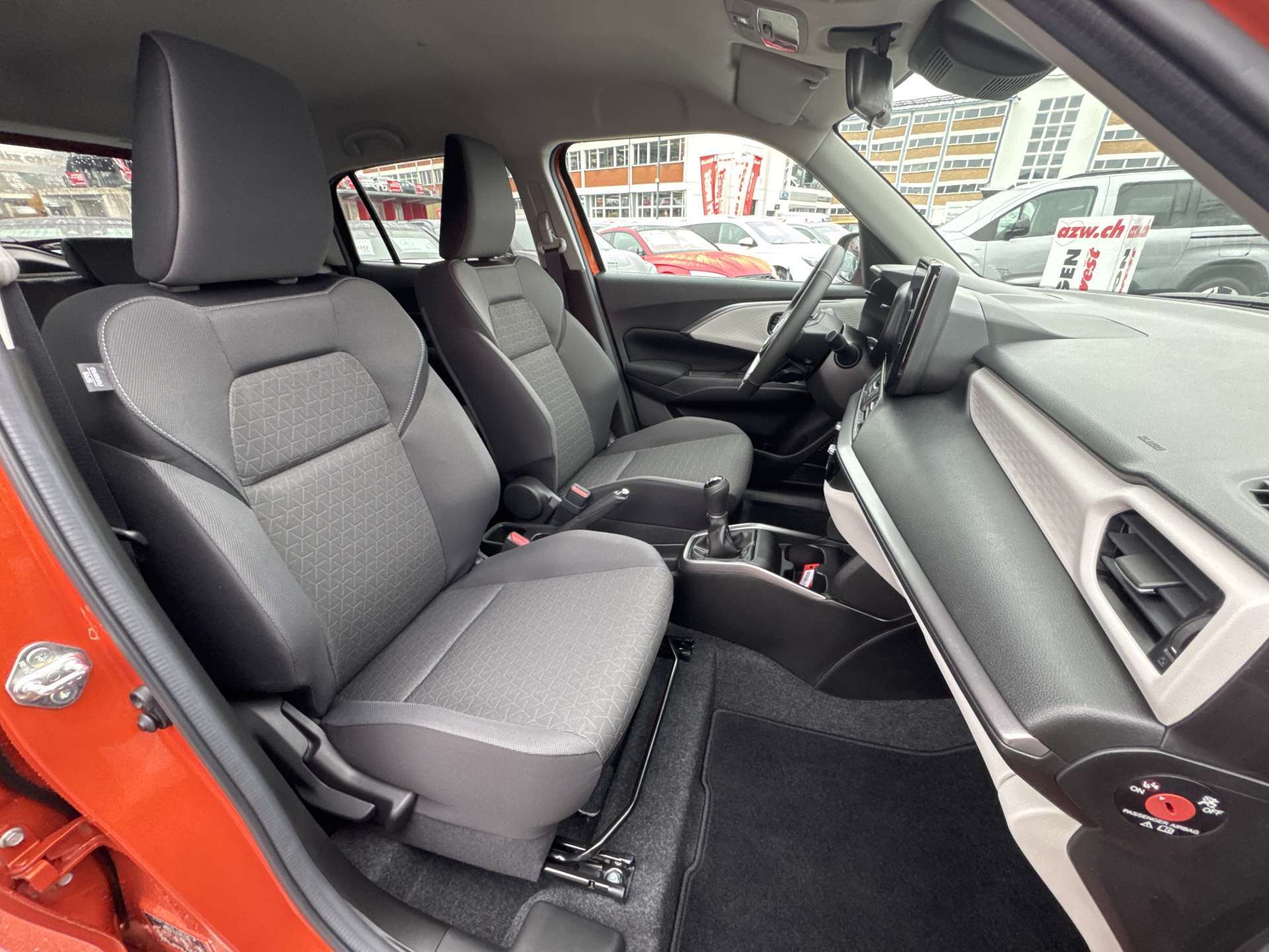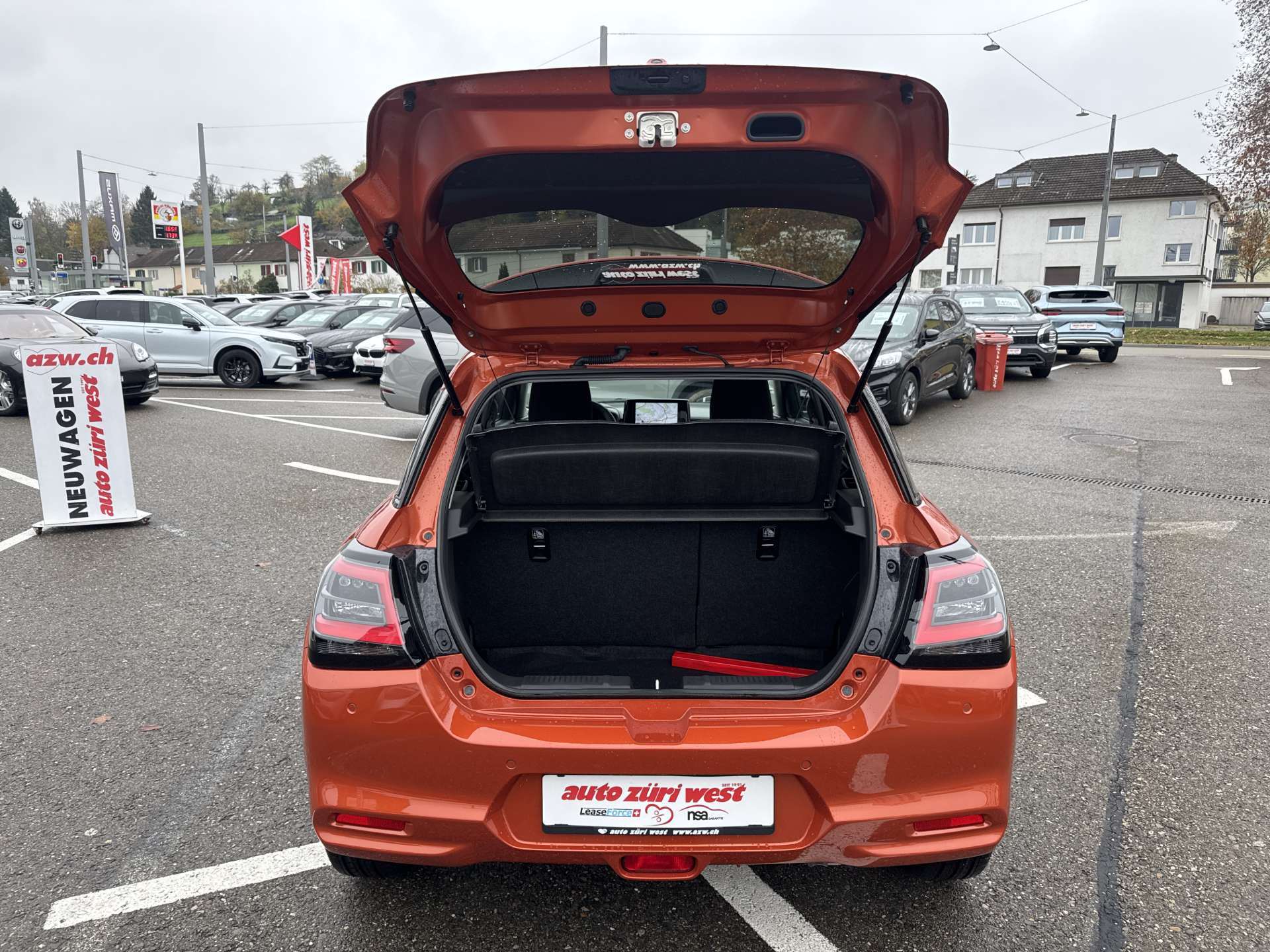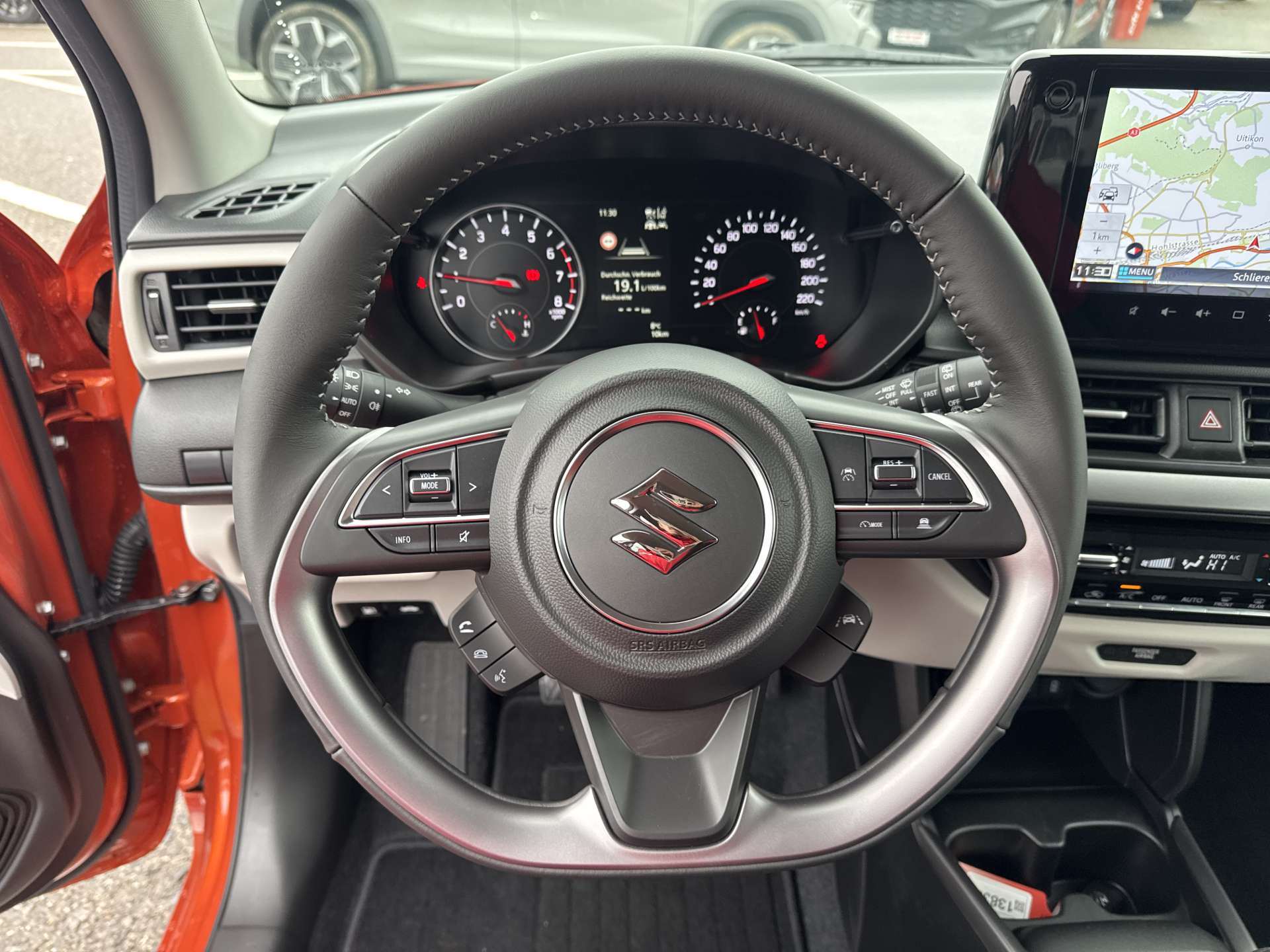 12 Volt-Steckdose, ABS mit elektronischer Bremskraftverteilung und Bremsassistent, Airbag: Airbag für Fahrer und Beifahrer (Beifahrerseite deaktivierbar), Airbag: Seitenairbags vorne, Airbag: Vorhangairbags, Assist: Adaptiver Tempomat, Assist: Berganfahrhilfe, Assist: eCall, Assist: Fahrerüberwachungssystem (DMS), Assist: Intelligenter Geschwindigkeitsassistent (ISA), Assist: Notbremssystem mit Kollisionswarner, Assist: Parksensoren hinten (akustisch), Assist: Querverkehrswarner hinten, Assist: Rückfahrkamera, Assist: Spurhalteassistent, Assist: Spurleitassistent, Assist: Spurwechselassistent, Assist: Verkehrszeichenerkennung, Assist: Warnsystem für Müdigkeit und Aufmerksamkeit, Aussenspiegel mit integriertem Blinker, Aussenspiegel und Türgriffe in Wagenfarbe, Bodenteppiche, Dreipunkt-Sicherheitsgurte auf allen Plätzen, Elektrisch einklappbare Aussenspiegel, Elektrisch verstell- und heizbare Aussenspiegel, Elektrische Fensterheber vorne + hinten, ESP mit Traktionskontrolle, Garantie: 3 Jahre oder 100'000 km, Getriebe: 5-Gang-Getriebe, Gurtstraffer und Gurtkraftbegrenzer auf allen Plätzen, Heckspoiler, ISOFIX-Kindersitzverankerung, Keyless Start (schlüsselloses Einsteigen und Starten), Klima: Klimaautomatik mit Pollenfilter, Lackierung: Metallic-Lackierung Flame Orange Pearl Metallic, LCD Multifunktionsfarbdisplay, Lenkrad: Bedientasten am Lenkrad für Audio und Telefon, Lenkrad: Lederlenkrad, Lenkrad: Lenkrad längs- und höhenverstellbar, Licht: Fernlicht-Assistent, Licht: Guide-me-home Funktion, Licht: LED Abblendlicht und Fernlicht, Licht: LED-Tagfahrlicht, Licht: Lichtautomatik, Licht: Nebelschlussleuchte, Media: 6 Lautsprecher, Media: 9 Zoll Touchscreen-Multimediasystem mit Smartphone-Anbindung, Bluetooth und DAB+, Media: USB-Anschluss (1x USB-A + 1x USB-C), Media: USB-Anschluss für externe Audioquellen, Polster: Stoff-Ausstattung, Privacy Glass, Räder: Leichtmetallfelgen 16J, Räder: Reifendruck-Kontrollanzeige, Servolenkung, Sitze: Fahrersitz höhenverstellbar, Sitze: Rücksitzlehne separat umklappbar (60/40), Sitze: Sitzheizung vorne, Sonnenblenden vorne mit Schminkspiegel (Beifahrerseite), Sonnenblenden vorne mit Schminkspiegel (Fahrerseite), Start-/Stopp-Automatik, Suzuki Connect App (3 Jahre kostenlos), Wegfahrsperre elektronisch, Zentralverriegelung mit Fernbedienung
