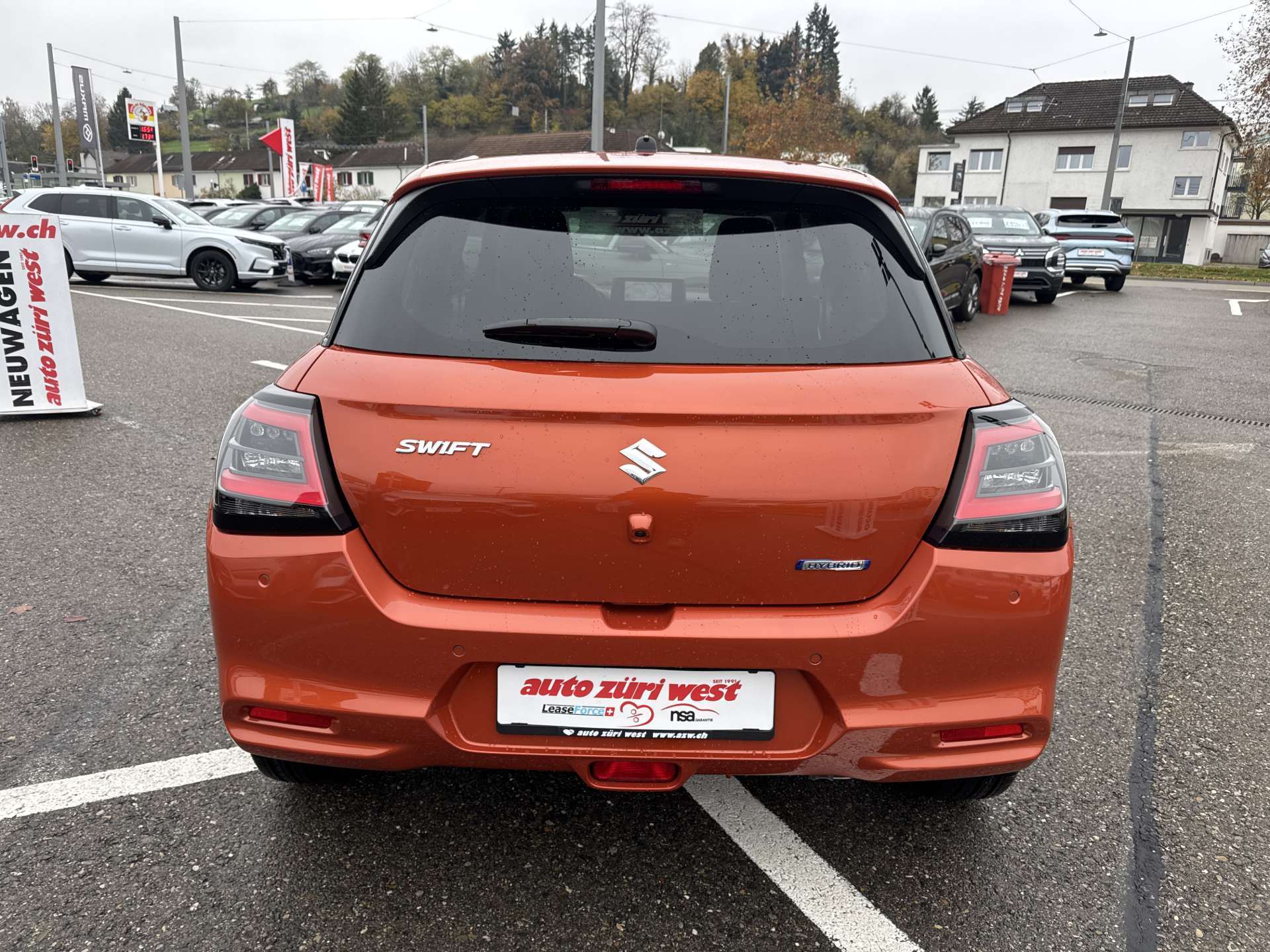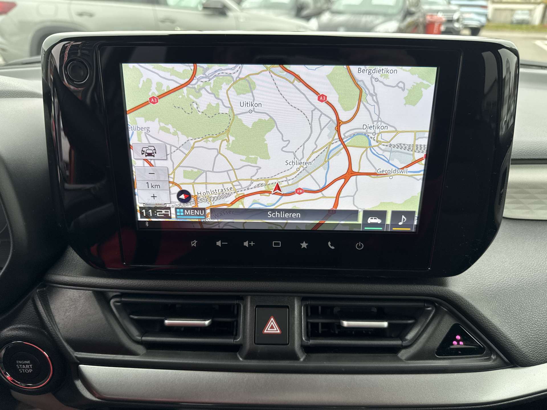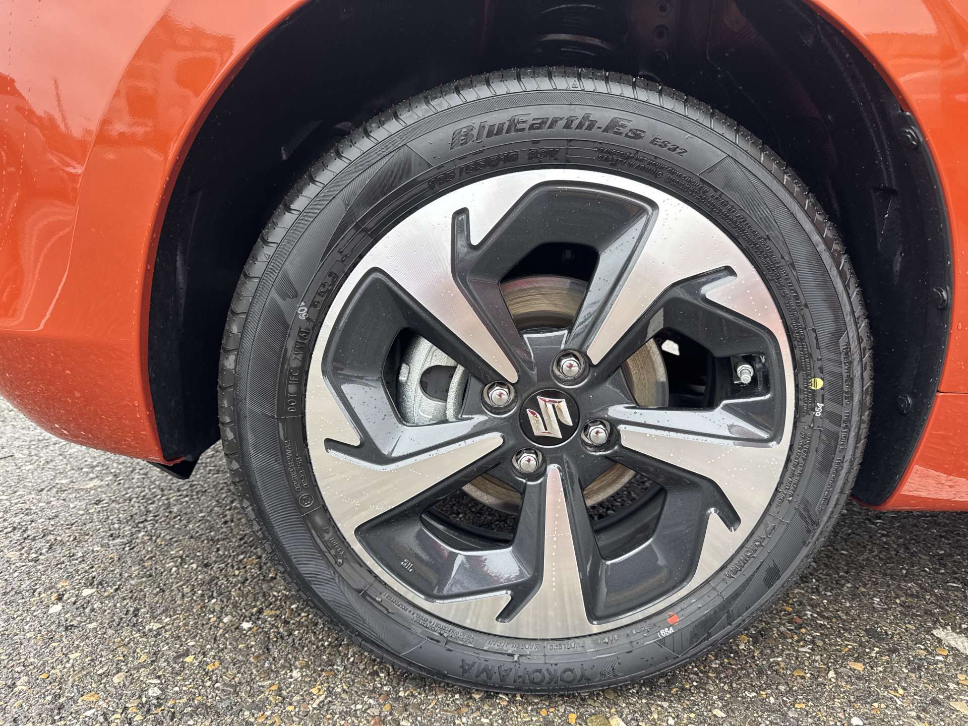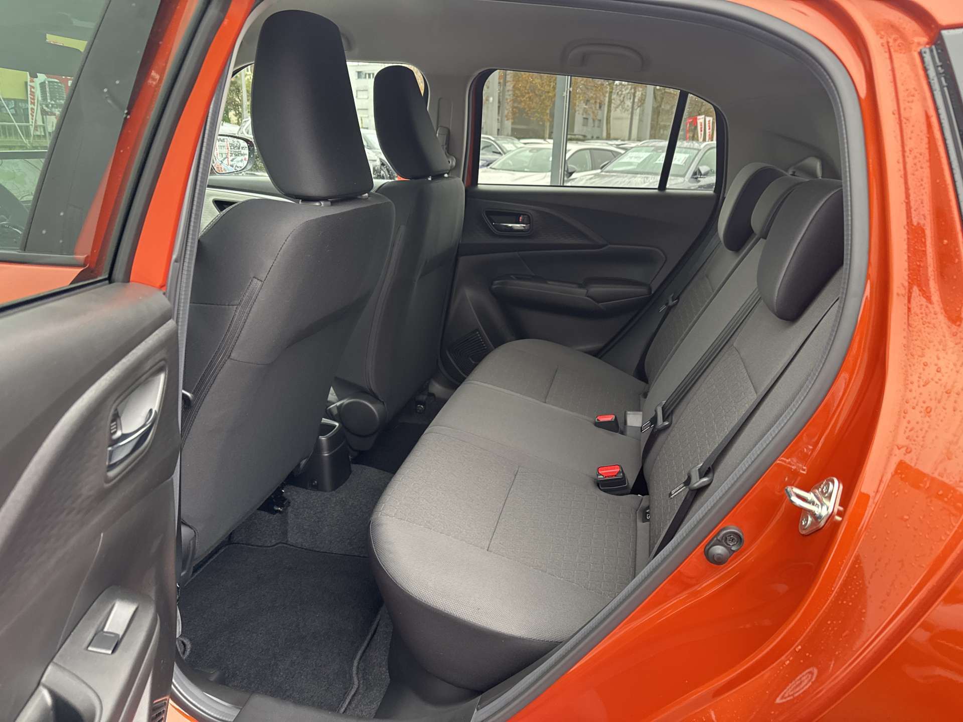 12 Volt-Steckdose, ABS mit elektronischer Bremskraftverteilung und Bremsassistent, Airbag: Airbag für Fahrer und Beifahrer (Beifahrerseite deaktivierbar), Airbag: Seitenairbags vorne, Airbag: Vorhangairbags, Assist: Adaptiver Tempomat, Assist: Berganfahrhilfe, Assist: eCall, Assist: Fahrerüberwachungssystem (DMS), Assist: Intelligenter Geschwindigkeitsassistent (ISA), Assist: Notbremssystem mit Kollisionswarner, Assist: Parksensoren hinten (akustisch), Assist: Querverkehrswarner hinten, Assist: Rückfahrkamera, Assist: Spurhalteassistent, Assist: Spurleitassistent, Assist: Spurwechselassistent, Assist: Verkehrszeichenerkennung, Assist: Warnsystem für Müdigkeit und Aufmerksamkeit, Aussenspiegel mit integriertem Blinker, Aussenspiegel und Türgriffe in Wagenfarbe, Bodenteppiche, Dreipunkt-Sicherheitsgurte auf allen Plätzen, Elektrisch einklappbare Aussenspiegel, Elektrisch verstell- und heizbare Aussenspiegel, Elektrische Fensterheber vorne + hinten, ESP mit Traktionskontrolle, Garantie: 3 Jahre oder 100'000 km, Getriebe: 5-Gang-Getriebe, Gurtstraffer und Gurtkraftbegrenzer auf allen Plätzen, Heckspoiler, ISOFIX-Kindersitzverankerung, Keyless Start (schlüsselloses Einsteigen und Starten), Klima: Klimaautomatik mit Pollenfilter, Lackierung: Metallic-Lackierung Flame Orange Pearl Metallic, LCD Multifunktionsfarbdisplay, Lenkrad: Bedientasten am Lenkrad für Audio und Telefon, Lenkrad: Lederlenkrad, Lenkrad: Lenkrad längs- und höhenverstellbar, Licht: Fernlicht-Assistent, Licht: Guide-me-home Funktion, Licht: LED Abblendlicht und Fernlicht, Licht: LED-Tagfahrlicht, Licht: Lichtautomatik, Licht: Nebelschlussleuchte, Media: 6 Lautsprecher, Media: 9 Zoll Touchscreen-Multimediasystem mit Smartphone-Anbindung, Bluetooth und DAB+, Media: USB-Anschluss (1x USB-A + 1x USB-C), Media: USB-Anschluss für externe Audioquellen, Polster: Stoff-Ausstattung, Privacy Glass, Räder: Leichtmetallfelgen 16J, Räder: Reifendruck-Kontrollanzeige, Servolenkung, Sitze: Fahrersitz höhenverstellbar, Sitze: Rücksitzlehne separat umklappbar (60/40), Sitze: Sitzheizung vorne, Sonnenblenden vorne mit Schminkspiegel (Beifahrerseite), Sonnenblenden vorne mit Schminkspiegel (Fahrerseite), Start-/Stopp-Automatik, Suzuki Connect App (3 Jahre kostenlos), Wegfahrsperre elektronisch, Zentralverriegelung mit Fernbedienung