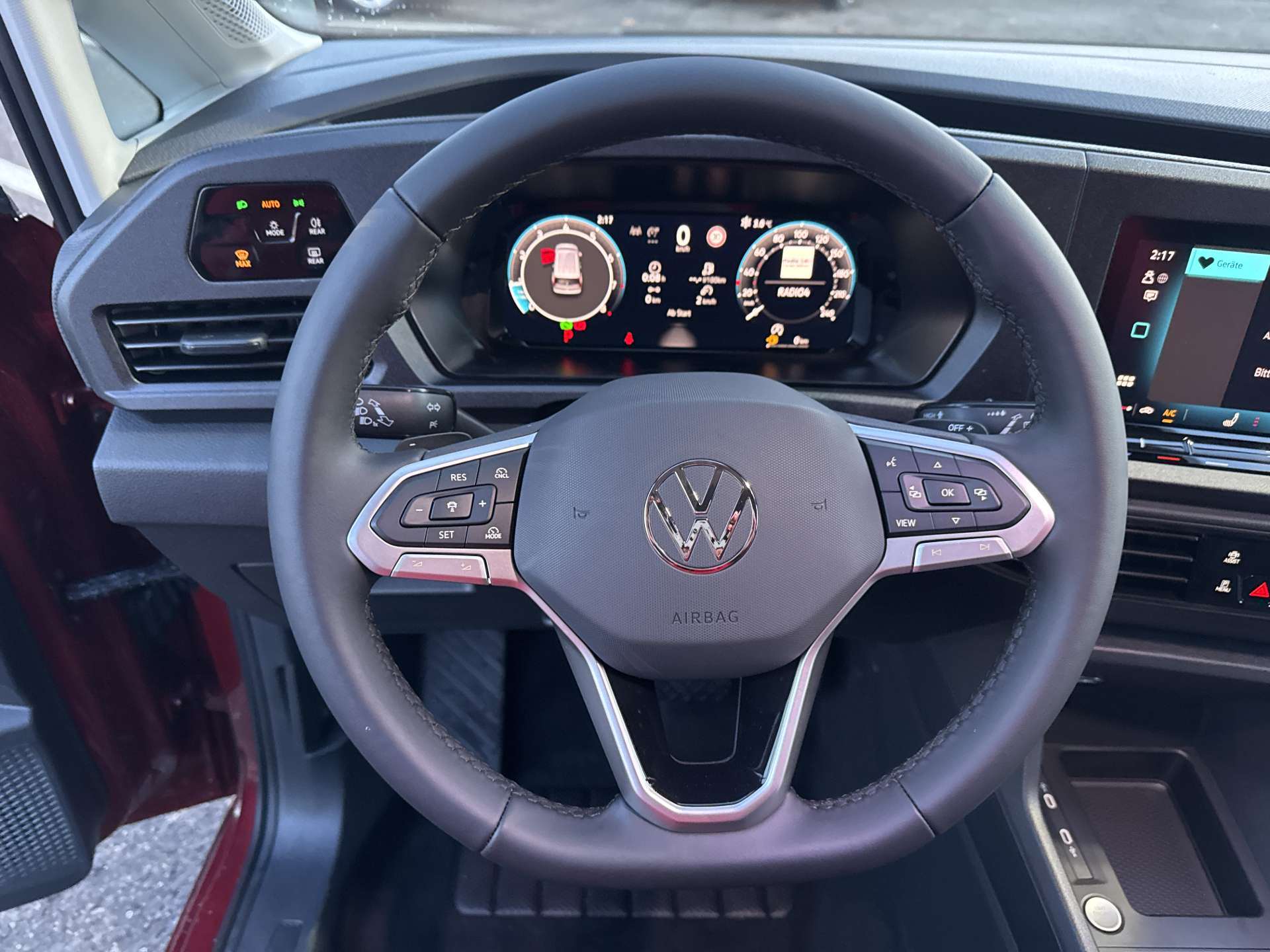12 Volt Steckdose im Kofferraum, 2. Schlüssel mit Funkfernbedienung, 4 feste Fenster im Fahrgastraum, 4 Verzurrösen im Fahrgastraum, 8 Befestigungspunkte für Dachträger, Abblendbarer Innenspiegel, Ablagefächer in den Fahrerhaus- und Schiebetüren, Airbag: Airbags für Fahrer und Beifahrer, mit Beifahrer-Airbag-Deaktivierung, Airbag: Seiten- und Kopfairbag für Fahrer und Beifahrer, Kopfairbags für die äusseren Sitzplätze, Assist: Abbiegeassistent und Ausweichunterstützung, Assist: Aufmerksamkeits- & Müdigkeitsassistent, Assist: Automatische Distanzregelung, Assist: Einparkhilfe im Heckbereich, Assist: Geschwindigkeitsregelanlage, Assist: Kreuzungsassistent, Assist: Mit prädiktiven Speedlimiter (pLIM), Assist: Multifunktionskamera, Assist: Notbremsassistent "Front Assist" mit Fussgänger- und Radfahrererkennung, Assist: Spurhalteassistent Lane Assist, Assist: Spurwechselassistent "Side Assist" inkl. Blind Spot Detection und Ausparkassistent, Assist: Verkehrszeichenerkennung, Aussenspiegel elektrisch einstellbar, beheizbar und anklappbar, Aussenspiegelgehäuse in schwarz lackiert, Türgriffe in Wagenfarbe und Schiebetürschiene in silber, Bewegungsenergierückführung, Bordcomputer, Cockpit-Blende matt, Dachgalerie im Fahrerhaus, Drehzahlmesser, Dreipunkt-Automatiksicherheitsgurte vorne und hinten, vorne mit Gurtstraffer, Elektronische Wegfahrsperre, ESP, elektr. Stabilitätsprogramm mit ABS, EDS, ASR und MSR, Fensterheber elektrisch, Gepäckraumabdeckung, klappbar, Geschwindigkeitsabhängige Servolenkung, Getriebe: 7-Gang Getriebe automatisiert, Handschuhfach mit Beleuchtung, Heckklappe verglast inkl., Isofix und Top Tether auf äusseren Sitzen in der 2. Sitzreihe, Kindersicherung für Schiebetüren, Klima: Klimaanlage, Kopfstützen hinten höhenverstellbar, Kopfstützen vorne höhenverstellbar, Lackierung: Uni-Lackierung, LED Leseleuchten im Fahrgastraum, Lenkrad: Lenkradsperre, Lenkrad: Lenksäule in Höhe und Länge verstellbar, Lenkrad: Multifunktionslenkrad in Leder mit Schaltwippen, Licht: Drittes Bremslicht, Licht: Halogen-Hauptscheinwerfer, Licht: Leuchtweitenregulierung, Licht: Nebelschlussleuchte, Licht: Tagfahrlicht, Luftausströmer, vorn in mattem Schwarz, Make-up Spiegel vorn, Media: Digital Cockpit mit 10,25 Zoll-Farbdisplay, ohne Navigations-Informationen, Media: Digitaler Radioempfang DAB+, Media: Multifunktionsanzeige Plus, Media: Ohne Navigationsgerät, Media: Radio "Composition" mit 10" Touch-Farbdisplay, Media: Radio Composition mit 10" Touch-Farbdisplay, Media: USB Typ-C Datenbuchsen und Ladebuchsen mit erhöhter Ladeleistung (Leistung: 45W), Media: Vorbereitet für Online Dienste, Media: Vorbereitet für VW Connect und VW Connect Plus, Mittelarmlehne vorn, höhen- und längsverstellbar mit 2 Getränkehaltern vorn, Motor-/Start-Stopp, Ohne Dachgalerie im Fahrerhaus, Ohne Schriftzüge für Typ-/ Modellbezeichnung, Paket: 7-Sitzer, Polster: Sitzbezüge in Stoff, Dessin "Double Grid", Räder: 16" Stahlräder 6,5x16J in schwarz, Räder: 4 Stahlfelgen in schwarz 6,5 x 16, Räder: Radlaufspoiler, Räder: Radvollblenden für Stahlräder, Räder: Reifenkontrollanzeige, Räder: Rollwiderstandsoptimierte Reifen, Räder: Tire Mobility Set (12-Volt-Kompressor und Reifendichtmittel), Scheibenwischer-Intervallschaltung mit Lichtsensor, Schiebetüre links und rechts, Sitze: 2 Einzelsitze in der 3. Sitzreihe, Sitze: 3er-Sitzbank in der 2. Sitzreihe (klapp-, wickel- und herausnehmbar), Sitze: Beifahrersitz vorn längsverstellbar, Sitze: Fahrersitz längs- und höhenverstellbar, Stossstangen in Wagenfarbe, Teppichboden vorne und hinten, Vorbereitung für Alkoholtester (Alcohol Interlock), Wärmeschutzverglasung, Zentralverriegelung mit Funkfernbedienung und Innenbetätigung