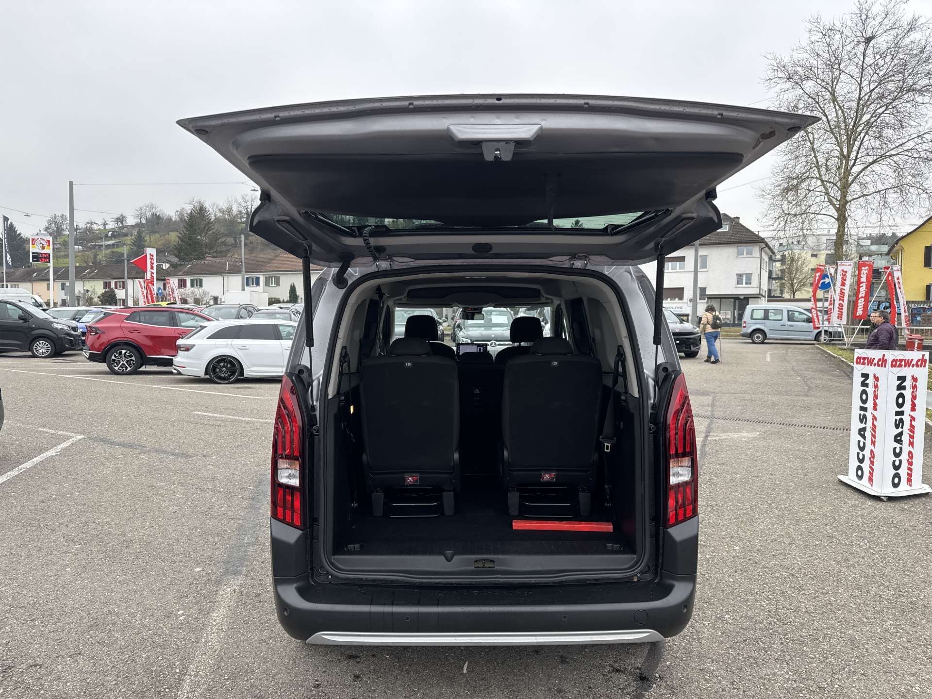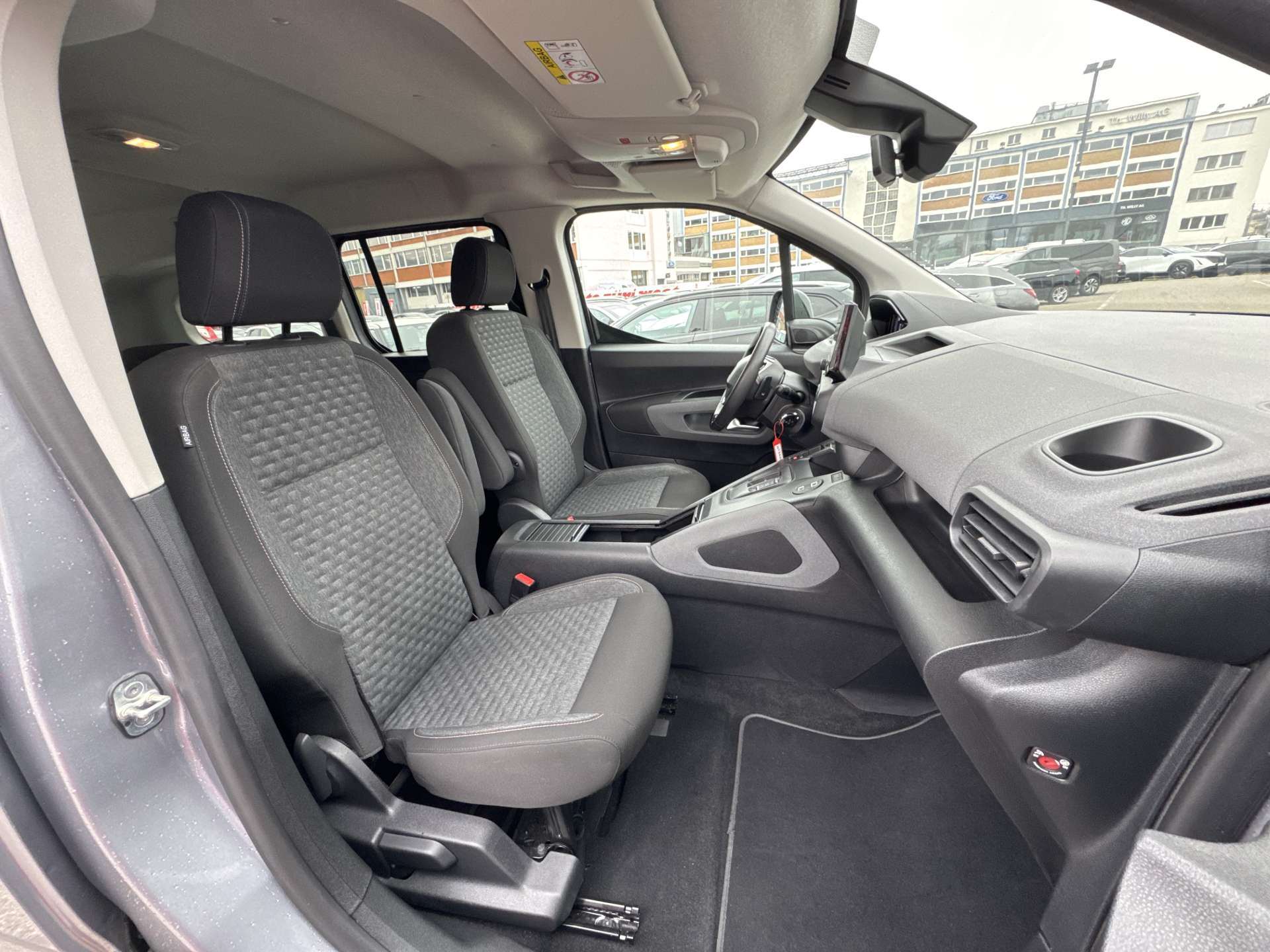 , 2 x 3-Tasten-Fernbedienung, 3-Punkt-Sicherheitsgurte auf allen Plätzen, 4 Lasthalteösen im Kofferraumboden, Ablagefach im Kabinendach, Absenkbaren Seitenfenstern in den Schiebetüren in Reihe 2, Airbag: Front- und Seitenairbags auf der Fahrer-, Assist: Adaptiver Geschwindigkeitsregler mit Stop & GO-Funktion, Assist: Autonomes Notbremssystem mit Erkennung von Fussgängern und Radfahrern, Assist: Einparkhilfe hinten, Assist: Erweitere Verkehrszeichenerkennung, Assist: Müdigkeitswarner, Assist: Spurzentrierungs-Assistent, Assist: Visiopark 180, Aufrollbare Kofferraumabdeckung, Aussenspiegel elektrisch, beheizbar und anklappbar, Aussenspiegelgehäuse schwarz brillant, Beheizbare Heckscheibe mit Scheibenwischer, Bordcomputer, Dachreling, Drehzahlmesser, Elektrische Fensterheber mit Schnellabsenkung vorne und in Reihe 2, Elektrische Kindersicherung, ESP : ABS (Antiblockiersystem) + ESC (Electronic Stability Control) + ASR, Festellbremse elektrisch, Feststehenden Fenstern in Reihe 3, Fussmatten und GT-Abzeichen, Getriebe: 8-Stufen-Automat sequentiell, Handschuhfach mit Kühlfunktion, Heckklappe mit separat zu öffnender Heckscheibe, Hohe Konsole mit Speicher, USB-Anschluss, Klima: 2-Zonen-Klimaautomatik und Gebläse für die Klimaanlage in der 2. Reihe, Lackierung: Matte Lackierung, Lenkrad: GT-Lenkrad, Lenkrad: Lederlenkrad mit Heizung, Lenkrad: Lenkrad in Hohe und Tiefe verstellbar, Licht- und Regensensor, Licht: Drittes Bremslicht, Licht: Fernlichtassistent, Licht: Halogenscheinwerfer, Licht: Nebelscheinwerfer + 3-Krallen-eco-LED-Tagfahrlicht, Licht: Nebelschlussleuchte, Media: 2 USB-Anschlüsse Type C (1x Laden und 1x Daten), Media: Bluetooth, Media: Farbiges 10'' HD TFT-Zentraldisplay, Media: Farbiges 10'' HD-Touchscreen, DAB+ Radio, Media: Mirror Screen Funktion (Apple Carplay/Android Auto), Peugeot Connect SOS & Assistenz, Peugeot i-Cockpit (Head-up-Digitalinstrument, kompaktes Lenkrad und Touchscreen), Polster: Stoff-Ausstattung, Räder: 17-Zoll-Leichtmetallfelgen AORAKI, glanzgedreht, Räder: Indirekte Reifenluftdruckkontrolle, Räder: Notfallsatz für Reifenpannen, Scheiben in Reihe 2 und 3 und Heckscheibe stärker getönt, Schlüsselloses Zugangs- und Startsystem, Schwarz lackierter Kühlergrill, Seitenschutzeinsätze Grau, Seitliche Schiebetür links manuell, Seitliche Schiebetür rechts manuell, Servolenkung, Sitze: 3 versenkbare Einzelsitze in Reihe 2 mit Isofix-Befestigung für jeden Sitzplatz, Sitze: Beifahrersitz umklappbar in Länge und Neigung verstellbar, Sitze: Fahrersitz in Länge, Höhe und Neigung verstellbar mit manuellen Lendenwirbelstütze,, Stossfängerblende vorne und hinten Grau Aluminé, System Magic Wash Premium (Frontscheibenwischer mit integrierten Scheibenwaschdüsen), Türgriffe aussen und hintere Nummernschildblende in Wagenfarbe lackiert, Türgriffe Satin Chrom, Wegfahrsperre elektronisch, Zentralverriegelung von innen aktivierbar, mit Funkfernbedienung