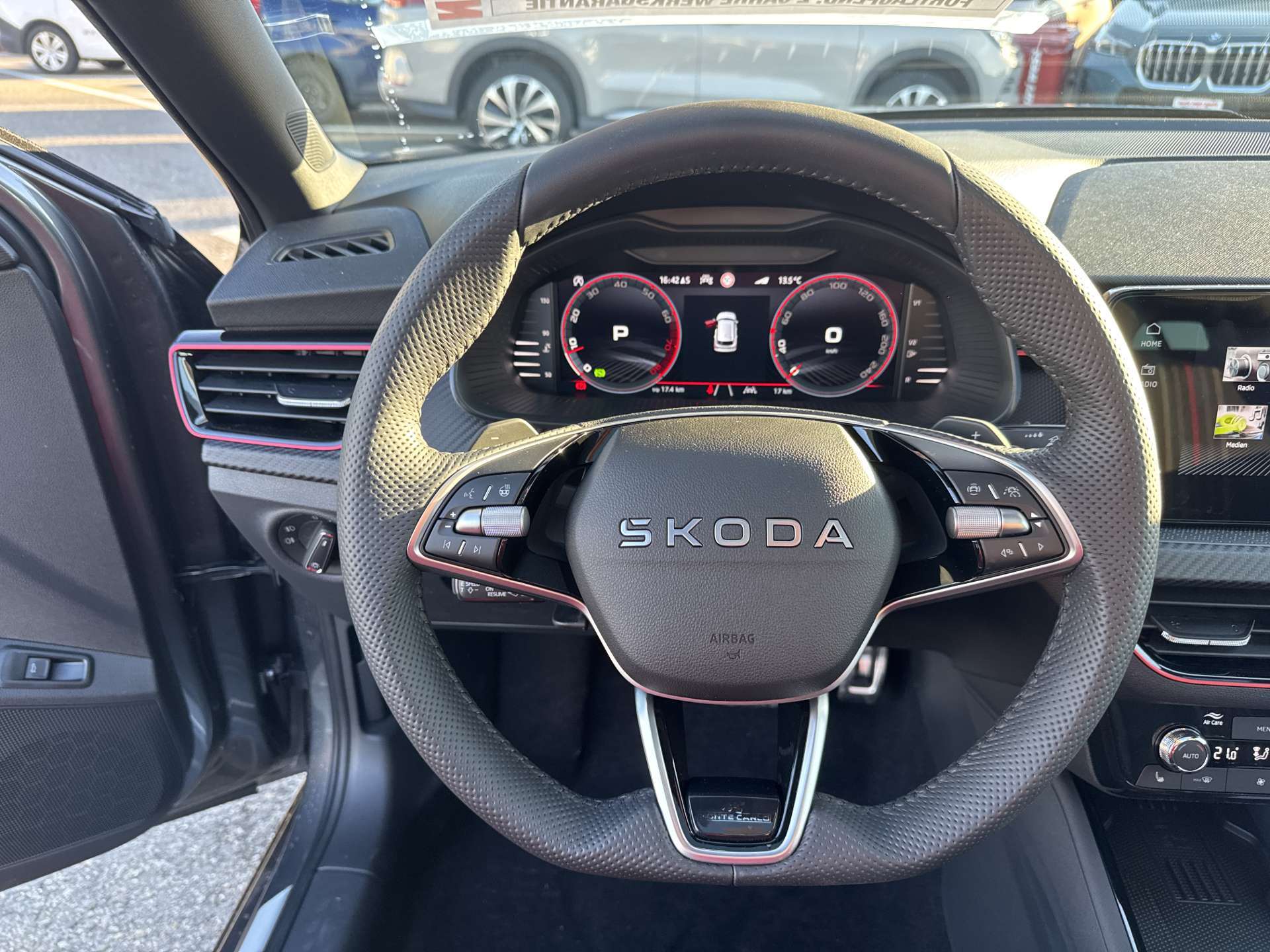 3-Punkt-Sicherheitsgurte auf allen Plätzen, ABS mit ASR und EDS, Airbag: Airbag Beifahrer deaktivierbar, Airbag: Airbag Fahrer und Beifahrer, Airbag: Kopf- und Seitenairbags vorne, Airbag: Kopf- und Seitenairbags vorne, Ambiente Beleuchtung 2-farbig, Assist: Ablenkungs- und Müdigkeitserkennung, Assist: Berganfahrassistent, Assist: Front Assistant inkl. City-Notbremsfunktion, Assist: Geschwindigkeitsregelanlage (Tempomat), Assist: Parksensoren hinten, Assist: Regensensor mit Lichtassistent (Coming Home, Leaving Home, Tunnel Light), Assist: Spurhalteassistent "Lane Assist", Assist: Verkehrszeichenerkennung, Aussenspiegel elektrisch einstell-, beheiz- und anklappbar, automatische Abblendung Fahrerseite, Aussenspiegel in schwarz lackiert, Aussenspiegel rechts und links beheizbar und elektrisch verstellbar, Chromrahmen am Kühlergrill, Dachhimmel schwarz, Dachreling schwarz-lackiert, Design Monte Carlo, Drehzahlmesser, Drittes Bremslicht LED, EASY START, Elektrische Fensterheber vorne + hinten, Elektronisches Stabilitäts-Programm (ESP), Emergency Call (Notruf), Emergency Call (Notruf), ESC (Elektronische Stabilisierungskontrolle) mit Multikollisionsbremse, ABS und ASR, Fahrprofilauswahl "Driving Mode Selection", Getriebe: 7-Gang DSG, Gurtanlegesignalisation für alle Passagiere, Heckscheiben-Wisch-/Waschanlage, Heckscheibenheizung, Innenspiegel automatisch abblendbar, Klappbare Gepäckhaken im Kofferraum, Klima: Klimaanlage "Climatronic", 2-Zonen-Temperaturregelung, vollautomatisch, getrennt regelbar, Kühlergrill schwarz lackiert, Lackierung: Uni-Lackierung, Lenkrad: 3-Speichen-Sport-Leder-Multifunktionslenkrad mit Schaltwippen (DSG), Licht: Easy Light Assist (automatische Lichtschaltung, Coming Home, Leaving Home), Licht: LED Rückleuchten mit dynamischer Blinkleuchte, Licht: LED-Tagfahrlicht, Licht: Nebelscheinwerfer mit Cornering-Funktion, Licht: Voll-LED-Matrix-Scheinwerfer und AFS (Adaptive Frontlight System), Media: 2 USB-C Anschlüsse im Fond, Media: 2 USB-C Anschlüsse vorne, Media: 4 zusätzliche Lausprecher hinten, Media: 4 zusätzliche Lausprecher hinten, Media: DAB - Digitaler Radioempfang, Media: Skoda Infotainment 8.25", Media: SmartLink (CarPlay und Android Auto), Media: Telefonvorbereitung mit Bluetooth, Mittelarmlehne hinten mit Doppel Getränkehalter und ohne Durchladefunktion, Mittelarmlehne hinten mit Doppel Getränkehalter und ohne Durchladefunktion, Mittelarmlehne vorne inkl. grosser Jumbo-Box, Paket: Black Paket, Paket: Light and View Plus Paket, Paket: Open Sky Paket, Paket: Winter Paket, Panoramadach, Polster: Sportsitzbezüge Stoff schwarz, teilweise Carbon-Optik und roten und grauen Streifen, Räder: Pannenset (Kompressor und Flasche mit Dichtmittel, ohne Reserverad), Räder: Reifendruckkontrollsystem, Seitliche Luftführungen im Stossfänger vorne schwarz lackiert, Servolenkung, Sitze: 3 Kopfstützen hinten, Sitze: ISOFIX-Vorbereitung und Top-Tether, Sitze: Rücksitzlehne geteilt umklappbar (60:40), Sitze: Vordersitze heizbar, Sitze: Vordersitze höhenverstellbar, SunSet (Heckscheibe und hintere Seitenscheiben dunkel getönt), SunSet (Heckscheibe und hintere Seitenscheiben dunkel getönt), Textilfussmatten vorne und hinten, Türgriffe aussen in Wagenfarbe, Virtuelles Cockpit Plus, Virtuelles Cockpit Plus, Waschwasser-Standanzeige, Wegfahrsperre elektronisch