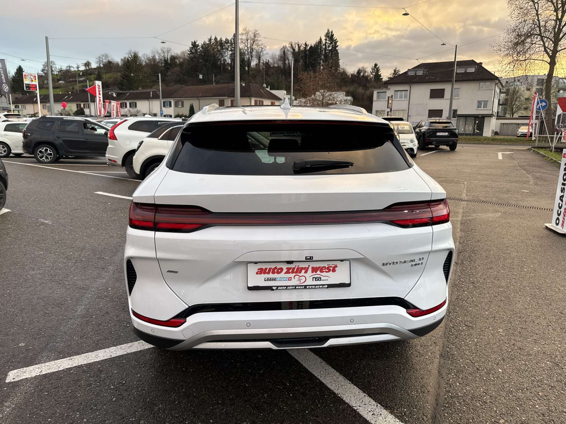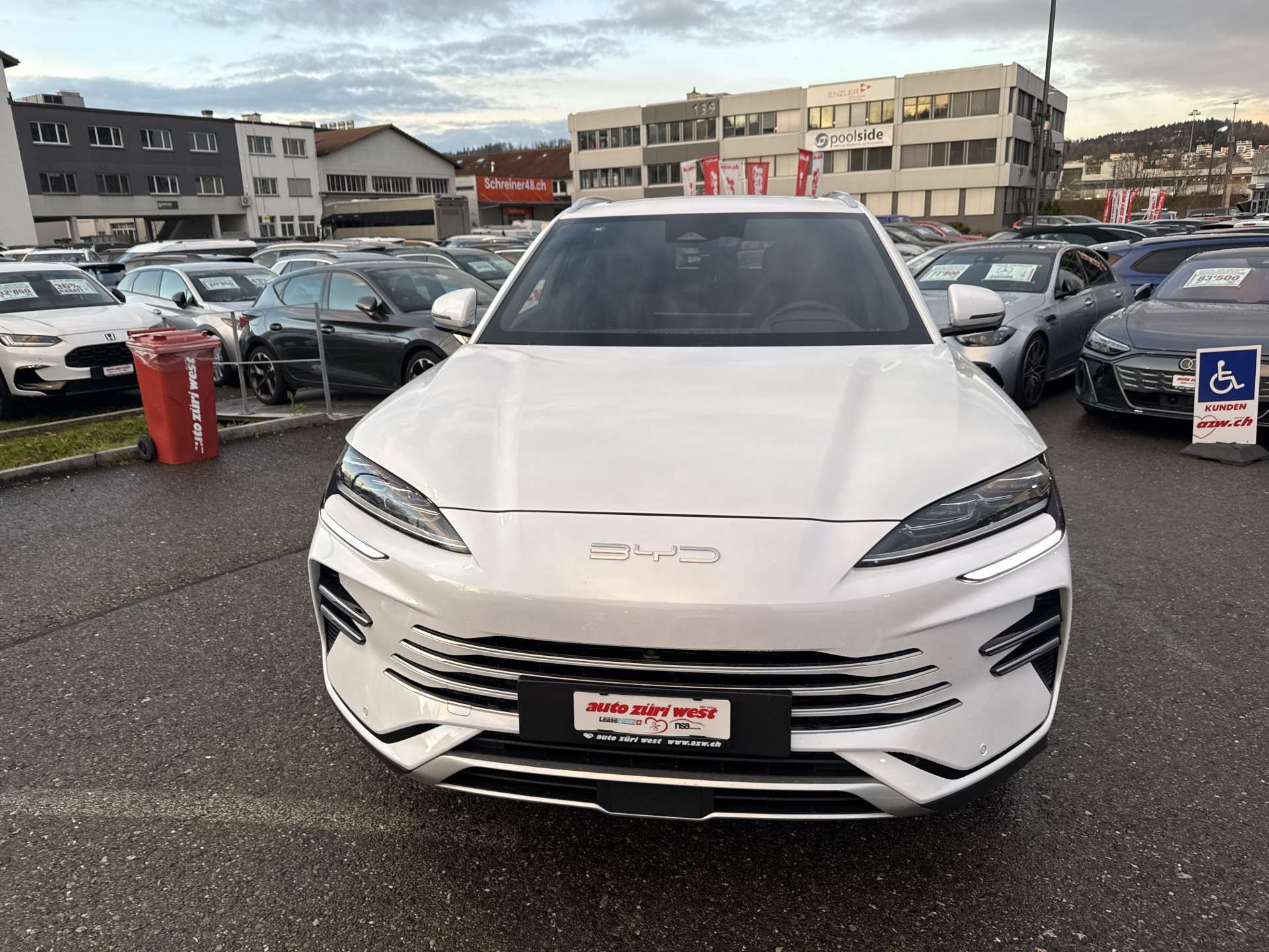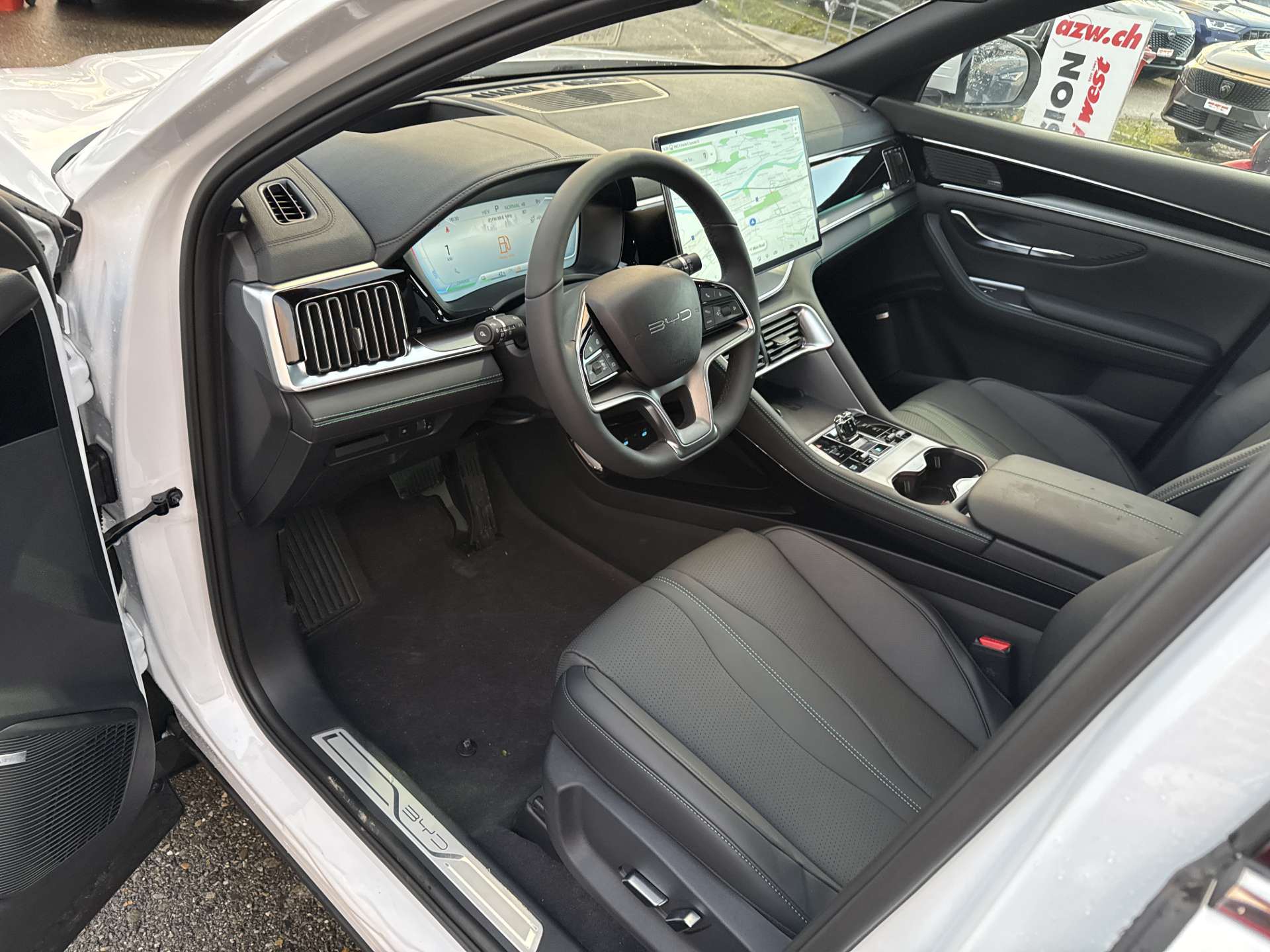 11kW On-Board Charger (OBC), 12-V-Stromanschluss, 2 x Smart Key, 4 x One-Touch-Fensterheber mit Einklemmschutzfunktion, Airbag: Fahrerairbag und Beifahrerairbag, Airbag: Frontairbag in der Mitte, Airbag: Seitenairbags vorn, Airbag: Vorhangairbags, Ambientebeleuchtung, mehrfarbig, Antiblockiersystem (ABS), Armlehne hinten, 2 Getränkehalter, Assist: 360° view camera, Assist: Adaptive Geschwindigkeitsregelung (ACC) & Intelligente Geschwindigkeitsregelung (ICC), Assist: Auto Hold, Assist: Automatische Notbremsung (AEB), Assist: Bergabfahrhilfe (HDC), Assist: Berganfahrassistent (HSA), Assist: Comfort Stop (CST), Assist: Elektrische Parkbremse (EPB), Assist: Heckkollisionswarnung (RCW), Assist: Hydraulischer Bremsassistent (HBA), Assist: Kindererkennung (CPD), Assist: Kontrollierte Verzögerung mit Feststellbremse (CDP), Assist: Müdigkeitserkennung für den Fahrer (DFW) und Aufmerksamkeitswarnung für den Fahrer (DFW), Assist: Parksensoren vorne und hinten, Assist: Querverkehrswarnung hinten (RCTA) & Querverkehrsbremse hinten (RCTB), Assist: Querverkehrswarnung vorn (FCTA) & Querverkehrsbremse vorn (FCTB), Assist: Spurhalteassistent (ELKA), Assist: Spurverlassensverhinderung (LDP), Assist: Spurverlassenswarnung (LDW), Assist: Spurwechselassistent (LCA), Assist: Toter-Winkel-Warnung (BSD), Assist: Traktionskontrolle (TCS), Assist: Überschlagskontrollsystem (RMI), Assist: Verkehrszeichenerkennung (TSR), Assist: Vorwärtskollisionswarnung (FCW), Aussenspiegel elektrisch verstellbar, elektrisch anklappbar, beheizbar, Automatisch abblendender Rückspiegel, Automatisches Verriegelungssystem, Bodenbeleuchtung vorne, Bremsüberbrückungssystem (BOS), Dachreling in Aluminium, Diebstahlsicherung, Dynamische Blinker, Elektrische Heckklappe, Elektronische Bremskraftverteilung (EBD), Elektronische Kindersicherung, ESP (Elektronisches Stabilitätsprogramm), Fahrmodus: Eco, Normal, Sport, Snow, Sand, Muddy, Fahrwerk: Fahrdynamikregelung (VDC), Frontscheibe, Scheibenwischer mit Regensensor, Frontscheibe, UV-Schutz, Wärmedämmung, Schalldämmung, Fussraumbeleuchtung in den Aussenspiegeln, Garantie: Batterie-Garantie 8 Jahre oder 200'000 km, Garantie: Garantie 6 Jahre oder 150'000 km, Gepäckraumleuchte, Getriebe: Direktantrieb, kein Getriebe, Head-up-Display (HUD), ISOFIX und i-Size, Beifahrer- und äussere Rücksitze, Keyless entry & keyless start, Kindersicherung manuell, Klima: Belüftungsdüsen hinten, Kofferraum-Gepäckablage, Kraftbegrenzender Sicherheitsgurt auf dem mittleren Rücksitz, Lackierung: Metallic-Lackierung, LED-Leseleuchten hinten, LED-Leseleuchten vorn, Licht: Fernlichtassistent (HMA), Licht: Follow-me-Home, Licht: LED-Rückleuchten, Licht: LED-Scheinwerfer, automatisches Ein-/Ausschalten, Licht: LED-Tagfahrlicht, Licht: Nebelschlussleuchten, Media: 12,3" TFT-LCD-Instrumententafel, Media: 15,6" elektrisch drehbarer Touchscreen, Media: Android Auto & Apple CarPlay, Media: DAB+ & FM, Media: Infinity-Soundsystem, 10 Lautsprecher, Media: Integrierte 4G-Konnektivität2, Media: Intelligente Sprachsteuerung "Hallo, BYD", Media: Smartphone wireless charging, 2x 15 W, Media: USB-Anschlüsse hinten: 1 x 18W Typ C, 1 x 60 W Typ C, Media: USB-Anschlüsse vorn: 1 x 18W Typ C, 1 x 60 W Typ C, Mehrfarbige LED-Ladeanzeige, Mittelarmlehne hinten, 2 Getränkehalter, Mittelarmlehne vorn, 2 Getränkehalter, Notruf, Panoramadach, elektrisch verstellbares Sonnenschutzrollo, PM2.5 filter, PM2.5-Luftreinigungssystem, Privacy glass in fond, Räder: 19" Bicolor- Leichtmetallfelgen, Reifendruckkontrolle (TPMS), Servolenkung, Sitze: Beifahrersitz belüftet, beheizt, Sitze: Beifahrersitz, elektrisch verstellbar, 4-fach, Sitze: Fahrersitz belüftet, beheizt, gespeicherte Einstellung, Sitze: Fahrersitz und Beifahrer, integrierte Kopfstütze, Sitze: Fahrersitz, elektrisch verstellbar, 8-fach, Positionsspeicher, Sitze: Rücksitze 40:60 geteilt umklappbar, Sitze: Rücksitze, manuell einstellbare Kopfstütze, Türöffnungswarnung (DOW), Vier LED-Türleuchten, Vordersitz-Sonnenblenden mit beleuchtetem Schminkspiegel, Vorgespannte und kraftbegrenzende Sicherheitsgurte vorn, Wärmepumpe