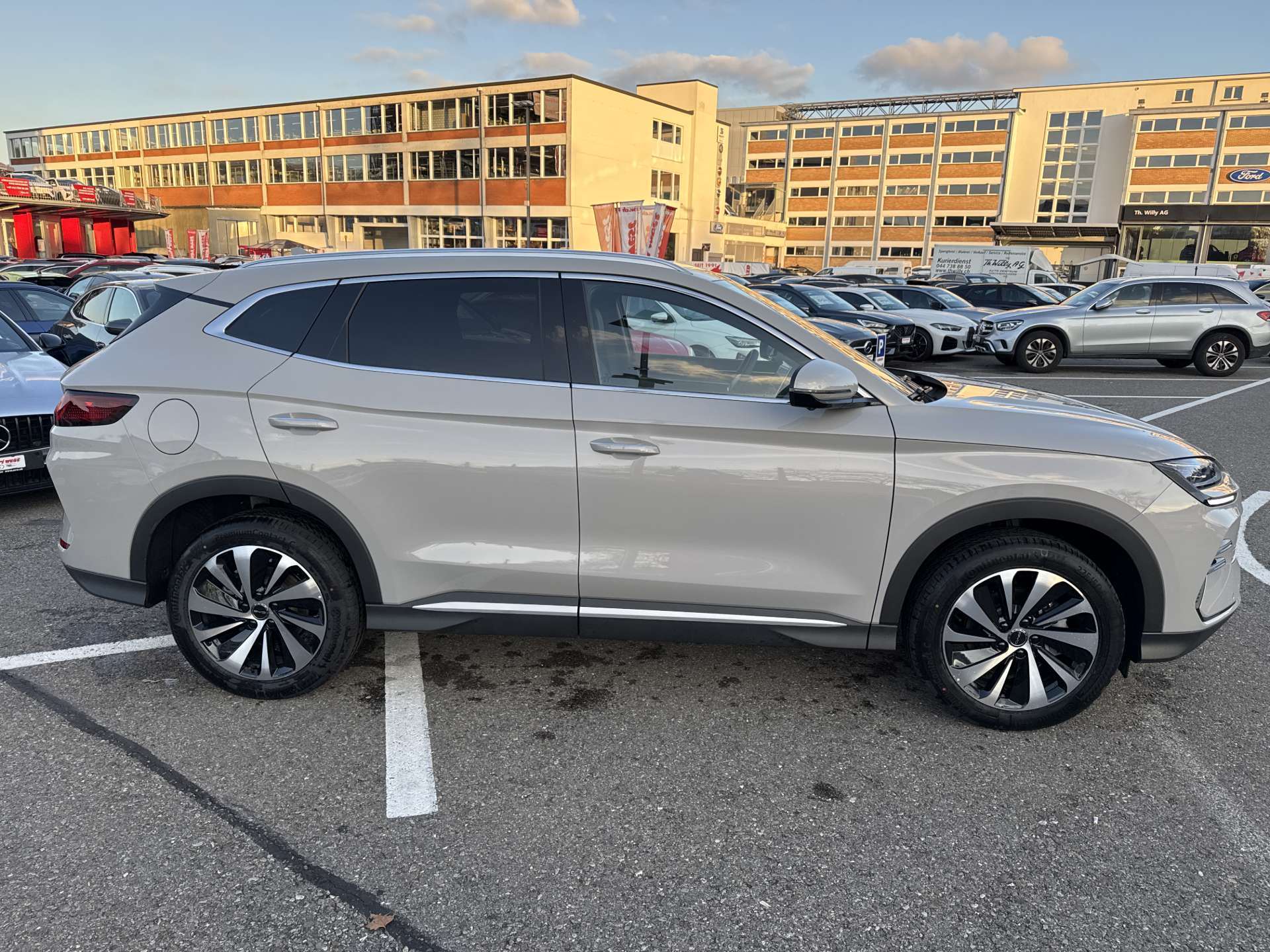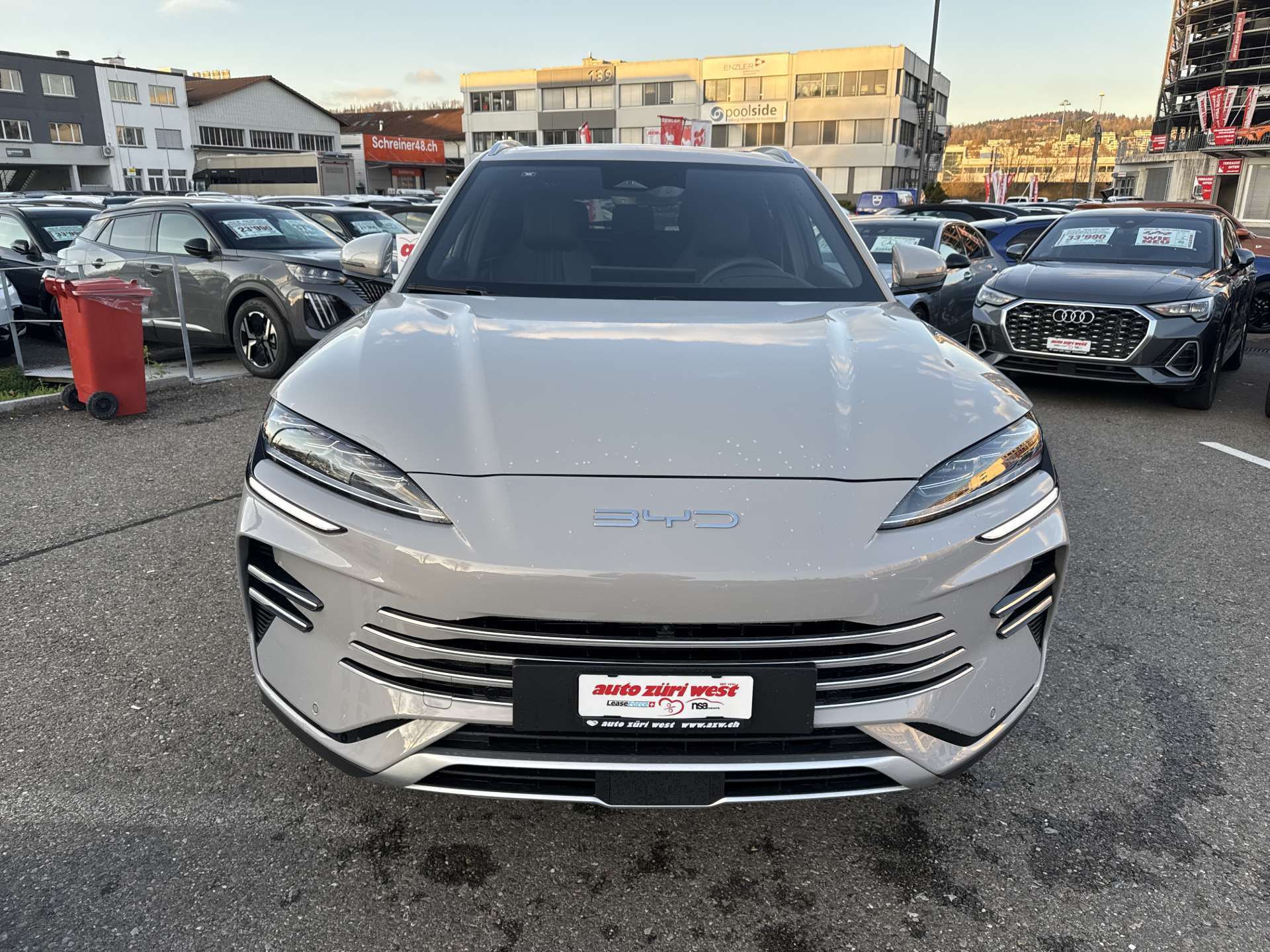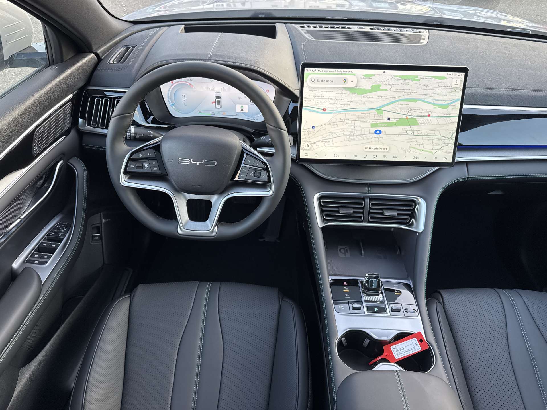 11kW On-Board Charger (OBC), 12-V-Stromanschluss, 2 x Smart Key, 4 x One-Touch-Fensterheber mit Einklemmschutzfunktion, Airbag: Fahrerairbag und Beifahrerairbag, Airbag: Frontairbag in der Mitte, Airbag: Seitenairbags vorn, Airbag: Vorhangairbags, Ambientebeleuchtung, mehrfarbig, Antiblockiersystem (ABS), Armlehne hinten, 2 Getränkehalter, Assist: 360° view camera, Assist: Adaptive Geschwindigkeitsregelung (ACC) & Intelligente Geschwindigkeitsregelung (ICC), Assist: Auto Hold, Assist: Automatische Notbremsung (AEB), Assist: Bergabfahrhilfe (HDC), Assist: Berganfahrassistent (HSA), Assist: Comfort Stop (CST), Assist: Elektrische Parkbremse (EPB), Assist: Heckkollisionswarnung (RCW), Assist: Hydraulischer Bremsassistent (HBA), Assist: Kindererkennung (CPD), Assist: Kontrollierte Verzögerung mit Feststellbremse (CDP), Assist: Müdigkeitserkennung für den Fahrer (DFW) und Aufmerksamkeitswarnung für den Fahrer (DFW), Assist: Parksensoren vorne und hinten, Assist: Querverkehrswarnung hinten (RCTA) & Querverkehrsbremse hinten (RCTB), Assist: Querverkehrswarnung vorn (FCTA) & Querverkehrsbremse vorn (FCTB), Assist: Spurhalteassistent (ELKA), Assist: Spurverlassensverhinderung (LDP), Assist: Spurverlassenswarnung (LDW), Assist: Spurwechselassistent (LCA), Assist: Toter-Winkel-Warnung (BSD), Assist: Traktionskontrolle (TCS), Assist: Überschlagskontrollsystem (RMI), Assist: Verkehrszeichenerkennung (TSR), Assist: Vorwärtskollisionswarnung (FCW), Aussenspiegel elektrisch verstellbar, elektrisch anklappbar, beheizbar, Automatisch abblendender Rückspiegel, Automatisches Verriegelungssystem, Bodenbeleuchtung vorne, Bremsüberbrückungssystem (BOS), Dachreling in Aluminium, Diebstahlsicherung, Dynamische Blinker, Elektrische Heckklappe, Elektronische Bremskraftverteilung (EBD), Elektronische Kindersicherung, ESP (Elektronisches Stabilitätsprogramm), Fahrmodus: Eco, Normal, Sport, Snow, Sand, Muddy, Fahrwerk: Fahrdynamikregelung (VDC), Frontscheibe, Scheibenwischer mit Regensensor, Frontscheibe, UV-Schutz, Wärmedämmung, Schalldämmung, Fussraumbeleuchtung in den Aussenspiegeln, Garantie: Batterie-Garantie 8 Jahre oder 200'000 km, Garantie: Garantie 6 Jahre oder 150'000 km, Gepäckraumleuchte, Getriebe: Direktantrieb, kein Getriebe, Head-up-Display (HUD), ISOFIX und i-Size, Beifahrer- und äussere Rücksitze, Keyless entry & keyless start, Kindersicherung manuell, Klima: Belüftungsdüsen hinten, Kofferraum-Gepäckablage, Kraftbegrenzender Sicherheitsgurt auf dem mittleren Rücksitz, Lackierung: Metallic-Lackierung, LED-Leseleuchten hinten, LED-Leseleuchten vorn, Licht: Fernlichtassistent (HMA), Licht: Follow-me-Home, Licht: LED-Rückleuchten, Licht: LED-Scheinwerfer, automatisches Ein-/Ausschalten, Licht: LED-Tagfahrlicht, Licht: Nebelschlussleuchten, Media: 12,3" TFT-LCD-Instrumententafel, Media: 15,6" elektrisch drehbarer Touchscreen, Media: Android Auto & Apple CarPlay, Media: DAB+ & FM, Media: Infinity-Soundsystem, 10 Lautsprecher, Media: Integrierte 4G-Konnektivität2, Media: Intelligente Sprachsteuerung "Hallo, BYD", Media: Smartphone wireless charging, 2x 15 W, Media: USB-Anschlüsse hinten: 1 x 18W Typ C, 1 x 60 W Typ C, Media: USB-Anschlüsse vorn: 1 x 18W Typ C, 1 x 60 W Typ C, Mehrfarbige LED-Ladeanzeige, Mittelarmlehne hinten, 2 Getränkehalter, Mittelarmlehne vorn, 2 Getränkehalter, Notruf, Panoramadach, elektrisch verstellbares Sonnenschutzrollo, PM2.5 filter, PM2.5-Luftreinigungssystem, Privacy glass in fond, Räder: 19" Bicolor- Leichtmetallfelgen, Reifendruckkontrolle (TPMS), Servolenkung, Sitze: Beifahrersitz belüftet, beheizt, Sitze: Beifahrersitz, elektrisch verstellbar, 4-fach, Sitze: Fahrersitz belüftet, beheizt, gespeicherte Einstellung, Sitze: Fahrersitz und Beifahrer, integrierte Kopfstütze, Sitze: Fahrersitz, elektrisch verstellbar, 8-fach, Positionsspeicher, Sitze: Rücksitze 40:60 geteilt umklappbar, Sitze: Rücksitze, manuell einstellbare Kopfstütze, Türöffnungswarnung (DOW), Vier LED-Türleuchten, Vordersitz-Sonnenblenden mit beleuchtetem Schminkspiegel, Vorgespannte und kraftbegrenzende Sicherheitsgurte vorn, Wärmepumpe