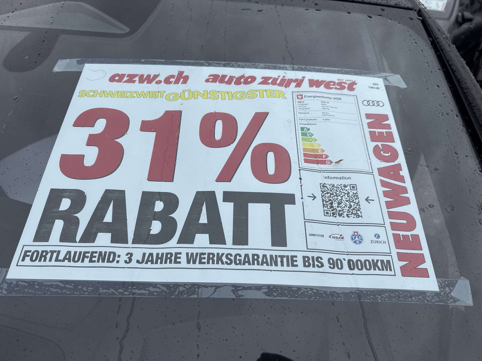 12 Volt-Steckdose im Laderaum, 2. Gepäckraumleuchte links in LED, Ablagefach Fahrerseite, Airbag: Airbag Beifahrer deaktivierbar, Airbag: Airbag Fahrer, Antiblockiersystem (ABS), Assist: Adaptiver Geschwindigkeitsassistent, Assist: Audi pre sense front, Assist: Audi pre sense front, Assist: Ausweichassistent und Abbiegeassistent, Assist: Ausweichassistent und Abbiegeassistent, Assist: Kamerabasierte Verkehrszeichenerkennung, Assist: Kamerabasierte Verkehrszeichenerkennung, Assist: Parklenkassistent IPA (Intelligent Park Assist), Assist: Proaktiver Insassenschutz Front, Seite und Heck, Assist: Proaktiver Insassenschutz Front, Seite und Heck, Assist: Rückfahrkamera, Assist: Spurverlassenswarnung inkl. Notfallassistent, Assist: Traktionskontrolle, Audi connect Notruf & Service mit Audi connect Remote & Control, Audi connect Notruf & Service mit Audi connect Remote & Control, Audi virtual cockpit plus, Aussenspiegel in Wagenfarbe, Aussenspiegel in Wagenfarbe, Aussenspiegel rechts und links beheizbar und elektrisch anklappbar, automatisch abblendend, Bordwerkzeug, Dekor: Dekoreinlage Feinlack vulkangrau, Dekor: Dekoreinlage Feinlack vulkangrau, Diffusor mit Akzenten in Chromoptik matt anthrazit, Einleger der Lufteinlässe in Chromoptik matt anthrazit, Einstiegsleisten mit Aluminiumeinlegern vorn, Einstiegsleisten mit Aluminiumeinlegern vorn, Elektrische Fensterheber vorne, Elektronisches Stabilitäts-Programm (ESP), Fahrwerk: Anpassung Bremsanlage, Fahrwerk: Sportfahrwerk, Fensterschachtleisten in Schwarz, Frontscheibe in Wärmeschutzverglasung, Frontscheibe in Wärmeschutzverglasung, Garantie: 2 Jahre ohne Kilometerbegrenzung (ab 1. Inv.), Gepäckraumnetz, Getriebe: 7-Gang- Automat S tronic, Handschuhfach abschliessbar, Innenspiegel automatisch abblendend, rahmenlos, Interieur mit Normalsitzen in Stoff schwarz, Kindersicherung, elektrisch, Kindersicherung, elektrisch, Klima: 1-Zonen-Klimaautomatik mit Vorbereitung für weitere Klimafunktionen, Komfort-Cupholder, Komfortschlüssel ohne Safelock, Komfortschlüssel ohne Safelock, Lackierung: Uni-Lackierung, Lenkrad: Lederlenkrad im 3-Speichen-Design mit Multifunktion plus und Schaltwippen, Lenkrad: Lederlenkrad im 3-Speichen-Design mit Multifunktion plus und Schaltwippen, Licht- und Regensensor, Licht- und Regensensor, Licht: LED Scheinwerfer, Licht: LED Scheinwerfer, Media: Audi Application Store und Smartphone-Interface, Media: Audi Application Store und Smartphone-Interface, Media: Audi connect Navigation & Infotainment plus, Media: Audi connect Navigation & Infotainment plus, Media: Audi Phone Box, Media: Audi Soundsystem, Media: LTE-Unterstützung für Audi phone box, Media: MMI Navigationssystem Plus mit MMI touch, Media: USB-Anschlüsse mit Ladefunktion im Fond, Media: USB-Anschlüsse mit Ladefunktion im Fond, Paket: Ablagen- und Gepäckraumpaket, Paket: Ambiente Lichtpaket, Paket: Assistenzpaket 2, Paket: Assistenzpaket Fahren und Parken plus, Paket: Infotainmentpaket 1, Paket: Infotainmentpaket Connectivity, Paket: Komfortpaket 2, Paket: Komfortpaket plus, Räder: Räder, 5-Arm, Räder: Reifendruck-Kontrollanzeige, Räder: Reifendruck-Kontrollanzeige, Räder: Reifenreparatur-Set (Tire Fit), Räder: Reifenreparatur-Set (Tire Fit), S-Dachkantenspoiler, S-Dachkantenspoiler, S-Kühlerschutzgitter in Titanschwarz, Schwellerleisten in Chromoptik matt anthrazit, Servolenkung, Sitze: 4-Wege-Lendenwirbelstütze für die Vordersitze, Sitze: Ablagenetz an der Rückseite der Vordersitzlehne, Sitze: i-Size und Top Tether für die äusseren Fondsitze, Sitze: Kindersitzbefestigung i-Sitze-konform auf Beifahrerseite und äusseren Fondsitzen,, Sitze: Rücksitzlehne umklappbar, Sitze: Rücksitzlehne umklappbar, Wegfahrsperre elektronisch, Wegfahrsperre elektronisch, Zentralverriegelung mit Fernbedienung