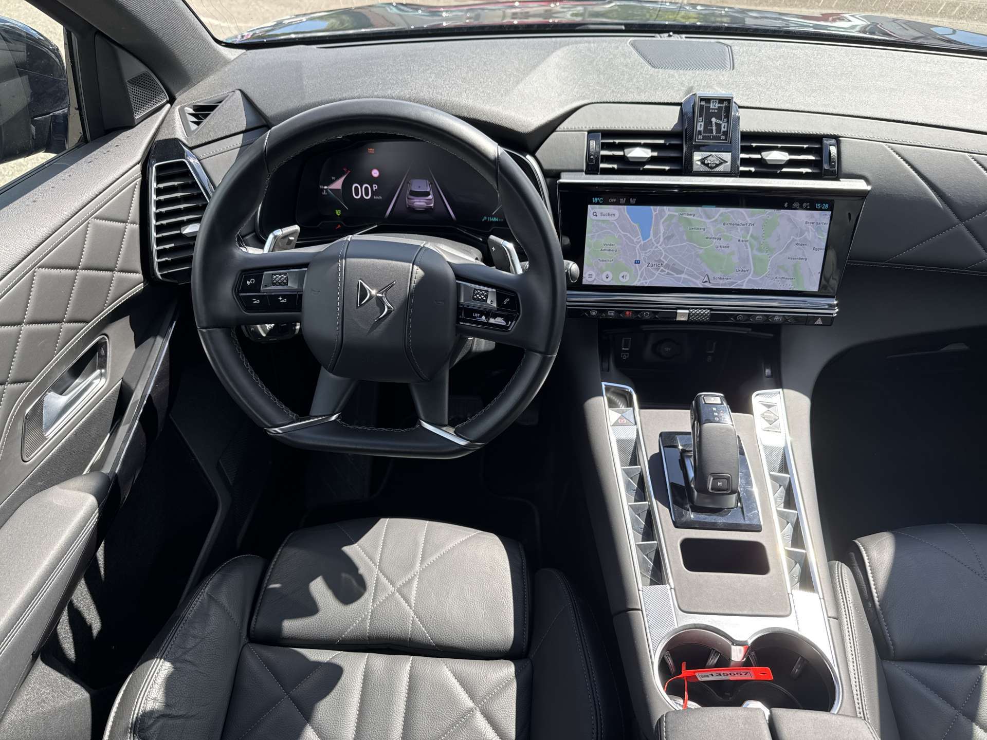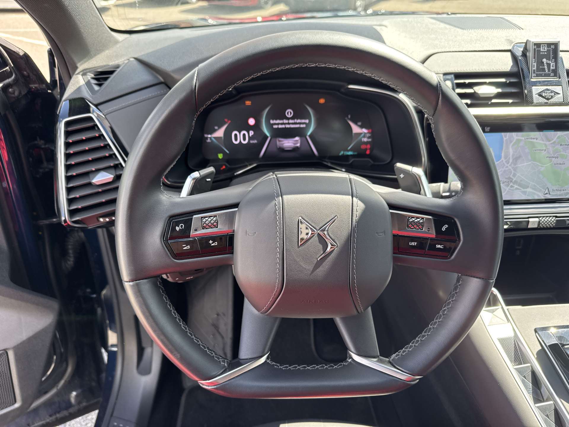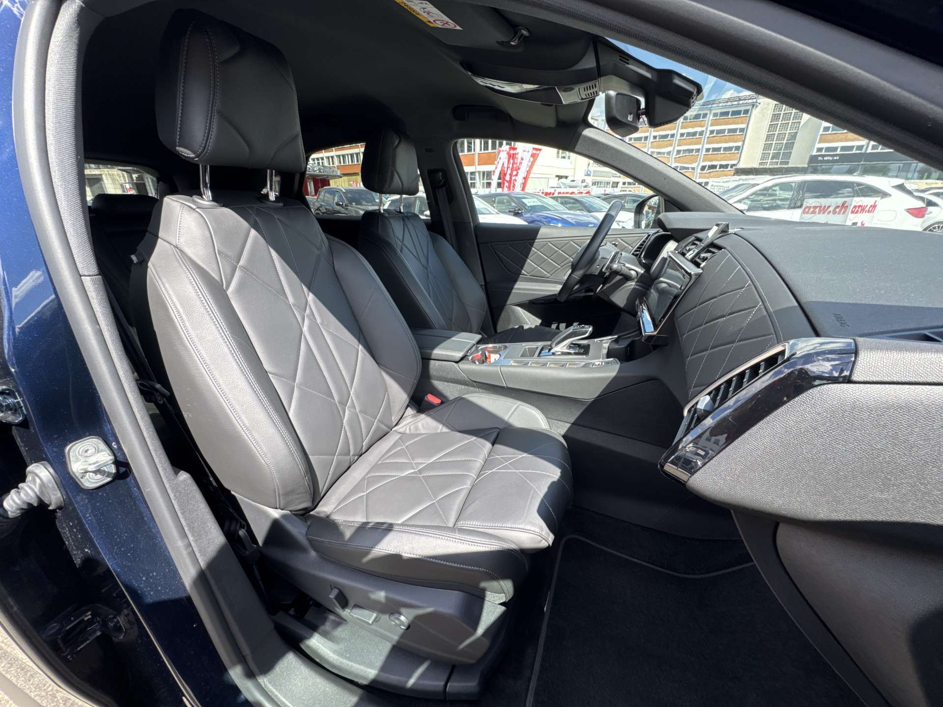 12 Volt-Steckdose im Laderaum, 2 Isofix-Kindersitzbefestigungen hinten, 3-Punkt-Sicherheitsgurte auf allen Plätzen, ABS mit elektronischer Bremskraftverteilung (EBV) und Bremsassistent (BA), Airbag: Airbag Fahrer und Beifahrer, Airbag: Front- und Kopfairbags, Airbag: Seitenairbag für Fahrer und Beifahrer, Assist: Active Safety Brake, Assist: Aufmerksamkeitswarnung für den Fahrer per Kamera, Assist: Berganfahrhilfe, Assist: Erweitere Verkehrszeichenerkennung, Assist: Geschwindigkeitsregler und -begrenzer, Assist: Parksensoren vorne und hintenhinten+ Rückfahrkamera, Assist: Spurassistent, Assist: Totwinkel-Assistent, Aussenspiegel elektrisch anklappbar mit DS Logo Projektion, Aussenspiegelgehäuse in Schwarz lackiert, Automatische Parkbremse, Automatische Scheibenwischer, Automatisches Einschalten der Warnblinkanlage bei starkem Bremsen, Bordcomputer, Dachreling aus Aluminium, Dekor: Einstiegsleisten in Aluminium, Drehzahlmesser, Einfassung der Seitenfenster verchromt, Elektrische Fensterheber vorne + hinten, Elektrochromischer rahmenloser Innenrückspiegel, Elektronisches Stabilitäts-Programm, Full-LED - Innenbeleuchtung, Fussmatten vorne und hinten, Getriebe: 8-Stufen-Automat sequentiell, Gurtstraffer mit Gurtkraftbegrenzer, Heck-und Seitenscheiben stärker getönt, Heckscheiben-Wisch-/Waschanlage, Heckscheibenheizung, Innenspiegel automatisch abblendbar, Interieur Leder Basalte Schwarz, Keyless Entry / -Start, Kopfstützen hinten und vorne, Lackierung: Metallic-Lackierung Saphir Blau, Lenkrad: Lederlenkrad, Lenkrad: Lenkrad längs- und höhenverstellbar, Licht: 3D - LED - Rückleuchten mit Lauflichtblinkern, Licht: Drittes Bremslicht, Licht: DS Light Veil, Licht: DS PIXEL LED VISION 3.0, Licht: Dynamische Blinker, Licht: Fernlicht-Assistent, Licht: LED Scheinwerfer, Licht: Nebelschlussleuchte, Media: 12.3 Digitales Kombiinstrument, Media: DS IRIS SYSTEM, Media: Mirror Screen, Media: USB-C-Datenanschluss vorne, Mittelarmlehne hinten, Paket: Elektrische Sitze-Paket, Paket: Pack Safety, Partikelfilter und Oxydationskatalysator, Räder: 19"- Aluminium Felgen EDINBURGH, Räder: Reifendruckkontrollsystem, Räder: Reifenreparatur-Kit mit Pannenspray, Schalldämmende Frontscheibe, Seitenscheiben vorne leicht getönt, Servolenkung mit variabler Lenkkraftunterstützung, Sitze: Rückbank im Verhältnis 2/3 -1/3 teilbar und 3 Kopfstützen, Sitze: Vordersitze höhenverstellbar, Türgriffe aussen in Wagenfarbe, Uhr B.R.M R180, Verchromte DS Wings und Schwarz Glänzender Kühlergrill, Wegfahrsperre elektronisch, Zentralverriegelung mit Fernbedienung