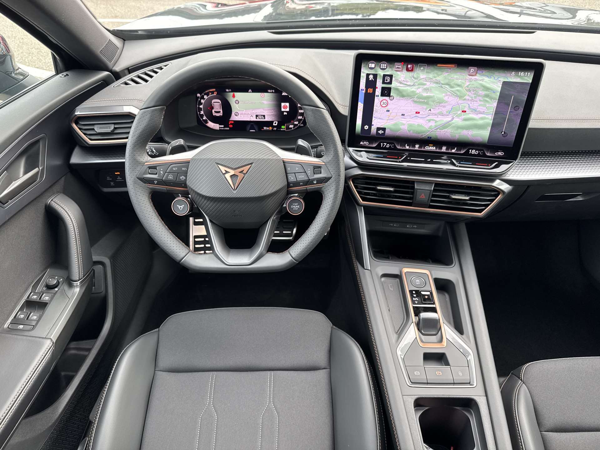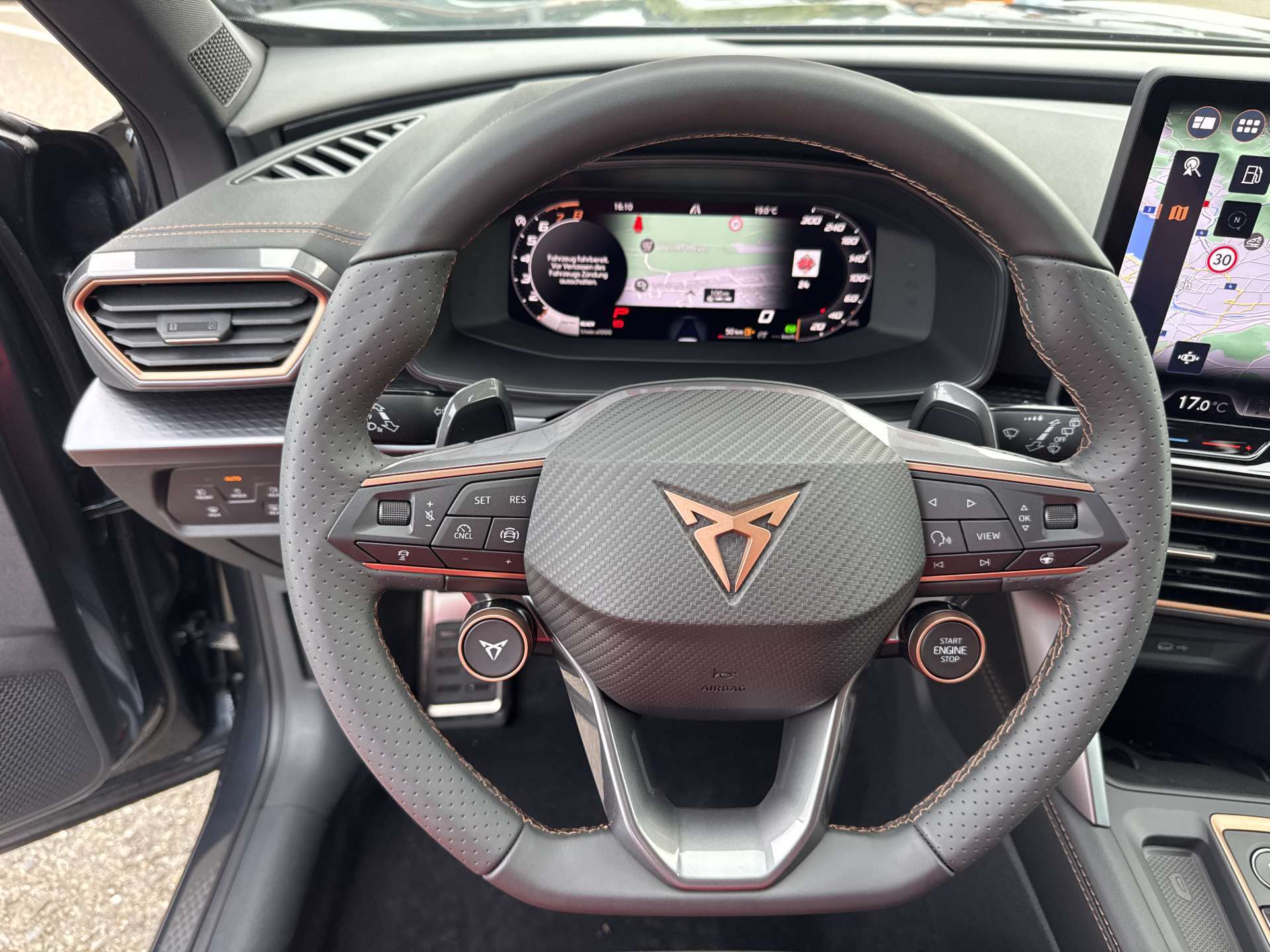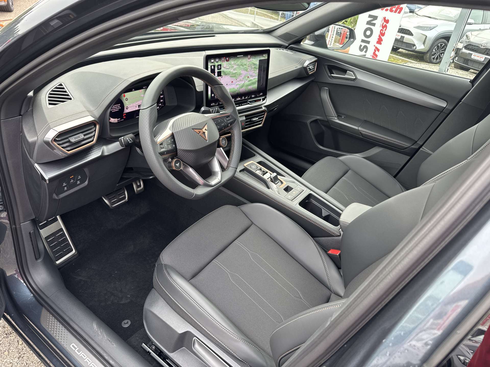 3-Punkt-Sicherheitsgurte auf allen Plätzen, Abgedunkelte Scheiben ab B-Säule hinten, ABS, EBV elektronische Bremskraft-verteilung, Airbag: Airbag Beifahrer deaktivierbar, Airbag: Airbag Fahrer und Beifahrer, Airbag: Kopfairbags vorne und hinten, Airbag: Seitenairbags für Fahrer und Beifahrer, Alarmanlage mit Innenraumüberwachung, Alarmanlage mit Innenraumüberwachung, Assist: Aufmerksamkeits- und Müdigkeitserkennung (ADA), Assist: Ausweichunterstützung / Abbiegeassistent, Assist: Automatische Distanzregelung ACC, Assist: City Notbremsfunktion, Assist: Einparkhilfe vorne und hinten, Assist: Elektronische Parkbremse mit Auto Hold Funktion, Assist: Exit Assist (Ausparkassistent), Assist: Exit Warning (Ausstiegswarner), Assist: Lane assist (Spurhalteassistent), Assist: Multifunktionskamera, Assist: Multikollisionsbremse, Assist: Parklenkassistent IPA (Intelligent Park Assist), Assist: Prädiktive Speedlimiter, Assist: PreCrash Sicherheitssystem, Assist: Regen-/Lichtsensor, Assist: Rückfahrkamera, Assist: Side Assist (Spurwechselassistent), Assist: Top View Camera (Rundumblick), Assist: Traction Control (TCS), Assist: Traffic sign recognition (Verkehrszeichenerkennung), Assist: Travel Assist, Assist: Umfeldbeobachtung Front-Assist, Aussenspiegel elektrisch einstell-, beheiz- und einklappbar, Aussenspiegel elektrisch einstell-, beheiz- und einklappbar mit Memory -Funktion, Aussenspiegel elektrisch einstell-, beheiz- und einklappbar mit Memory -Funktion, Aussenspiegel mit Beifahrerspiegelabsenkung, Aussenspiegel mit LED-Umfeldbeleuchtung, Automatisch abblendender Innenrückspiegel, Beleuchtete Sonnenblende links mit abdeckbarem Spiegel und Lasche, rechts mit abdeckbarem Spiegel, CUPRA Drive Profile, Dachhimmel Schwarz, Dachreling schwarz, Dekor: Dinamica Ambiente, Dekor: Metallized Ambiente, Elektrische Fensterheber vorne und hinten mit Komfortschaltung und Einklemmschutz, ESC mit EBA, DSR, XDS und Reifendruckkontrolle, Fahrwerk: Adaptive Fahrwerksregelung DCC, Fahrwerk: Progressivlenkung, Full Digital Cockpit, Fussmatten vorne und hinten, Garantie: Cupra 12 Jahre Gewährleistung gegen Karosserie-Durchrostung, Garantie: Cupra 3 Jahre Lack-Gewährleistung, Garantie: Cupra Garantie 2 Jahre ohne Kilometerbegrenzung, Getriebe: 7-Gang DSG, Gurtkontrolle, Heckklappe elektrisch öffnend "Virtual Pedal", Heckscheiben-Wisch-/Waschanlage mit Intervall, Kindersitzverankerung ISOFIX (äussere Plätze hinten), Klima: 3-Zonen Climatronic mit Fondraumbedienung, Lackierung: Uni-Lackierung, LED-Innenraumbeleuchtung mit Ambientebeleuchtung Smart Wraparound "Multicolor", LED-Innenraumbeleuchtung mit Ambientebeleuchtung"Monochrom", Lenkrad: Supersportlenkrad mit Start-/ Drive Profile-Knopfsystem und Schaltwippen, beheizbar, Licht: Coming-home-Funktion, Licht: Drittes Bremslicht, Licht: Durchgehende Full LED-Heckleuchten, Licht: Fernlicht-Assistent, Licht: LED Heckleuchten mit beleuchtetem 3D CUPRA Logo, Licht: LED-Heckleuchten mit dynamischem Blinklicht, Licht: LED-Nebelscheinwerfer mit Cornering-Funktion, Licht: LED-Scheinwerfer für Abblend- und Fernlicht, Licht: LED-Tagfahrlicht, Licht: Leuchtweitenregulierung dynamisch, Licht: Matrix LED Fernlicht, Licht: Matrix LED Scheinwerfer, Licht: Nebelschlussleuchte, Media: 12,9" Infotainment (MIB3), Media: 2 USB C Anschlüsse hinten und vorne, Media: 7 Lautsprecher, Media: CUPRA Connect Online Infotainment, Media: CUPRA Connect Remote & Access, Media: CUPRA Connect Safety & Services, Media: CUPRA Connectivity Box, Media: CUPRA FullLink, Media: CUPRA Navigationssystem, Media: DAB+ (Digital Audio Broadcasting), Media: Mobiltelefon Freisprechanlage Bluetooth, Media: Sprachsteuerung, Paket: EDGE, Paket: Fahrerassistenzpaket XL, Paket: INTELLIGENT DRIVE, Pyrotechnische Gurtstraffer und Gurtkraftbegrenzer, Räder: Alufelgen 8J x 18", "TEMPEST" Machined in Silver, Räder: Reifendruckkontrollsystem, Räder: Reifenreparatur-Set (Tire Fit), Schlüsselloses Schliess- und Startsystem (KESSY), Servolenkung mit geschwindigkeitsabhängiger Lenkkraftunterstützung, Sitze: 3 verstellbare Kopfstützen hinten, Sitze: CUPRA Sport Schalensitze in Dinamica "Black/Blue", Sitze: CUPRA Sport Schalensitze in Leder, Sitze: CUPRA Sportsitze in "Sharp Textil schwarz", Sitze: Elektrische Sitzverstellung mit Memory-Funktion für Fahrer- und Beifahrerseite, Sitze: Fahrersitz elektrisch einstellbar mit Memory-Funktion, Sitze: Geteilt abklappbare Rücksitzlehne 1/3 - 2/3, Sitze: Kopfstützen vorne (integrierte), Sitze: Lendenwirbelstütze Fahrer- und Beifahrerseite elektrisch einstellbar, Sitze: Lendenwirbelstütze Fahrerseite elektrisch einstellbar, Sitze: Mittelarmlehne hinten, Sitze: Mittelarmlehne vorne, Sitze: Ohne Dokumentenablage und Schublade unter den Vordersitzen, Sitze: Sitzheizung für Vordersitze, getrennt regelbar, Sitze: Vordersitze höhenverstellbar mit Lendenwirbelstütze, Stopp - Start- und Rekuperationssystem, Türgriffe in Wagenfarbe, Variabler Ladeboden, Vollverzinkte Karosserie, Wärmeschutzverglasung, Wegfahrsperre elektronisch, Zentralverriegelung "Keyless-Go", Zentralverriegelung mit Funkfernbedienung, 2 Funkschlüssel