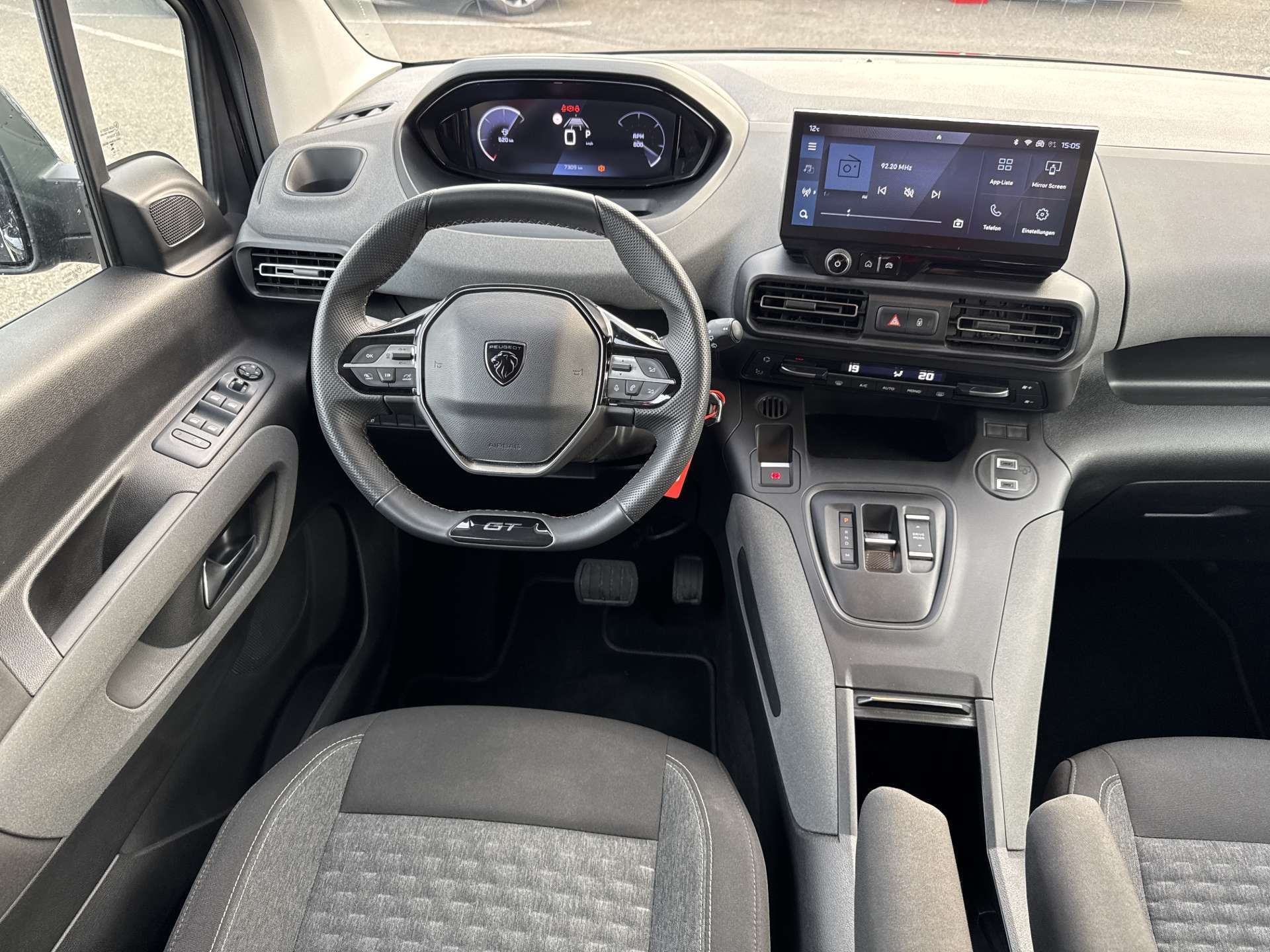 , 2 x 3-Tasten-Fernbedienung, 3-Punkt-Sicherheitsgurte auf allen Plätzen, 4 Lasthalteösen im Kofferraumboden, Ablagefach im Kabinendach, Absenkbaren Seitenfenstern in den Schiebetüren in Reihe 2, Airbag: Front- und Seitenairbags auf der Fahrer-, Assist: Adaptiver Geschwindigkeitsregler mit Stop & GO-Funktion, Assist: Autonomes Notbremssystem mit Erkennung von Fussgängern und Radfahrern, Assist: Einparkhilfe hinten, Assist: Erweitere Verkehrszeichenerkennung, Assist: Müdigkeitswarner, Assist: Spurzentrierungs-Assistent, Assist: Visiopark 180, Aufrollbare Kofferraumabdeckung, Aussenspiegel elektrisch, beheizbar und anklappbar, Aussenspiegelgehäuse schwarz brillant, Beheizbare Heckscheibe mit Scheibenwischer, Bordcomputer, Dachreling, Drehzahlmesser, Elektrische Fensterheber mit Schnellabsenkung vorne und in Reihe 2, Elektrische Kindersicherung, ESP : ABS (Antiblockiersystem) + ESC (Electronic Stability Control) + ASR, Festellbremse elektrisch, Feststehenden Fenstern in Reihe 3, Fussmatten und GT-Abzeichen, Getriebe: 8-Stufen-Automat sequentiell, Handschuhfach mit Kühlfunktion, Heckklappe mit separat zu öffnender Heckscheibe, Hohe Konsole mit Speicher, USB-Anschluss, Klima: 2-Zonen-Klimaautomatik und Gebläse für die Klimaanlage in der 2. Reihe, Lackierung: Matte Lackierung, Lenkrad: GT-Lenkrad, Lenkrad: Lederlenkrad mit Heizung, Lenkrad: Lenkrad in Hohe und Tiefe verstellbar, Licht- und Regensensor, Licht: Drittes Bremslicht, Licht: Fernlichtassistent, Licht: Halogenscheinwerfer, Licht: Nebelscheinwerfer + 3-Krallen-eco-LED-Tagfahrlicht, Licht: Nebelschlussleuchte, Media: 2 USB-Anschlüsse Type C (1x Laden und 1x Daten), Media: Bluetooth, Media: Farbiges 10'' HD TFT-Zentraldisplay, Media: Farbiges 10'' HD-Touchscreen, DAB+ Radio, Media: Mirror Screen Funktion (Apple Carplay/Android Auto), Peugeot Connect SOS & Assistenz, Peugeot i-Cockpit (Head-up-Digitalinstrument, kompaktes Lenkrad und Touchscreen), Polster: Stoff-Ausstattung, Räder: 17-Zoll-Leichtmetallfelgen AORAKI, glanzgedreht, Räder: Indirekte Reifenluftdruckkontrolle, Räder: Notfallsatz für Reifenpannen, Scheiben in Reihe 2 und 3 und Heckscheibe stärker getönt, Schlüsselloses Zugangs- und Startsystem, Schwarz lackierter Kühlergrill, Seitenschutzeinsätze Grau, Seitliche Schiebetür links manuell, Seitliche Schiebetür rechts manuell, Servolenkung, Sitze: 3 versenkbare Einzelsitze in Reihe 2 mit Isofix-Befestigung für jeden Sitzplatz, Sitze: Beifahrersitz umklappbar in Länge und Neigung verstellbar, Sitze: Fahrersitz in Länge, Höhe und Neigung verstellbar mit manuellen Lendenwirbelstütze,, Stossfängerblende vorne und hinten Grau Aluminé, System Magic Wash Premium (Frontscheibenwischer mit integrierten Scheibenwaschdüsen), Türgriffe aussen und hintere Nummernschildblende in Wagenfarbe lackiert, Türgriffe Satin Chrom, Wegfahrsperre elektronisch, Zentralverriegelung von innen aktivierbar, mit Funkfernbedienung