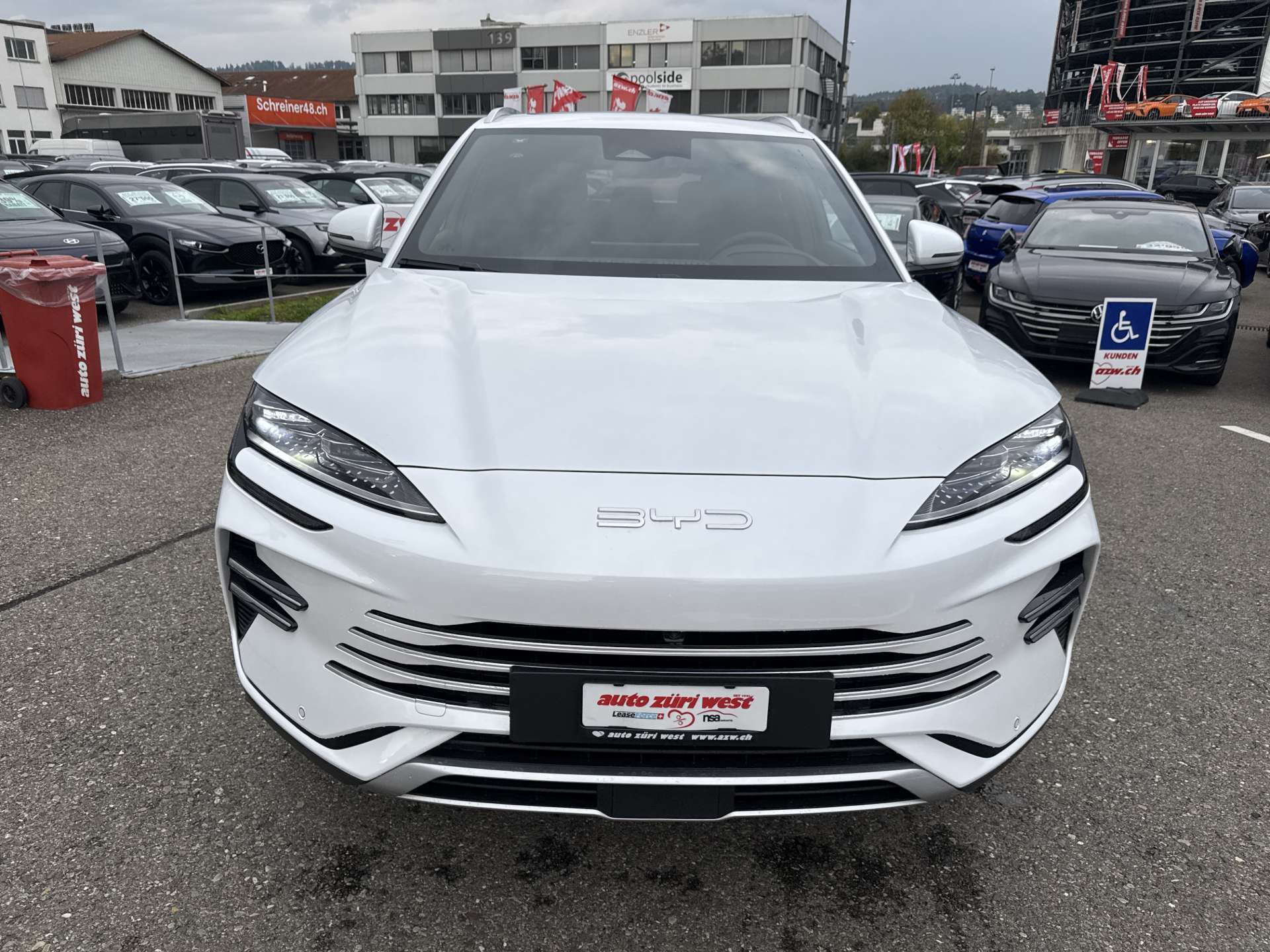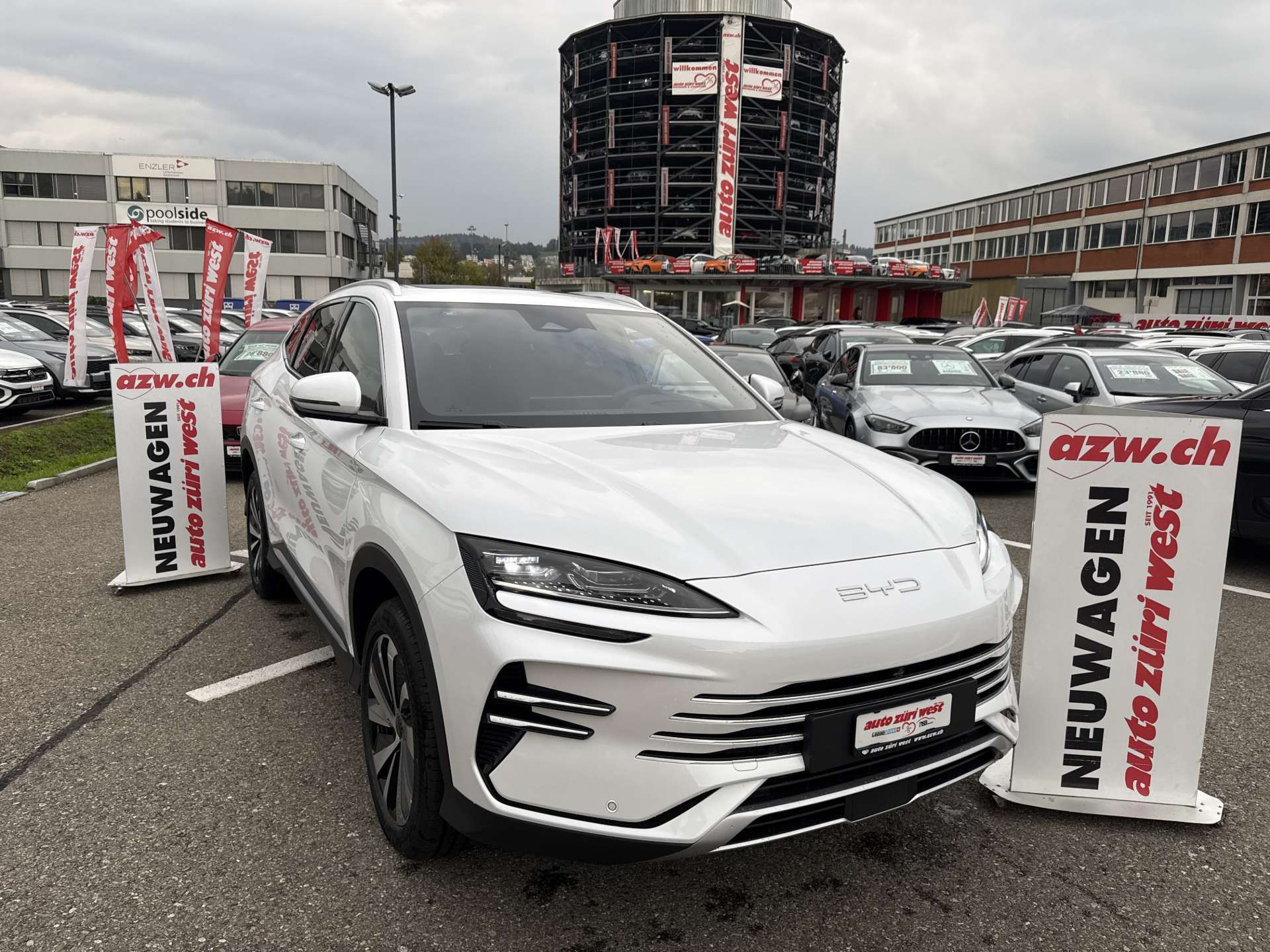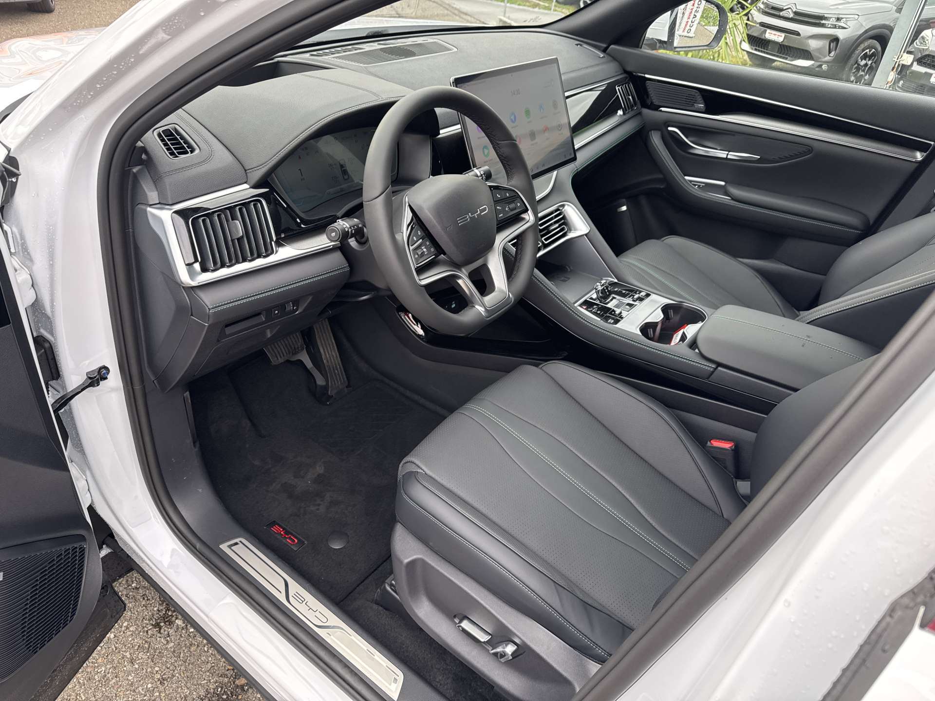 11kW On-Board Charger (OBC), 12-V-Stromanschluss, 2 x Smart Key, 4 x One-Touch-Fensterheber mit Einklemmschutzfunktion, Airbag: Fahrerairbag und Beifahrerairbag, Airbag: Frontairbag in der Mitte, Airbag: Seitenairbags vorn, Airbag: Vorhangairbags, Ambientebeleuchtung, mehrfarbig, Antiblockiersystem (ABS), Armlehne hinten, 2 Getränkehalter, Assist: Spurverlassenswarnung (LDW), Assist: 360° view camera, Assist: Adaptive Geschwindigkeitsregelung (ACC) & Intelligente Geschwindigkeitsregelung (ICC), Assist: Auto Hold, Assist: Automatische Notbremsung (AEB), Assist: Bergabfahrhilfe (HDC), Assist: Berganfahrassistent (HSA), Assist: Comfort Stop (CST), Assist: Elektrische Parkbremse (EPB), Assist: Heckkollisionswarnung (RCW), Assist: Hydraulischer Bremsassistent (HBA), Assist: Kindererkennung (CPD), Assist: Kontrollierte Verzögerung mit Feststellbremse (CDP), Assist: Müdigkeitserkennung für den Fahrer (DFW) und Aufmerksamkeitswarnung für den Fahrer (DFW), Assist: Parksensoren vorne und hinten, Assist: Querverkehrswarnung hinten (RCTA) & Querverkehrsbremse hinten (RCTB), Assist: Querverkehrswarnung vorn (FCTA) & Querverkehrsbremse vorn (FCTB), Assist: Spurhalteassistent (ELKA), Assist: Spurverlassensverhinderung (LDP), Assist: Spurwechselassistent (LCA), Assist: Toter-Winkel-Warnung (BSD), Assist: Traktionskontrolle (TCS), Assist: Überschlagskontrollsystem (RMI), Assist: Verkehrszeichenerkennung (TSR), Assist: Vorwärtskollisionswarnung (FCW), Aussenspiegel elektrisch verstellbar, elektrisch anklappbar, beheizbar, Automatisch abblendender Rückspiegel, Automatisches Verriegelungssystem, Bodenbeleuchtung vorne, Bremsüberbrückungssystem (BOS), Dachreling in Aluminium, Diebstahlsicherung, Dynamische Blinker, Elektrische Heckklappe, Elektronische Bremskraftverteilung (EBD), Elektronische Kindersicherung, ESP (Elektronisches Stabilitätsprogramm), Fahrmodus: Eco, Normal, Sport, Snow, Fahrwerk: Fahrdynamikregelung (VDC), Frontscheibe, Scheibenwischer mit Regensensor, Frontscheibe, UV-Schutz, Wärmedämmung, Schalldämmung, Fussraumbeleuchtung in den Aussenspiegeln, Garantie: Batterie-Garantie 8 Jahre oder 200'000 km, Garantie: Garantie 6 Jahre oder 150'000 km, Gepäckraumleuchte, Getriebe: Direktantrieb, kein Getriebe, Head-up-Display (HUD), ISOFIX und i-Size, Beifahrer- und äussere Rücksitze, Keyless entry & keyless start, Kindersicherung manuell, Klima: Belüftungsdüsen hinten, Kofferraum-Gepäckablage, Kraftbegrenzender Sicherheitsgurt auf dem mittleren Rücksitz, Lackierung: Metallic-Lackierung, LED-Leseleuchten hinten, LED-Leseleuchten vorn, Licht: Fernlichtassistent (HMA), Licht: Follow-me-Home, Licht: LED-Rückleuchten, Licht: LED-Scheinwerfer, automatisches Ein-/Ausschalten, Licht: LED-Tagfahrlicht, Licht: Nebelschlussleuchten, Media: 12,3" TFT-LCD-Instrumententafel, Media: 15,6" elektrisch drehbarer Touchscreen, Media: Android Auto & Apple CarPlay, Media: DAB+ & FM, Media: Infinity-Soundsystem, 10 Lautsprecher, Media: Integrierte 4G-Konnektivität2, Media: Intelligente Sprachsteuerung "Hallo, BYD", Media: Smartphone wireless charging, 2x 15 W, Media: USB-Anschlüsse hinten: 1 x 18W Typ C, 1 x 60 W Typ C, Media: USB-Anschlüsse vorn: 1 x 18W Typ C, 1 x 60 W Typ C, Mehrfarbige LED-Ladeanzeige, Mittelarmlehne hinten, 2 Getränkehalter, Mittelarmlehne vorn, 2 Getränkehalter, Notruf, Panoramadach, elektrisch verstellbares Sonnenschutzrollo, PM2.5 filter, PM2.5-Luftreinigungssystem, Privacy glass in fond, Räder: 19" Bicolor- Leichtmetallfelgen, Reifendruckkontrolle (TPMS), Servolenkung, Sitze: Beifahrersitz belüftet, beheizt, Sitze: Beifahrersitz, elektrisch verstellbar, 4-fach, Sitze: Fahrersitz belüftet, beheizt, gespeicherte Einstellung, Sitze: Fahrersitz und Beifahrer, integrierte Kopfstütze, Sitze: Fahrersitz, elektrisch verstellbar, 8-fach, Positionsspeicher, Sitze: Rücksitze 40:60 geteilt umklappbar, Sitze: Rücksitze, manuell einstellbare Kopfstütze, Türöffnungswarnung (DOW), Vier LED-Türleuchten, Vordersitz-Sonnenblenden mit beleuchtetem Schminkspiegel, Vorgespannte und kraftbegrenzende Sicherheitsgurte vorn, Wärmepumpe
