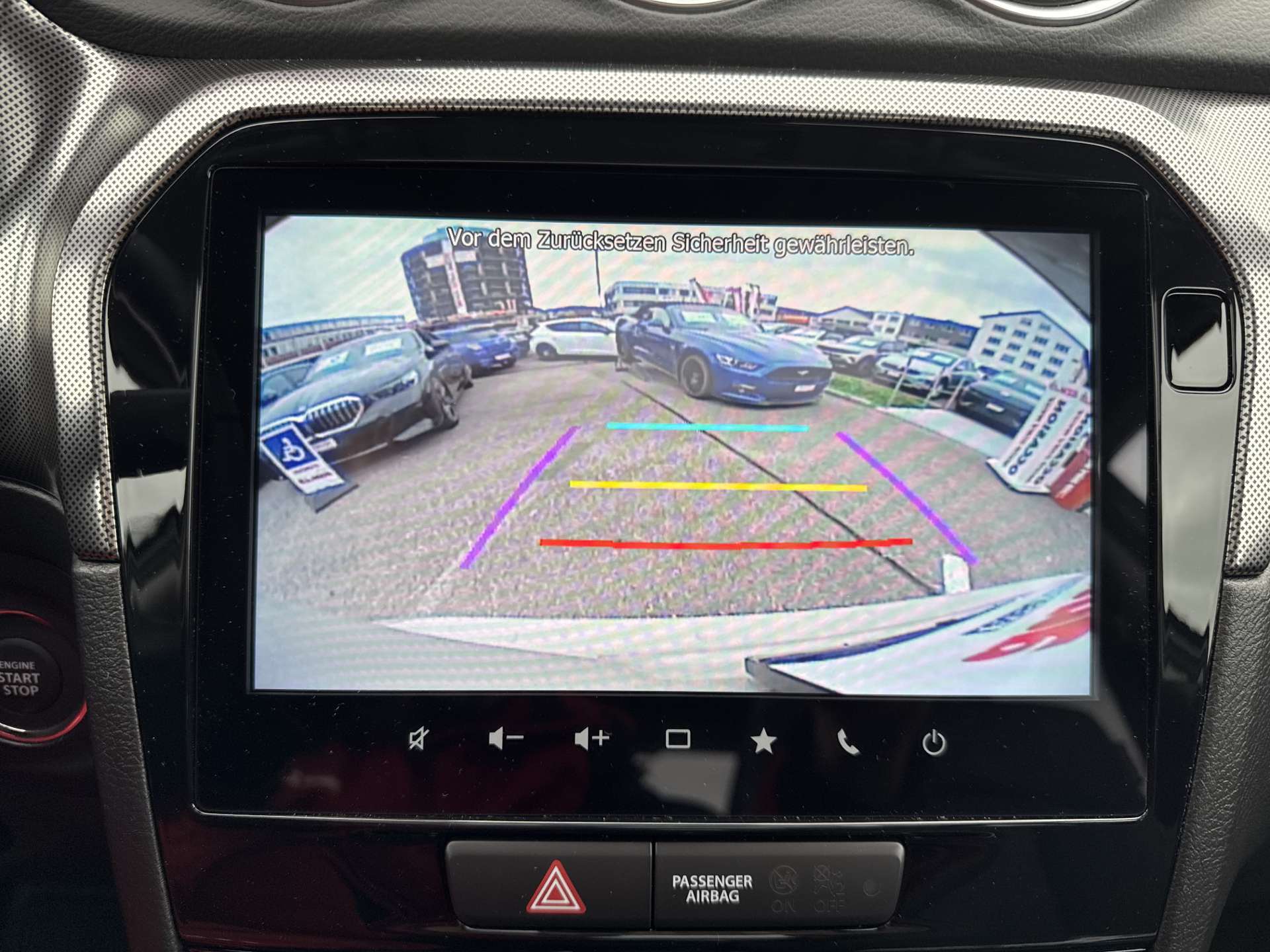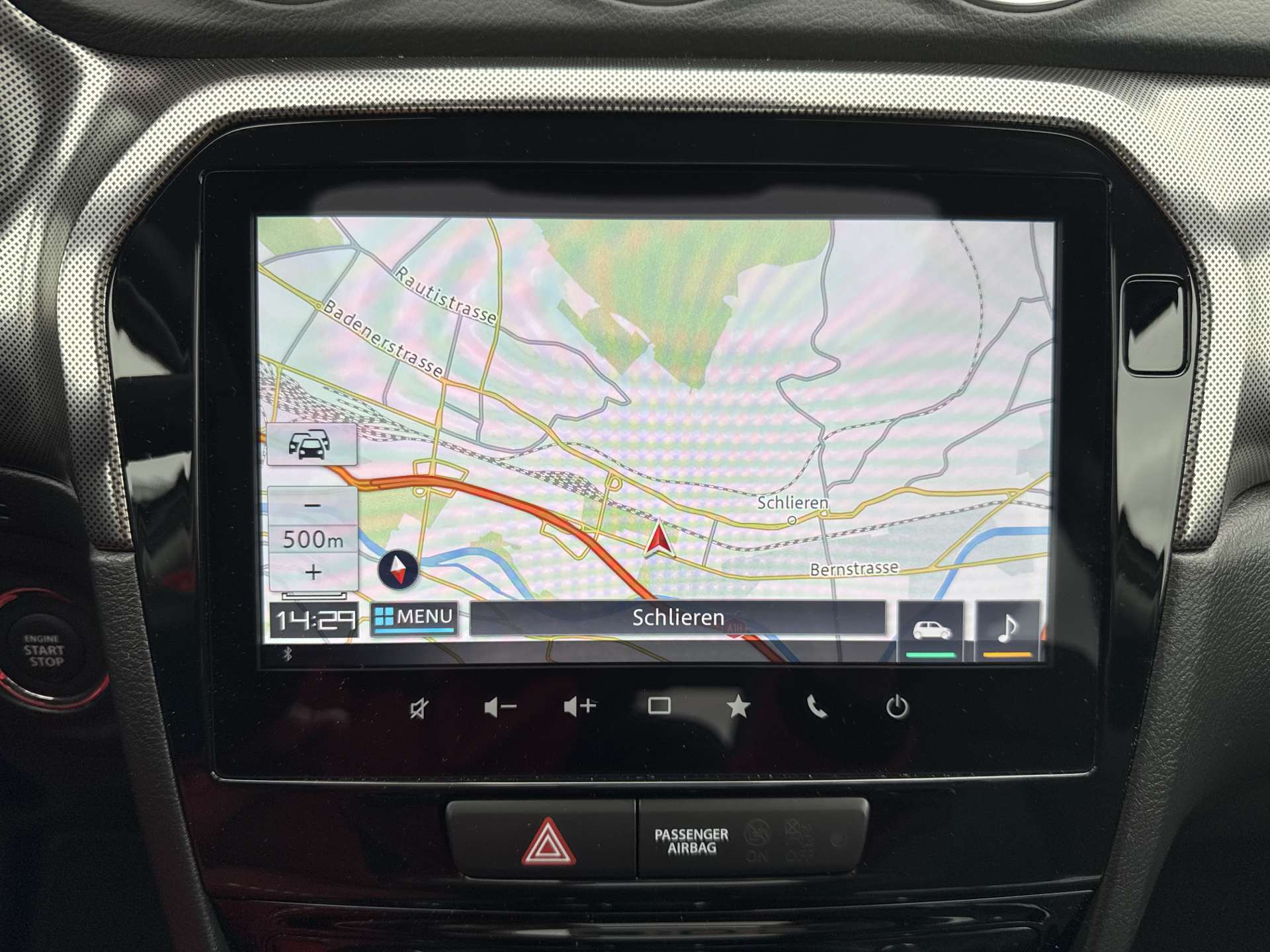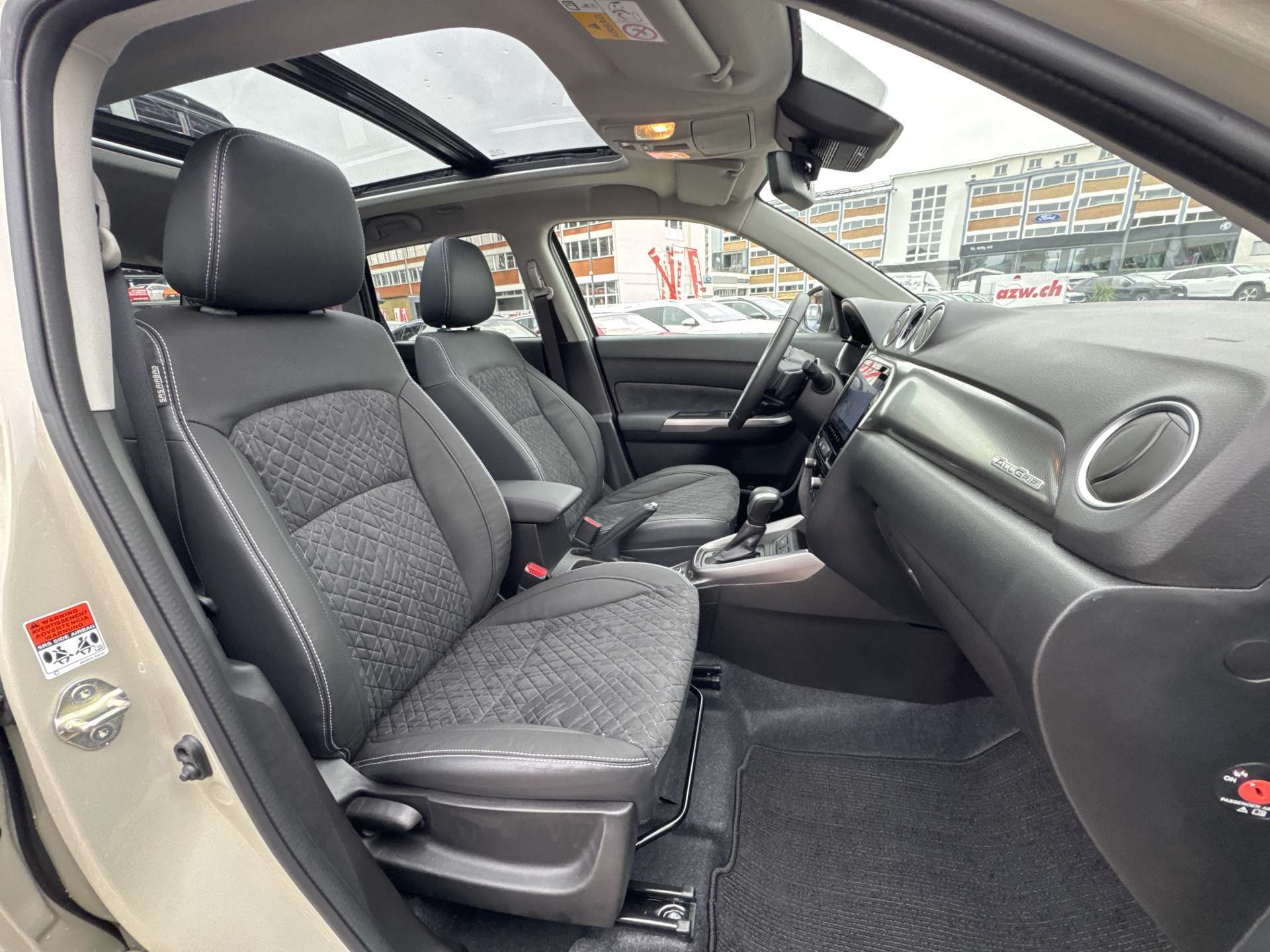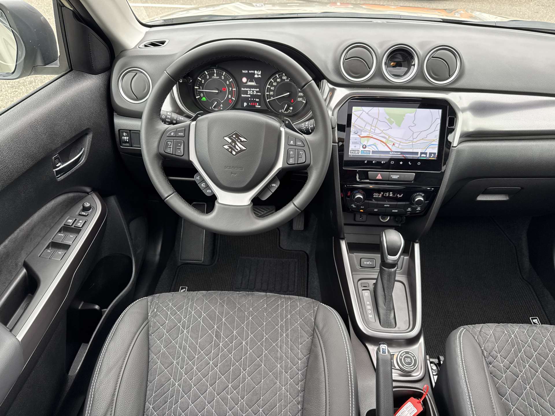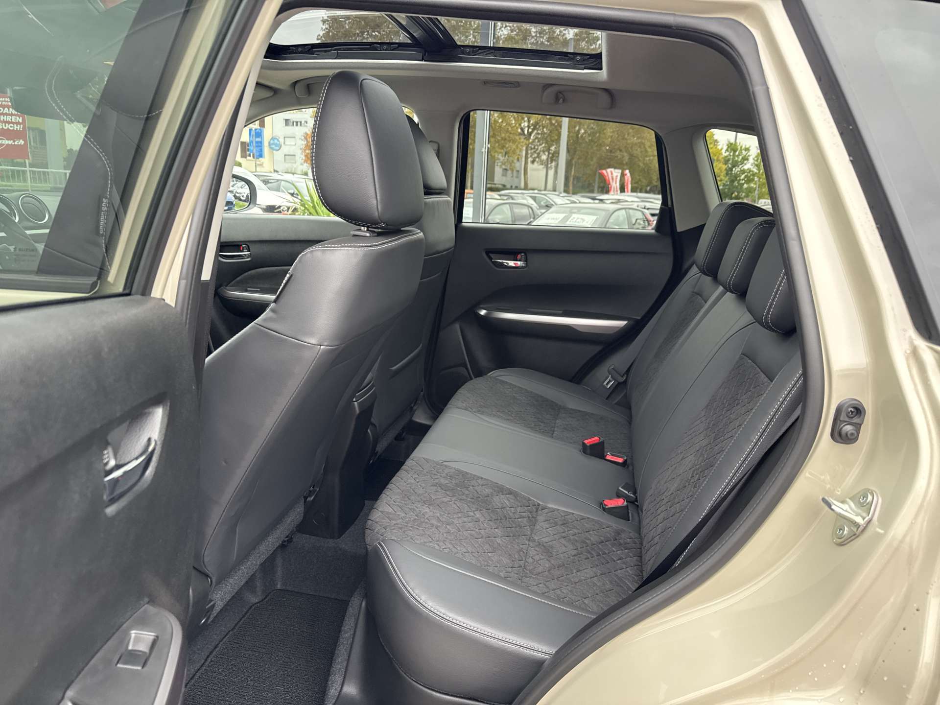 12 Volt-Steckdose, ABS mit elektronischer Bremskraftverteilung und Bremsassistent, Airbag: Airbag für Fahrer und Beifahrer (Beifahrerseite deaktivierbar), Airbag: Seitenairbags vorne, Airbag: Vorhangairbags, Assist: Adaptiver Tempomat, Assist: Aktiver Spurhalteassistent, Assist: Bergabfahrassistent, Assist: Berganfahrhilfe, Assist: eCall, Assist: Fahrerüberwachungssystem (DMS), Assist: Notbremssystem mit Kollisionswarner, Assist: Parksensoren hinten (akustisch), Assist: Parksensoren vorne (akustisch), Assist: Querverkehrswarner hinten, Assist: Rückfahrkamera, Assist: Spurleitassistent, Assist: Spurwechselassistent, Assist: Verkehrszeichenerkennung, Assist: Warnsystem für Müdigkeit und Aufmerksamkeit, Aussenspiegel mit integriertem Blinker, Bodenteppiche, Dachreling, Diverse Ablagefächer und Getränkehalter, Dreipunkt-Sicherheitsgurte auf allen Plätzen, Elektrisch verstell-, heiz- und einklappbare Aussenspiegel, Elektrische Fensterheber vorne + hinten, Elektrisches Panorama Hub-/Schiebedach, ESP mit Traktionskontrolle, Garantie: 3 Jahre oder 100'000 km, Getriebe: 6-Stufen-Automat sequentiell, Gurtstraffer und Gurtkraftbegrenzer vorne und hinten, Heckspoiler, Innenspiegel automatisch abblendbar, ISOFIX-Kindersitzverankerung, Keyless Start (schlüsselloses Einsteigen und Starten), Klima: Klimaautomatik mit Pollenfilter, Lackierung: Uni-Lackierung, Lenkrad: Bedientasten am Lenkrad für Audio und Telefon, Lenkrad: Lederlenkrad, Lenkrad: Lenkrad längs- und höhenverstellbar, Lenkrad: Schaltwippen am Lenkrad, Licht: LED Abblend-und Fernlicht, Licht: LED-Rückleuchten, Licht: Leuchtweitenregulierung automatisch, Licht: Lichtautomatik, Media: 2 Lautsprecher, Media: 9 Zoll Touchscreen-Multimediasystem mit Smartphone-Anbindung, Bluetooth und DAB+, Media: Hochtöner vorne, Media: USB-Anschluss für externe Audioquellen, Mittelarmlehne vorne, Multifunktionsdisplay, Polster: Veloursledersitze, Privacy Glass, Räder: Leichtmetallfelgen 17J 215/55 R17, Räder: Reifenreparatur-Set (Tire Fit), Radhausverbreiterung, Regensensor, Servolenkung, Sicherheitsgurte vorne höhenverstellbar, Sitze: Fahrersitz höhenverstellbar, Sitze: Rücksitzlehne separat umklappbar (60/40), Sitze: Sitzheizung vorne, Sitze: Vordersitze umklappbar, Sonnenblenden vorne mit Schminkspiegel, Start-/Stopp-Automatik, Suzuki Connect App (3 Jahre kostenlos), Zentralverriegelung mit Fernbedienung
