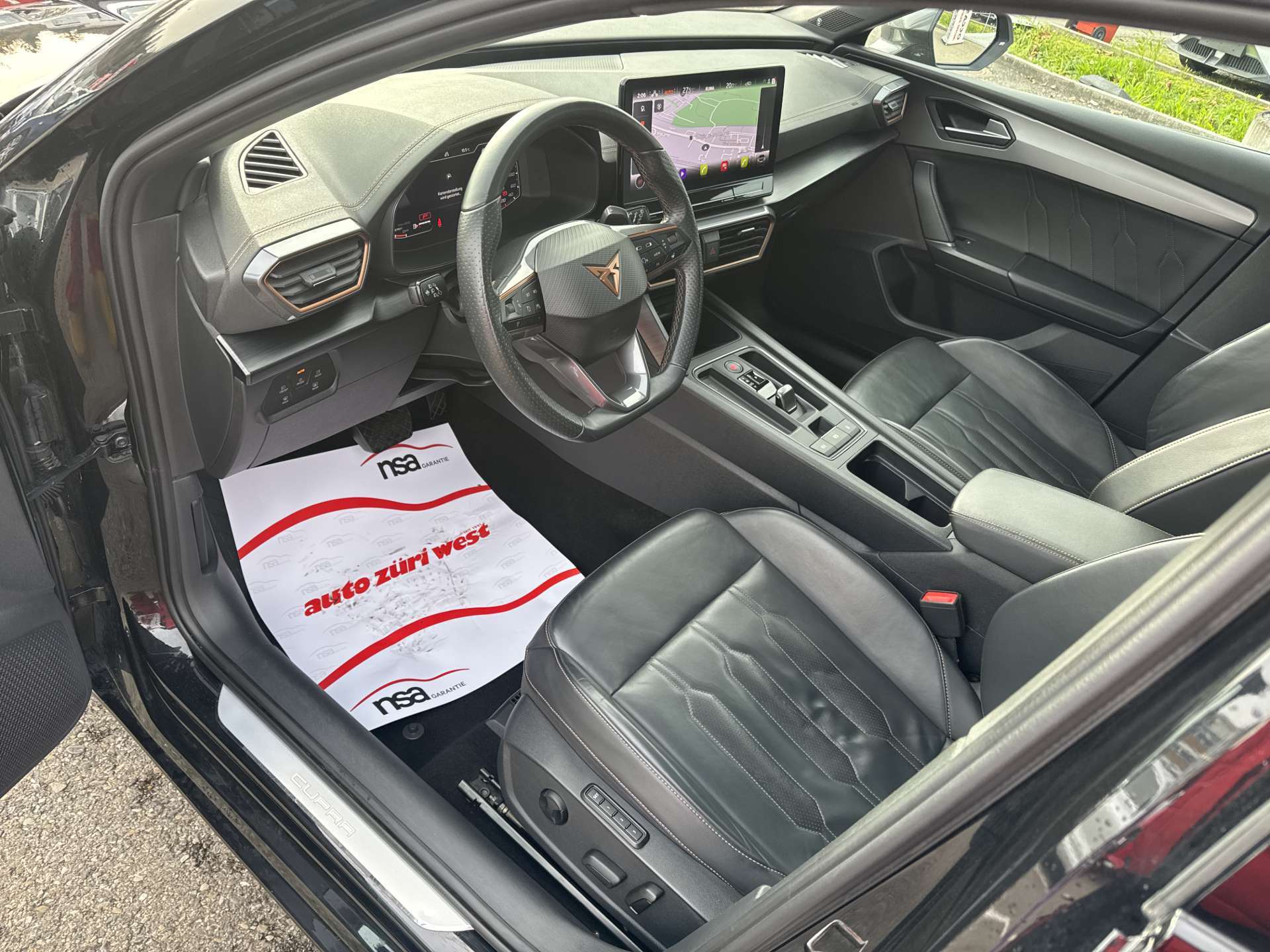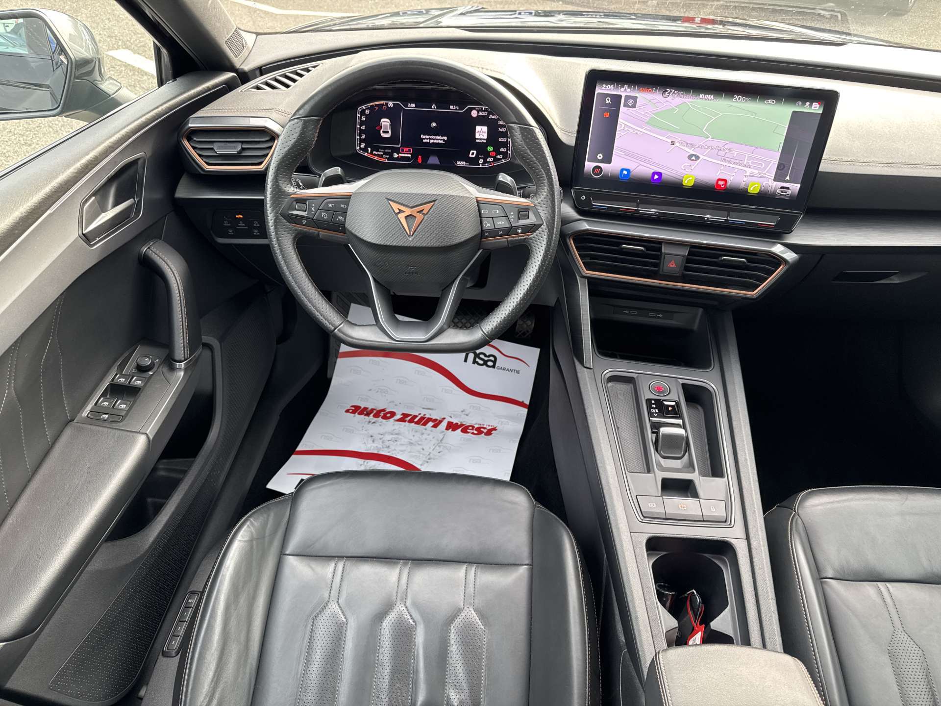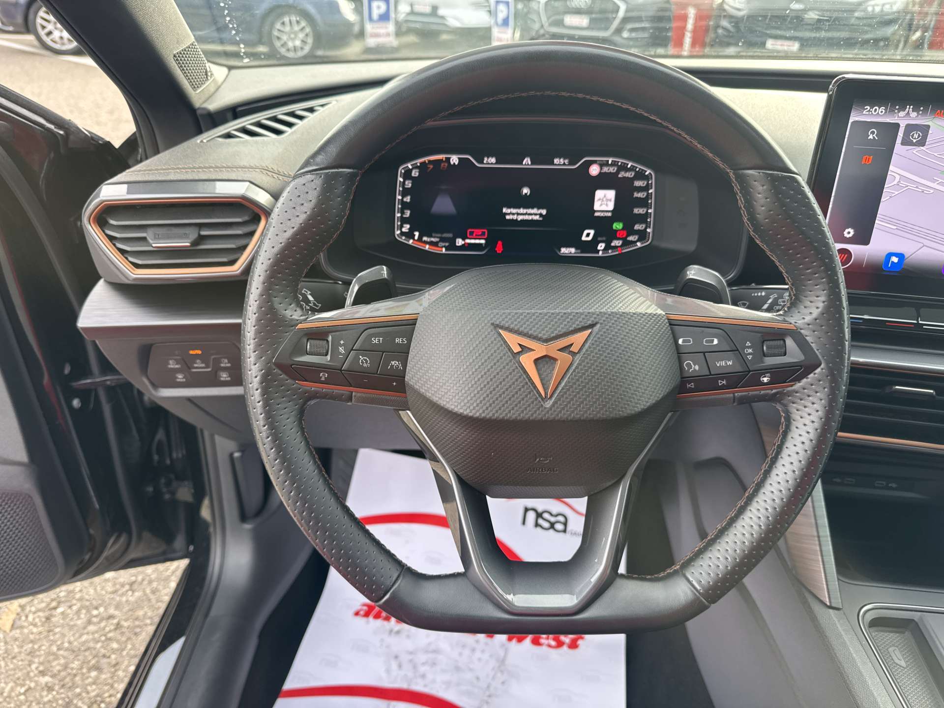 Abgedunkelte Scheiben ab B-Säule hinten, ABS, EBV elektronische Bremskraft-verteilung, Airbag: Airbag Beifahrer deaktivierbar, Airbag: Airbag Fahrer und Beifahrer, Airbag: Kopfairbags vorne und hinten, Airbag: Seitenairbags für Fahrer und Beifahrer, Airbag: Zentral Airbag, Assist: Einparkhilfe hinten, Assist: Elektronische Parkbremse mit Auto Hold Funktion, Assist: Lane assist (Spurhalteassistent), Assist: Multifunktionskamera, Assist: Multikollisionsbremse, Assist: PreCrash Sicherheitssystem, Assist: Speed limiter, Assist: Tempomat, Assist: Tiredness detection (Müdigkeitserkennung), Assist: Traction Control (TCS), deaktivierbar, Aussenspiegel elektrisch einstell-, beheiz- und einklappbar mit Beifahrerabsenkfunktion, Aussenspiegel in Cosmo Grey, Türgriffe in Wagenfarbe, Aussenspiegel mit LED-Blinker, Bremszangen vorne und hinten in Schwarz, CUPRA Drive Profile mit "driving experience button" Comfort, Sport, CUPRA, Individual, CUPRA-Heckspoiler, Dachhimmel schwarz, Dekor: Dekorblenden in Copper, Dreipunkt-Automatiksicherheitsgurte auf allen Plätzen, Elektrische Fensterheber vorne und hinten mit Komfortschaltung und Einklemmschutz, ESC mit EBA, DSR und Reifendruckkontrolle, Fahrwerk: Progressivlenkung, Fahrwerk: Vorderachs-Differenzialsperre, Full Digital Cockpit, Fussmatten vorne und hinten, Getriebe: 7-Gang-Sequentielle-Getriebe mit Automatikfunktion, Heckscheiben-Wisch-/Waschanlage mit Intervall, Heckscheibenheizung, Innenspiegel automatisch abblendbar, Kindersitzverankerung ISOFIX (äussere Plätze hinten), Klima: 3-Zonen Climatronic, Lackierung: Uni-Lackierung, LED-Innenraumbeleuchtung mit Ambientebeleuchtung"Monochrom", Lenkrad: Beheizbares Ledermultifunktionslenkrad mit Schaltwippen, Licht- und Regensensor, Licht: Coming Leaving Home Funktion, Licht: Drittes Bremslicht, Licht: Durchgehende Full LED-Heckleuchten, Licht: LED-Heckleuchten mit dynamischem Blinklicht, Licht: LED-Nebelscheinwerfer mit Cornering-Funktion, Licht: LED-Scheinwerfer für Abblend- und Fernlicht, Licht: LED-Tagfahrlicht, Licht: Leuchtweitenregulierung, Media: 10'' Infotainment (MIB3), Media: 2 USB C Anschlüsse hinten und vorne, Media: 6 Lautsprecher, Media: CUPRA Connect Safety & Services für Media System, Media: DAB+ (Digital Audio Broadcasting), Media: Mobiltelefon Freisprechanlage Bluetooth, Media: Sprachsteuerung, Mittelarmlehne vorne und hinten, Nebelschlussleuchte, Ottopartikelfilter, Parksensoren in Midnight Black, Pollenfilter (Staubfilter), Pyrotechnische Gurtstraffer und Gurtkraftbegrenzer, Räder: Alufelgen 7,5J x 18", "EXCLUSIVE" (225/40 R18), Räder: Reifendruck-Kontrollanzeige, Räder: Reifenreparatur-Set (Tire Fit), Schlüsselloses Schliess- und Startsystem (KESSY), Servolenkung mit geschwindigkeitsabhängiger Lenkkraftunterstützung, Sicherheitsgurtkontrolle für alle Sitze, Sitze: 2 verstellbare Kopfstützen vorne und 3 hinten, Sitze: CUPRA Sportsitze in "Sharp Textil schwarz", Sitze: Geteilt abklappbare Rücksitzlehne 1/3 - 2/3, Sitze: Kindersitzverankerung ISOFIX hinten, Sitze: Vordersitze höhenverstellbar, Sonnenblende Fahrer und Beifahrerseite, Stopp - Start- und Rekuperationssystem, Stossfänger in Sport-Optik mit Heckdiffusor in Wagenfarbe, Vollverzinkte Karosserie, Wärmeschutzverglasung, Wegfahrsperre elektronisch, Zentralverriegelung mit Funkfernbedienung, 2 Funkschlüssel, Zierleisten Seitenfenster in Schwarz Glanz, Zwei Abgasblenden