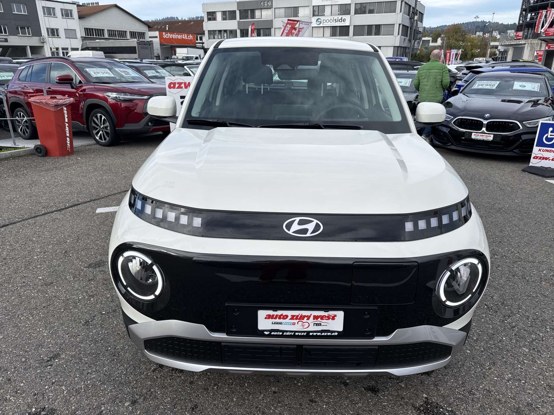 A-Säule in Wagenfarbe, Ablagefläche Fahrer- und Beifahrersitz (Rückseite), ABS mit elektronischer Bremskraftverteilung EBD, Airbag: Center Airbag vorne, Airbag: Deaktivierung Frontairbag Beifahrerseite, Airbag: Front- und Seitenairbags vorne, Vorhangairbags vorne und hinten, Assist: Anfahralarm Vorderfahrzeug, Assist: Aufmerksamkeitsassistent, Assist: Autobahn- und Stauassistent, Assist: Automatisches Notrufsystem eCall, Assist: Einparkhilfe hinten, Assist: Elektrische Parkbremse mit Auto-Hold-Funktion, Assist: Elektronische Traktionskontrolle, Assist: Notbremsassistent mit Abbiege-, Spurwechsel- und Ausweichfunktion, Assist: Notbremsassistent mit Fussgänger-/Fahrraderkennung und Abbiegefunktion, Assist: Rückfahrkamera, Assist: Spurhalteassistent, Assist: Tempomat mit Geschwindigkeitsbegrenzer, Drive Mode Select, Elektrisch einklappbare Aussenspiegel, Elektrisch verstell- und beheizbare Aussenspiegel, Elektronisches Stabilitätsprogramm ESP mit Multikollisionsbremse, Fensterheber vorne und hinten elektrisch, Garantie: 5 Jahre ohne Kilometerbegrenzung, Garantie: Garantie 12 Jahre gegen Durchrostung, Garantie: Hochvoltbatterie: 8 Jahre / 160 000 km, Gepäckraumbeleuchtung, Getriebe: Direktantrieb, kein Getriebe, Insassenalarm, ISOFIX-Kindersitzverankerung hinten, Klima: Klimaautomatik, Lackierung: Uni-Lackierung, Ladegerät (On-Board Charger) dreiphasig bis zu 11 kW, Ladekabel 5 Meter Mode 3 Typ 2, 3-Phasig, inkl. Hyundai-Tragtasche, Lenkrad: Audiofernbedienung am Lenkrad, Lenkrad: Lederlenkrad, Lenkrad: Lenkrad beheizbar, Lenkrad: Schaltwippen am Lenkrad mit i-Pedal Funktion, Licht: Fernlichtassistent, Licht: Halogen-Projektionsscheinwerfer, Licht: Halogen-Rückleuchten, Licht: LED Blinker, Licht: LED-Tagfahrlicht, Licht: Lichtautomatik, Make-up Spiegel Fahrer, Manuelle Heckklappe, Media: 4 Lautsprecher, Media: Android Auto - und Apple CarPlay -Funktion, Media: Digitale Armaturentafel mit 10.25'' TFT LCD Anzeige, Media: Digitalradio DAB+, Media: MapCare Lifetime / Over-the-Air Update, Media: Multi-Bluetooth mit Freisprecheinrichtung mit Spracherkennung, Media: Navigationssystem mit 10.25" Touchscreen, Media: Telematikdienst Bluelink Lite (10 Jahre gratis), Media: USB- Anschlüsse vorne, Polster: Stoffsitze, Räder: Reifendruckkontrollsystem, Räder: Reifenreparatur-Set, Räder: Stahlfelgen 15" mit Radzierblenden, Radlaufverkleidung in Schwarz, Servolenkung, Shift by wire, Sitze: Flach umklappbarer Fahrer- und Beifahrersitz, Sitze: Manuell höhenverstellbarer Fahrersitz, Sitze: Rücksitze getrennt abklappbar (50/50), Sitze: Sitzheizung vorne, Smart Key mit Engine Start/Stop-Taste und Bewegungssensor, Türgriffe und Aussenspiegel in Wagenfarbe, Unterfahrschutz silber, Vorbereitung für Anhängevorrichtung, Wärmedämmende Scheiben vorne, Zentralverriegelung