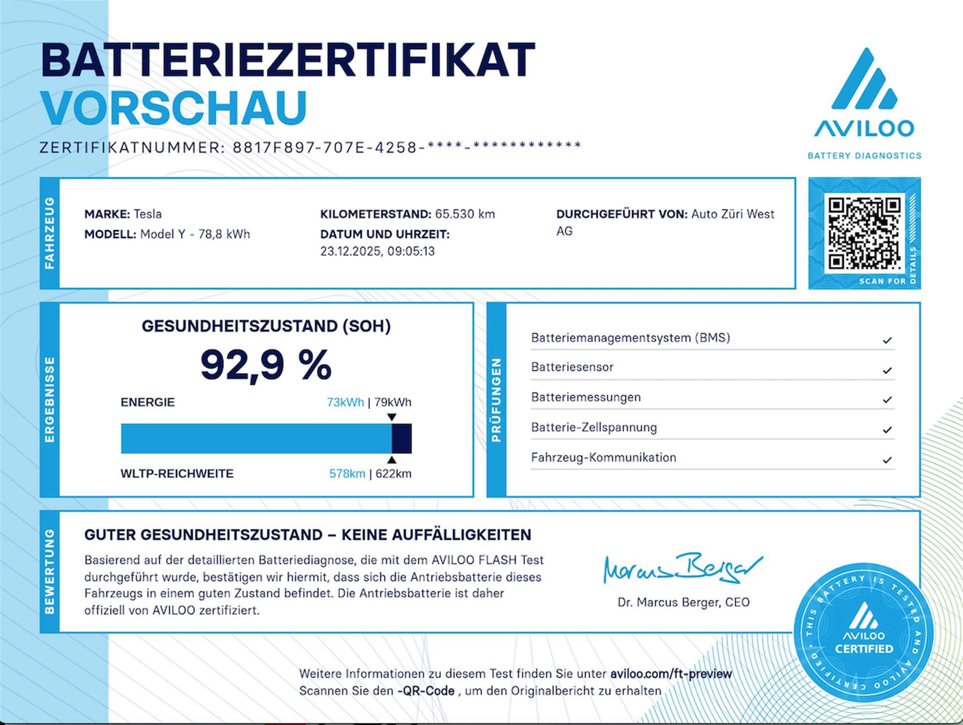 | Garantie | Tesla Garantie 4 Jahre oder 80’000km! 8 Jahre oder 192’000km auf Elektroantriebssystem und Batterie |