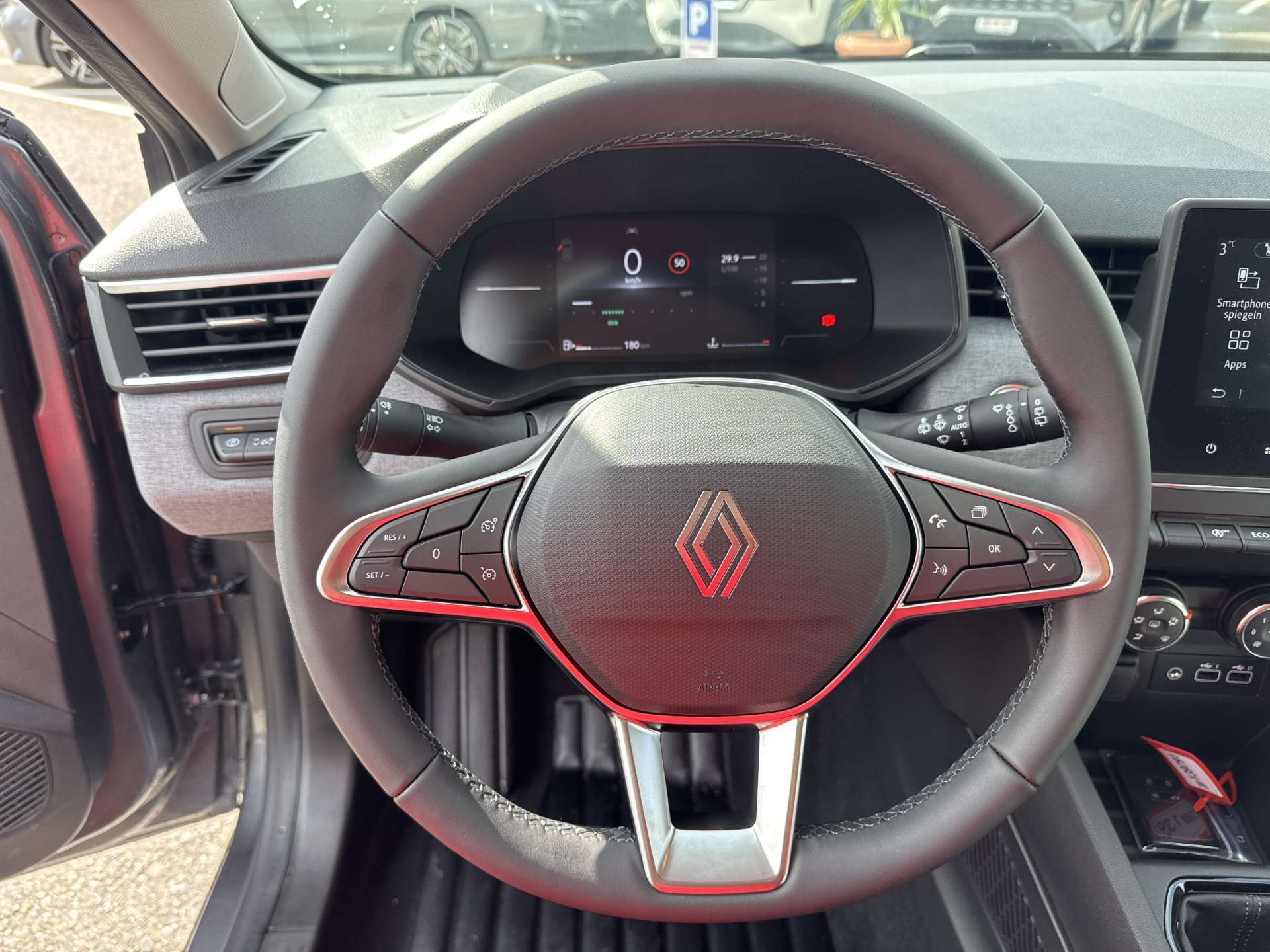 Airbag: Autoadaptiver Fahrer- und Beifahrerairbag, Airbag: Seitenairbags vorne, Assist: Antiblockiersystem (ABS), Assist: Automatische Notfallbremsfunktion, Assist: Einparkhilfe hinten, Assist: Elektronisches Stabilitätsprogramm (ESC), Assist: Müdigkeitserkennung und -warner, Assist: Renault automatischer Notruf (112), Assist: Sicherheitsabstands-Warner, Assist: Spurhalteassistent, Assist: Tempomat mit Geschwindigkeitsbegrenzer, Assist: Verkehrszeichenerkennung mit Geschwindigkeitsanpassung und -warner, Aussenspiegel elektrisch verstellbar und beheizbar, Aussenspiegel in schwarz, Automatisches Einschalten der Scheinwerfer, Connected services MyRenault App, Dekor: Innenharmonie Grau, Elektrische Fensterheber hinten, Elektrische Fensterheber vorne, Getriebe: 6-Gang-Getriebe, Klima: Manuelle Klimaanlage mit Antipollen-Filter, Lackierung: Spezielle Metallic-Lackierung Orange Valencia, Lenkrad: Lenkrad Kunstleder, Licht: LED-Rückleuchten, Licht: LED-Scheinwerfer mit Lichtsignature in Halb-Rhombus Form, Licht: LED-Tagesfahrlicht und Blinker, Media: Digitale Instrumententafel 7-Zoll, Media: EASY LINK Multimediasystem 7'', Media: Kabellose Smartphone-Replikation Apple CarPlay und Android Auto, Polster: Stoffsitzbezug Twida, Räder: 16''-Stahlfelgen "Amicitia", Räder: Reifendruck-Kontrollanzeige, Räder: Reifenreparatur-Kit, Servolenkung, Sitze: Fahrersitz manuell verstellbar, Sitze: ISOFIX, Start/Stop-Funktion, Wegfahrsperre elektronisch, Zentralverriegelung
