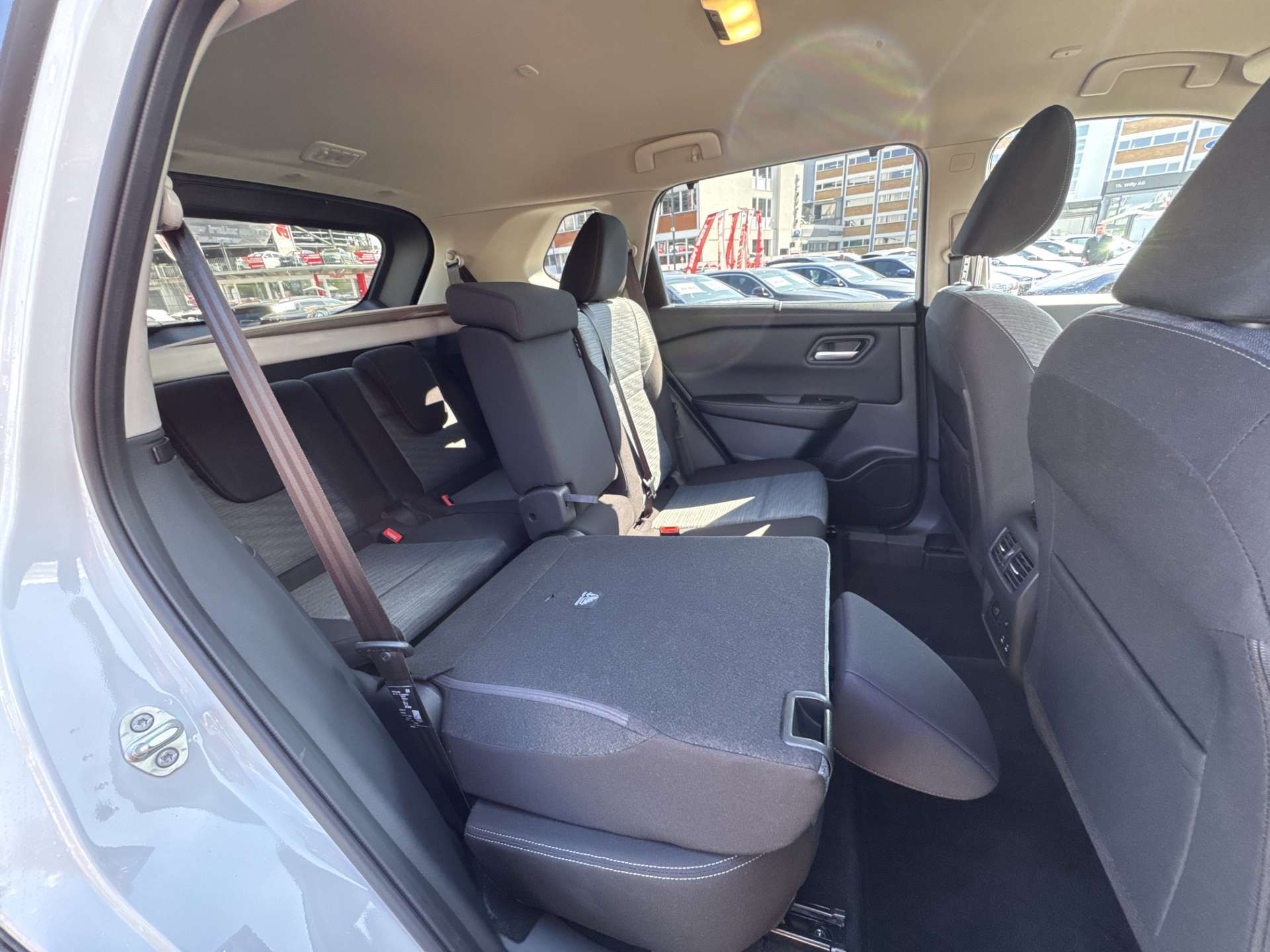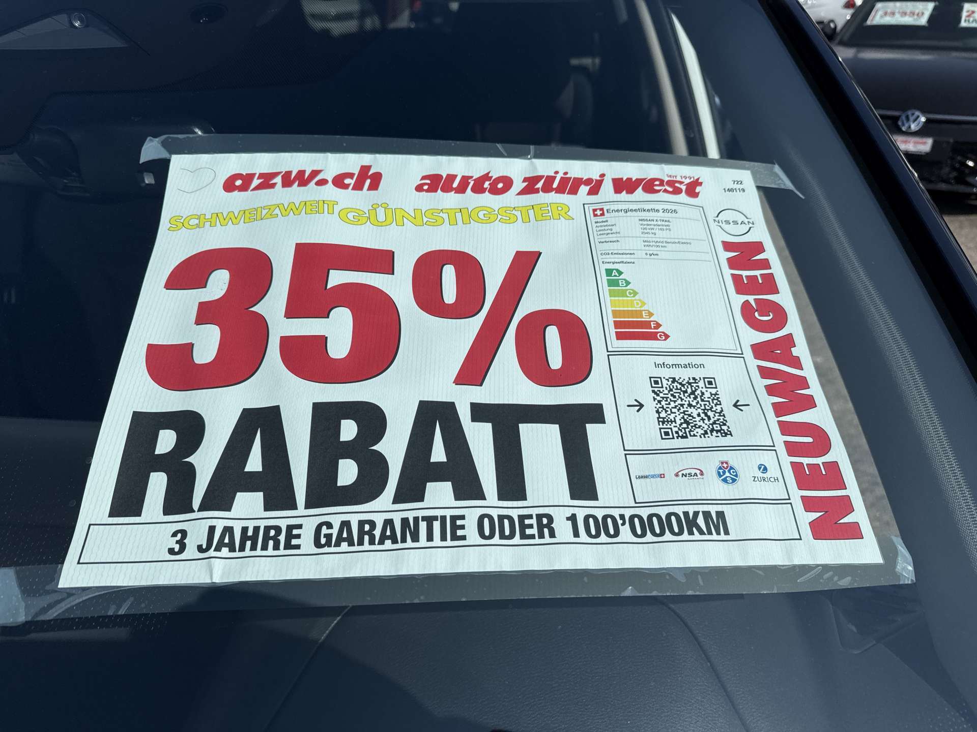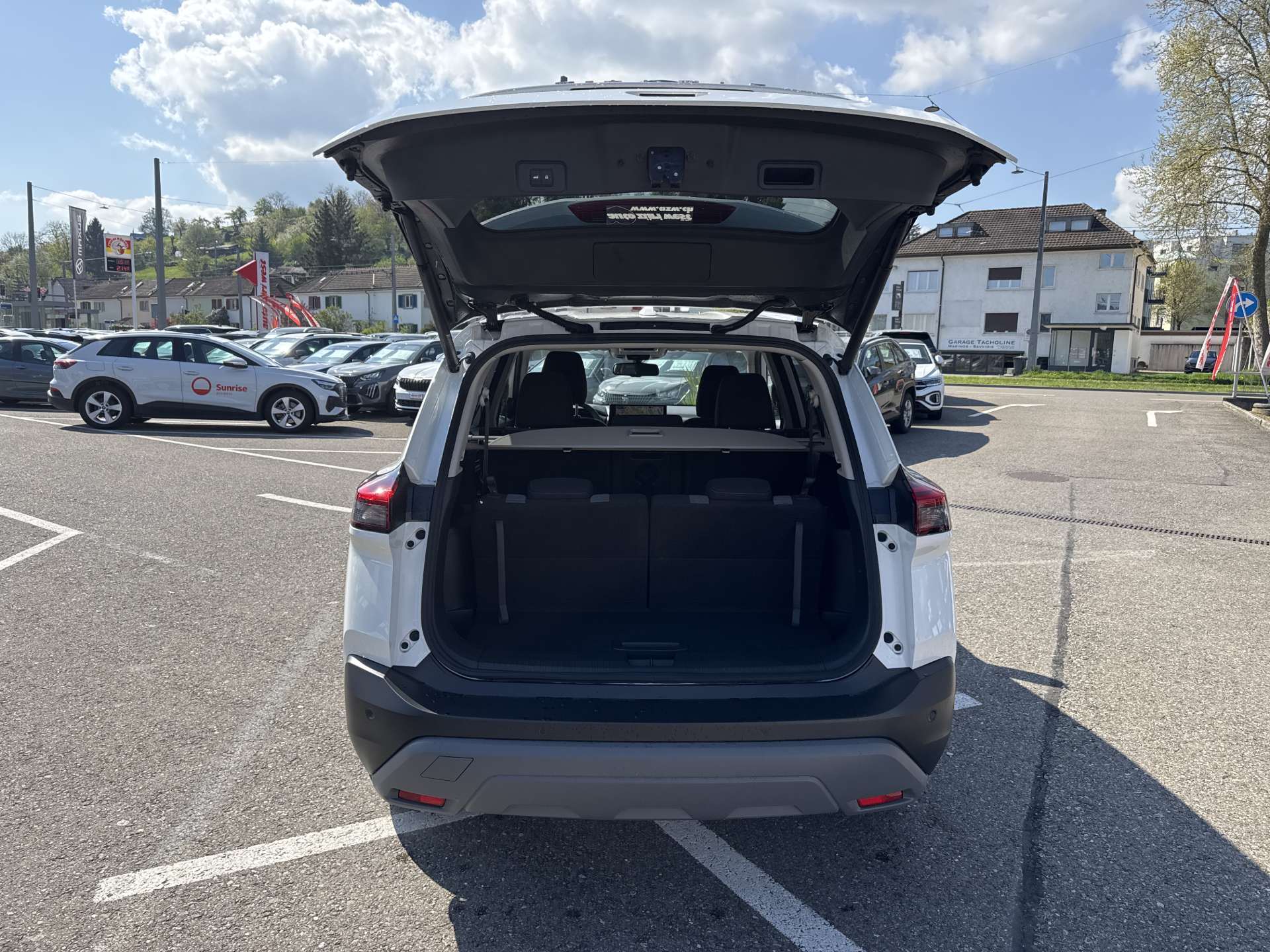 12-Volt-Steckdose vorne, 3-Punkt-Sicherheitsgurte auf allen Plätzen, 6 Verzurrösen im Kofferraum, Ablagen in den Türen, Airbag: Fahrer- und Beifahrerairbag, Kopfairbags und Seitenairbags vorne, Airbag: Zentralairbag, Ambientebeleuchtung für Mittelkonsole, Antiblockiersystem (ABS) mit elektronischer Bremskraftverteilung (EBD), Assist: 360°- Rundumsichtkamera, Assist: Adaptiver Geschwindigkeits- und Abstandsassistent, Assist: Aufmerksamkeitsassistent, Assist: Automatisches Aufleuchten der Warnblinkanlage bei starkem Bremsvorgang, Assist: Berganfahrassistent, Assist: eCall-Notrufsystem, Assist: Elektronische Parkbremse (e-PKB) mit automatischer Deaktivierung beim Anfahren, Assist: Frontkollisionswarnung, Assist: Intelligenter autonomer Notbrems-Assistent hinten -, Assist: Intelligenter Spurhalte-Assistent aktiv mit korrigierendem Bremseingriff, Assist: Manueller Geschwindigkeitsbegrenzer, Assist: Parksensoren hinten, Assist: Parksensoren vorne, Assist: Querverkehrswarner vorne mit Fussgänger- und Velofahrer Erkennung und Kreuzungsassistent, Assist: Querverkehrswarner, hinten, Assist: Rückfahrkamera in Farbe mit Reinigungsanlage, Assist: Spurverlassenswarnung, Assist: Traction Control (TCS), Assist: Verkehrszeichenerkennung, Assist: Visueller Totwinkel-Warner und aktiver Totwinkel-Assistent, Aussenspiegel rechts und links beheizt, elektrisch verstell- / und einklappbar, Beide Make up-Spiegel beleuchtet, Beleuchtetes Handschuhfach, Brillenfach, Dachhaltegriffe und 2 Kleiderhaken hinten, Dachreling silber, Dekor: "schwebende" Mittelkonsole mit "Schmetterlings"-Deckel, Differenzial mit begrenztem Schlupf, Dunkel getönte Seitenscheiben hinten, Elektrische Fensterheber vorne und hinten mit Auf-/Abwärts Automatik, Elektronisches Stabilitäts-Programm (ESP), Fahrmodi: Standard, Sport, Eco, Snow, Off-Road, Flexi-Board: Kofferraumboden einteilig, Frontscheibenheizung, Getränkehalter, 2 vorne, Getriebe: Direktantrieb, kein Getriebe, Gurtstraffer für Sicherheitsgurte und Warnton für nicht angelegte Sicherheitsgurte, Heckklappe elektrisch sensorgesteuert, Heckscheiben-Wisch-/Waschanlage, Heckscheibenheizung, Induktives Smartphone-Ladegerät, Innenbeleuchtung, Innenspiegel automatisch abblendbar, Intelligent Key: Schlüsselloses Zugangs- und Startsystem, ISOFIX-Kindersitz-Befestigungspunkte auf den hinteren Sitzplätzen inkl. Top-Tether, Klima: 2-Zonen-Klimaautomatik, inkl. Pollenfilter, Kofferraumabdeckung, Lackierung: Uni-Lackierung, Lenkrad: Lenkrad aus Leder, Lenkrad: Lenkrad beheizbar, Lenkrad: Lenkrad längs- und höhenverstellbar, Lenkrad: Multifunktionslenkrad, Licht: Dritte Bremsleuchte, Licht: Fahrlichtautomatik, Licht: Fernlicht-Assistent, Licht: LED-Rückleuchten, Licht: LED-Scheinwerfer, Licht: LED-Tagfahrlicht, Licht: Nebelschlussleuchte, Media: Apple CarPlay und Android Auto kabellos, Media: Audiosystem mit 6 Lautsprechern, Media: Bluetooth-Schnittstelle, Media: Haifischantenne, Media: Navigationssystem mit 12.3"-Touchscreen, Media: NissanConnect Services, Media: USB-Port Typ A vorne, Media: USB-Port Typ C (einer vorne,zwei hinten), Polster: Stoff, Räder: 18"-Leichtmetallfelgen, Räder: Reifendruck-Kontrollsystem (TPMS), Räder: Reifenreparatur-Set, Regensensor für Scheibenwischer vorne, Servolenkung, Sitze: 3. Sitzreihe (7 Sitze): geteilt (50:50) umklappbar, Sitze: Beheizbare Vorder- und Rücksitze der 2. Sitzreihe, Sitze: Beifahrersitz manuell höhenverstellbar, Sitze: Fahrer- und Beifahrersitz manuell einstellbar, Sitze: Fahrersitz mit Lendenwirbelstütze elektrisch einstellbar, Sitze: Kopfstützen auf allen Plätzen, manuell einstellbar, Sitze: Manuelle Lendenwirbelstütze für Beifahrersitz, Sitze: Mittelarmlehne hinten mit 2 Getränkehaltern, Sitze: Rücksitzbank asymmetrisch (60:40) umklappbar, Sonnenblenden mit Make-Up-Spiegel auf Fahrer- und Beifahrerseite, Sonnenstoren in den hinteren Seitentüren, Start-/Stop-Knopf, Tankstutzen mit Easy-Fill-Funktion, Taschen an der Rückseite der Vordersitze, Türgriffe mit Touch-Sensor, Wegfahrsperre elektronisch, Zentralverriegelung