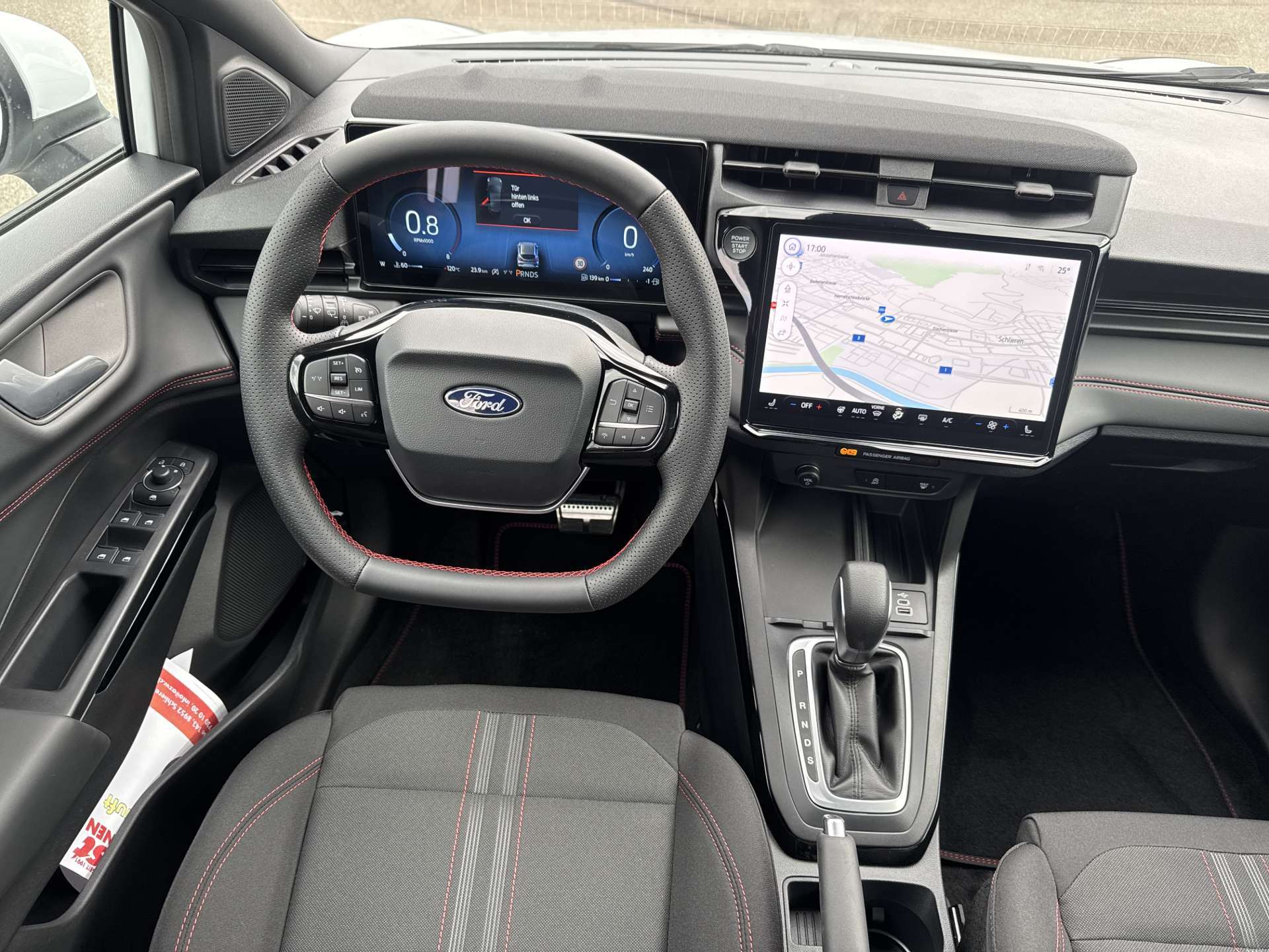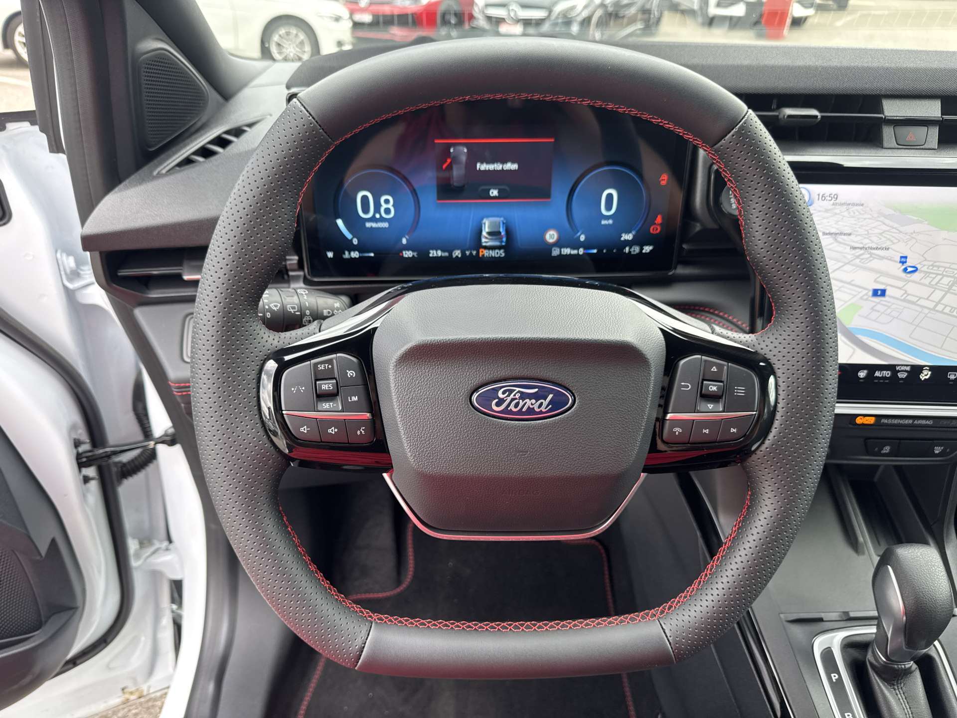 12-Volt-Anschluss hinter der Mittelkonsole vorn für die 2. Sitzreihe und im Kofferraum, 3-Punkt-Sicherheitsgurte auf allen Plätzen, Airbag: Kopf-Schulterairbags vorn und hinten, Ambientebeleuchtung vorn inkl. Armaturenbrett, Vordertürablage-,, Antiblockier-Bremssystem (ABS), Assist: Fahrspur-Assistent, Assist: Falschfahrer-Warnfuntion, Assist: Geschwindigkeitsregelanlage und intelligenter Geschwindigkeitsbegrenzer mit Tempolimit-Anze, Assist: Müdigkeitswarner, Assist: Park-Pilot System hinten, Assist: Pre-Collision-Assist, Assist: Rückfahrkamera, Assist: Verkehrsschild-Erkennungssystem, Aussenspiegel in Wagenfarbe lackiert, elektrisch einstellbar, beheizbar, Body-Styling-Kit ST-Line / ST-Line X, Dachhimmel aus Webstoff, Anthrazit, Dekor: Armaturenbrett teilweise mit Kunstlederbezug, Einstiegszierleisten vorn, ST-Line-Design, Elektronisches Stabilitäts-Programm (ESP), Fahrwerk: Selektiver Fahrmodus-Schalter, Fahrwerk: Sportlich abgestimmtes Fahrwerk, Fensterheber vorn und hinten elektrisch mit Gesamtschließungsfunktion bzw mit Quickdown-Schaltung, Ford EcoCoach (Effizienzanzeige für umweltschonende Fahrweise), Ford MegaBox, Ford Power-Startfunktion (schlüsselfreies Starten), Frontscheibe, Akustik-Verbundglas, Garantie: Ford Garantie 2 Jahre Werksgarantie, Getriebe: 7-Gang-Automatikgetriebe, Heckscheiben-Wisch-/Waschanlage, Heckscheibenheizung, Innenspiegel automatisch abblendbar, Intelligentes Sicherheits-System (IPS - Intelligent Protection System), Klima: Klimaanlage mit automatischer Temperaturkontrolle, Kopfstützen vorn (2) und Kopfstützen hinten (3), höhenverstellbar, Lackierung: Frozen White, Lenkrad: Lenkrad, Sensico in Leder-Optik, perforiert, Licht: Drittes Bremslicht, Licht: LED Heckleuchten, Licht: LED-Scheinwerfer inkl. Scheinwerfer-Assistent mit Tag/ Nacht Sensor, Licht: Nebelschlussleuchte, Licht: Scheinwerfer, automatisch höhenverstellbar, Media: 2 USB Anschlüsse vorn unter dem Armaturenbrett (1x Typ-A/ 1x Typ-C), Media: 5G Modem, Media: Ford SYNC 4 mit AppLink, 12"-Touchscreen (30.5 cm Bildschirmdiagonale), Mittelkonsole vorn mit 2 Getränkehaltern, 12-Volt-Anschluss, integrierter Armauflage und Ablagefäche, Pedalerie mit Aluminiumauflage, Polster: Stoffpolsterung in Anthrazit mit Ziernähten in Rot, Räder: Leichtmetallräder 7 J x 17 mit 215/55 R17 Reifen, Räder: Reifendruckkontrollsystem, Räder: Reifenreparatur-Set (Tire Fit), Räder: Umweltfreundliches Reifenprofil, Scheibenbremsen vorn, innenbelüftet, und Trommelbremsen hinten, Scheibenwischer mit Regensensor, Seitenscheiben ab 2. Sitzreihe und Heckscheibe, dunkel getönt, Servolenkung, Sitze: Beifahrersitz, 2-fach einstellbar, Sitze: Fahrersitz mit Lendenwirbelstütze, Sitze: Fahrersitz, manuell höhenverstellbar, Sitze: ISOFIX-Halterung an den äusseren Sitzplätzen der 2. Sitzreihe, Teppichfussmatten vorn, Variabler Kühlerlufteinlass, Wegfahrsperre elektronisch, Zentralverriegelung mit Fernbedienung